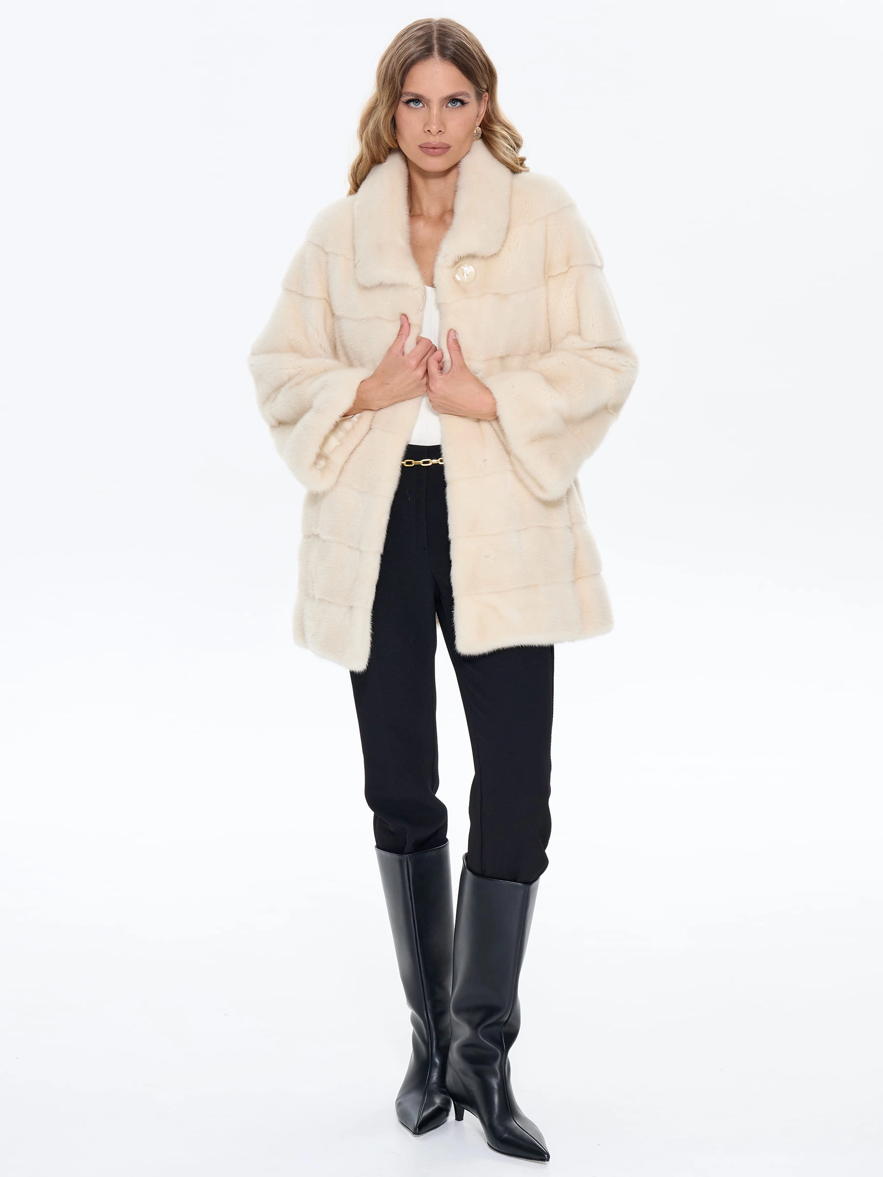 Элегантная короткая шубка из белоснежной норки воплощает зимнюю роскошь, представляя густой шелковистый мех с поперечной раскладкой шкурок, который создает эффект мерцающего снега и переливается при движении. Прямой силуэт обеспечивает свободу и комфорт в автомобиле и на прогулке, а укороченный крой, закрывающий бедра, подчеркивает стройность фигуры. Объемный воротник-стойка с мягкими складками защищает от ветра и добавляет образу воздушности, в то время как шелковая подкладка с антистатической пропиткой обеспечивает нежное прикосновение к коже и дополнительное тепло. Магнитные застежки бережно фиксируют мех, сохраняя его безупречный вид, делая эту шубку идеальным сочетанием с кожаными юбками, вязаными платьями-миди и объемными свитерами, превращая ее не просто в теплую вещь, а в главный акцент зимнего гардероба, требующий особого ухода за чистым белым цветом.