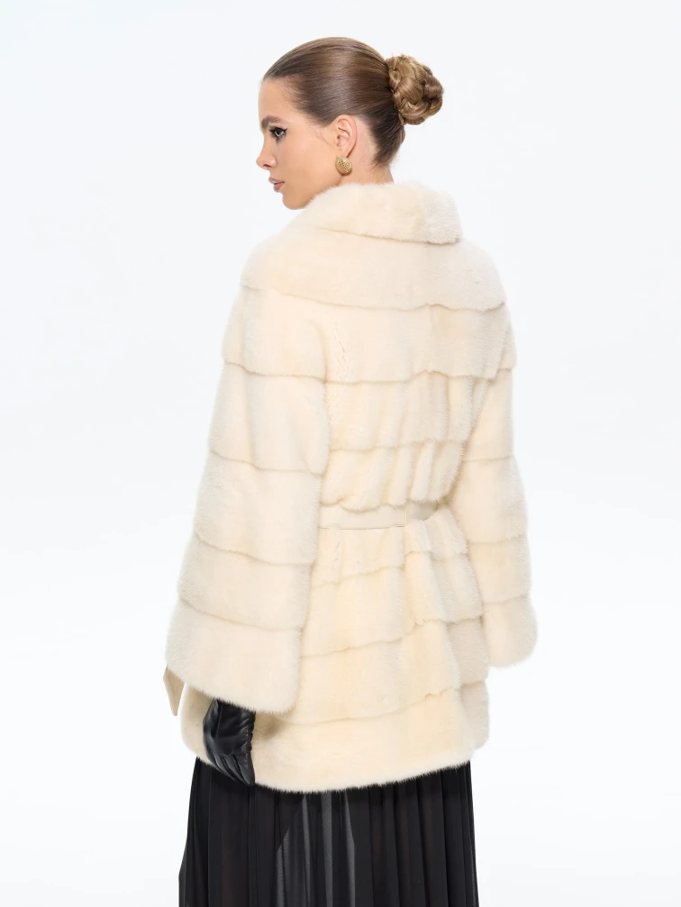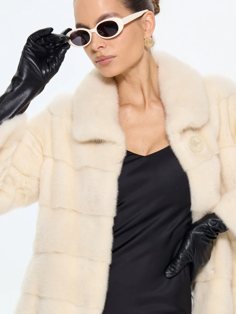 Короткую шубку в бежевом цвете выполнили из густой шелковистой норки. Поперечная раскладка шкурок придает меху глубину и игру света, повышает износостойкость. Прямой силуэт идеален для активной жизни: не сковывает движения в авто, метро, при прогулках. Укороченная длина изделия закрывает бедра. Отложной лаконичный воротник с мягкими линиями: подчёркивает шею, сочетается с шарфами и объемными аксессуарами. Вискозная подкладка – гипоаллергенная, шелковистая на ощупь, предотвращает статическое электричество и добавляет комфорта. Клипсы-застёжки – не повреждают мех, сохраняют чистоту линий, легко фиксируются даже в перчатках. Теплое и лёгкое меховое изделие с классическим кроем, прекрасно сохраняет тепло в морозную погоду- не утяжеляя образ. Модель легко комбинируется с кожаными брюками, платьями-миди, джинсами и oversize-свитерами.