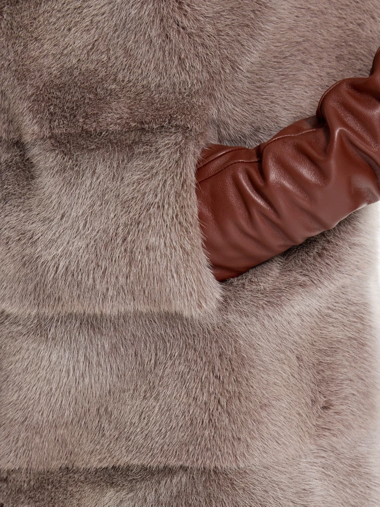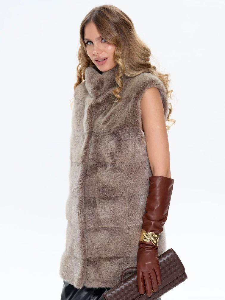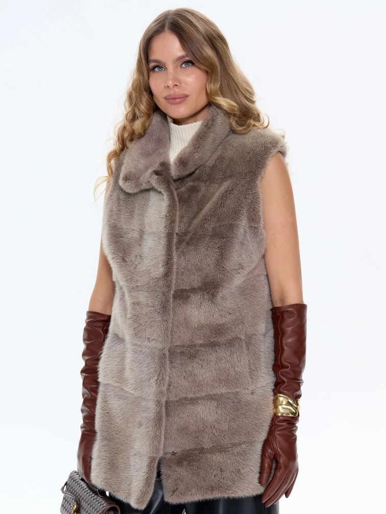 Элегантный длинный жилет из меха норки бежевого оттенка выполнен в классическом прямом силуэте с поперечной раскладкой меха и аккуратным воротником-стойкой. Модель с врезными карманами и длиной 75 см воплощает утонченную роскошь и универсальность. Рекомендация стилиста: сочетайте с водолазкой и кюлотами для дневного образа или накиньте поверх платья-миди с высокими сапогами для вечернего выхода. Этот жилет станет жемчужиной гардероба, добавляя образу безупречный шарм и благородную эстетику.