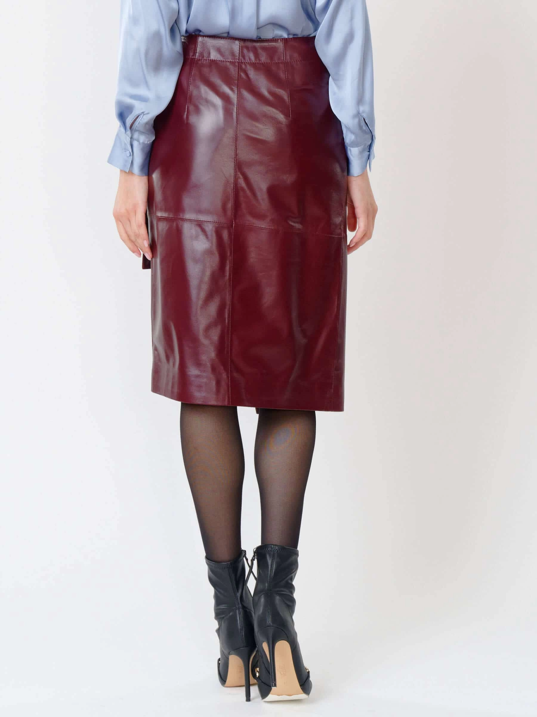 Бордовая кожаная юбка миди 07, размер 42, артикул 85420