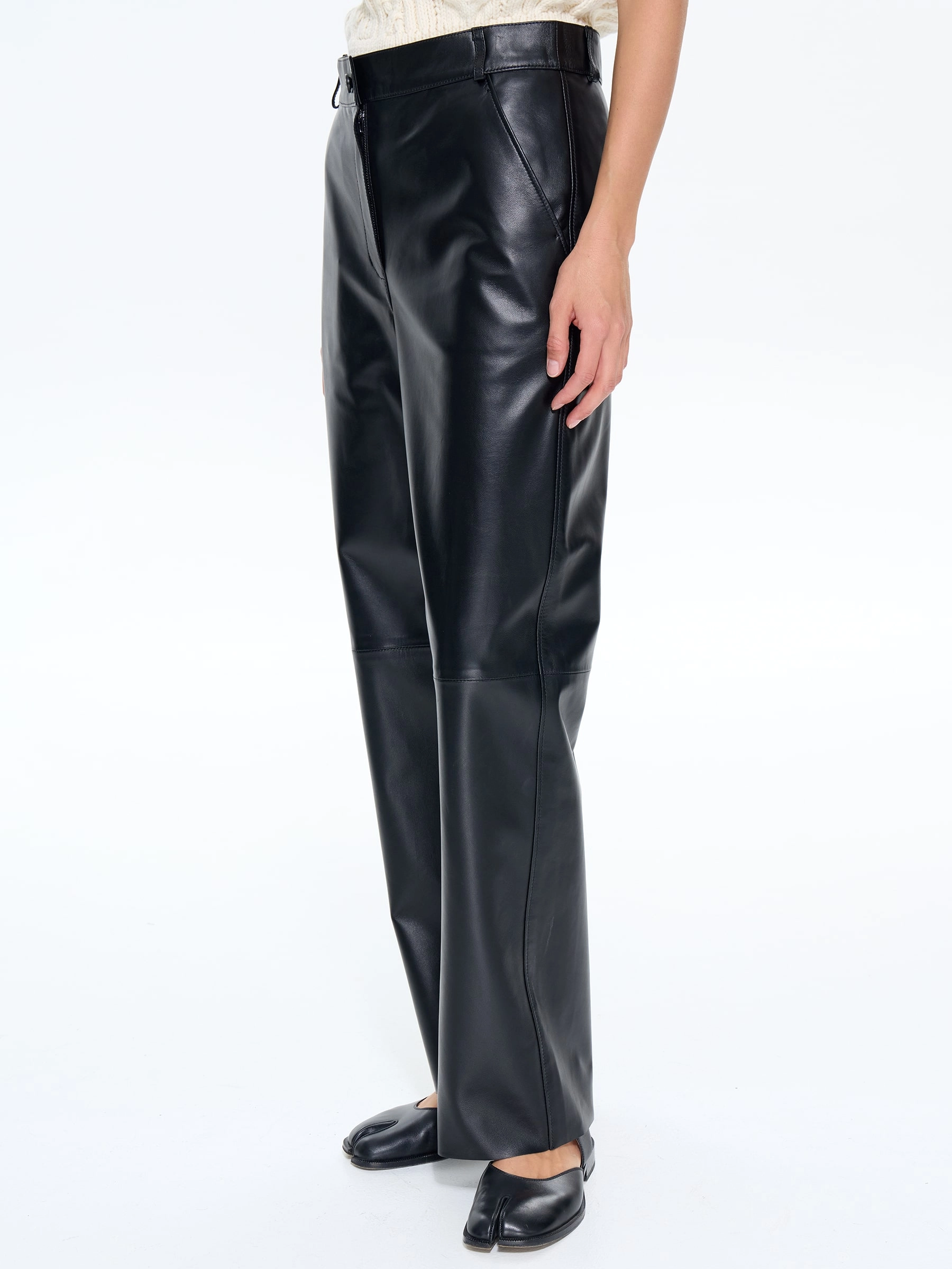 Классические женские брюки из натуральной черной кожи премиум-качества – универсальная основа для создания стильных образов. Завышенная талия визуально удлиняет ноги и подчеркивает силуэт, а прямой крой со свободным облеганием в области бедер и коленей обеспечивает комфорт без эффекта «мешка». Практичность модели дополняют четыре функциональных кармана. Брюки легко комбинируются с разной обувью: от кроссовок и балеток до босоножек и ботильонов. Застежка-молния завершает лаконичный дизайн