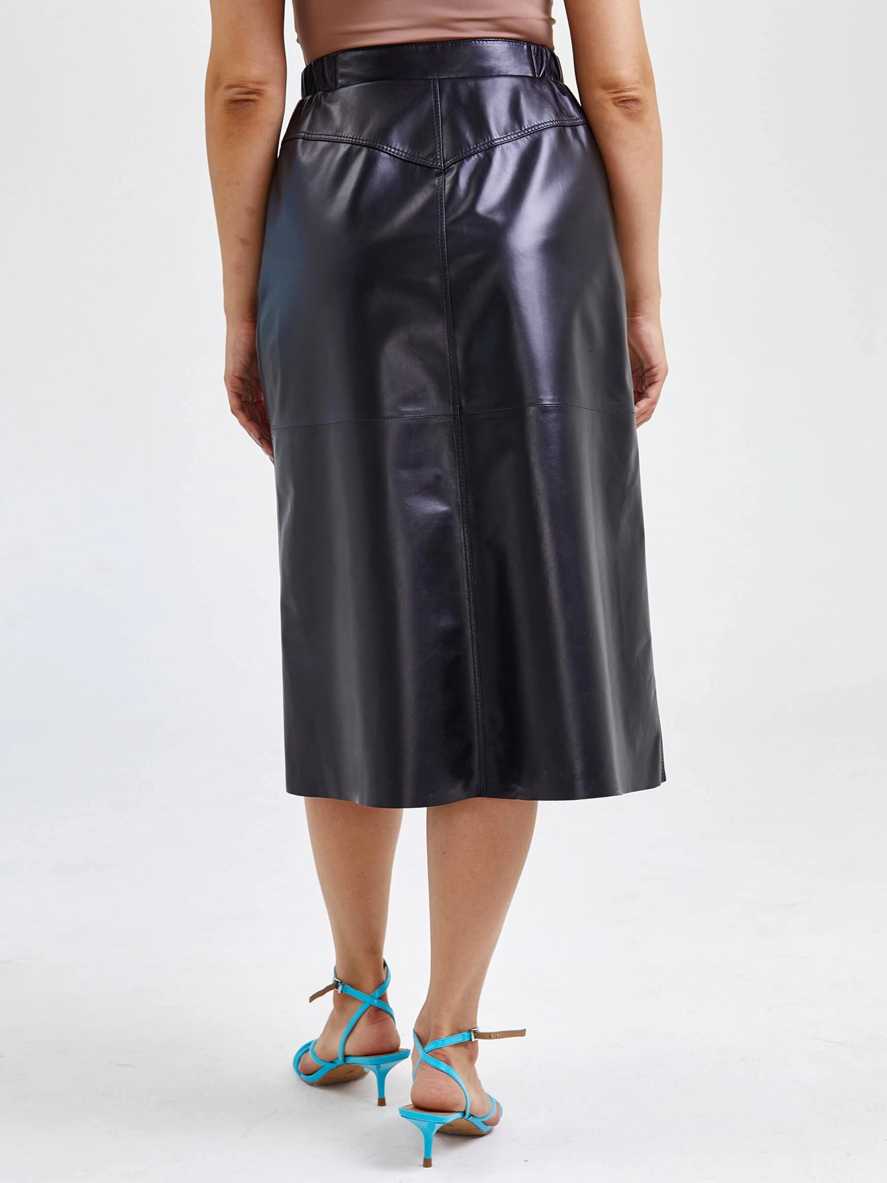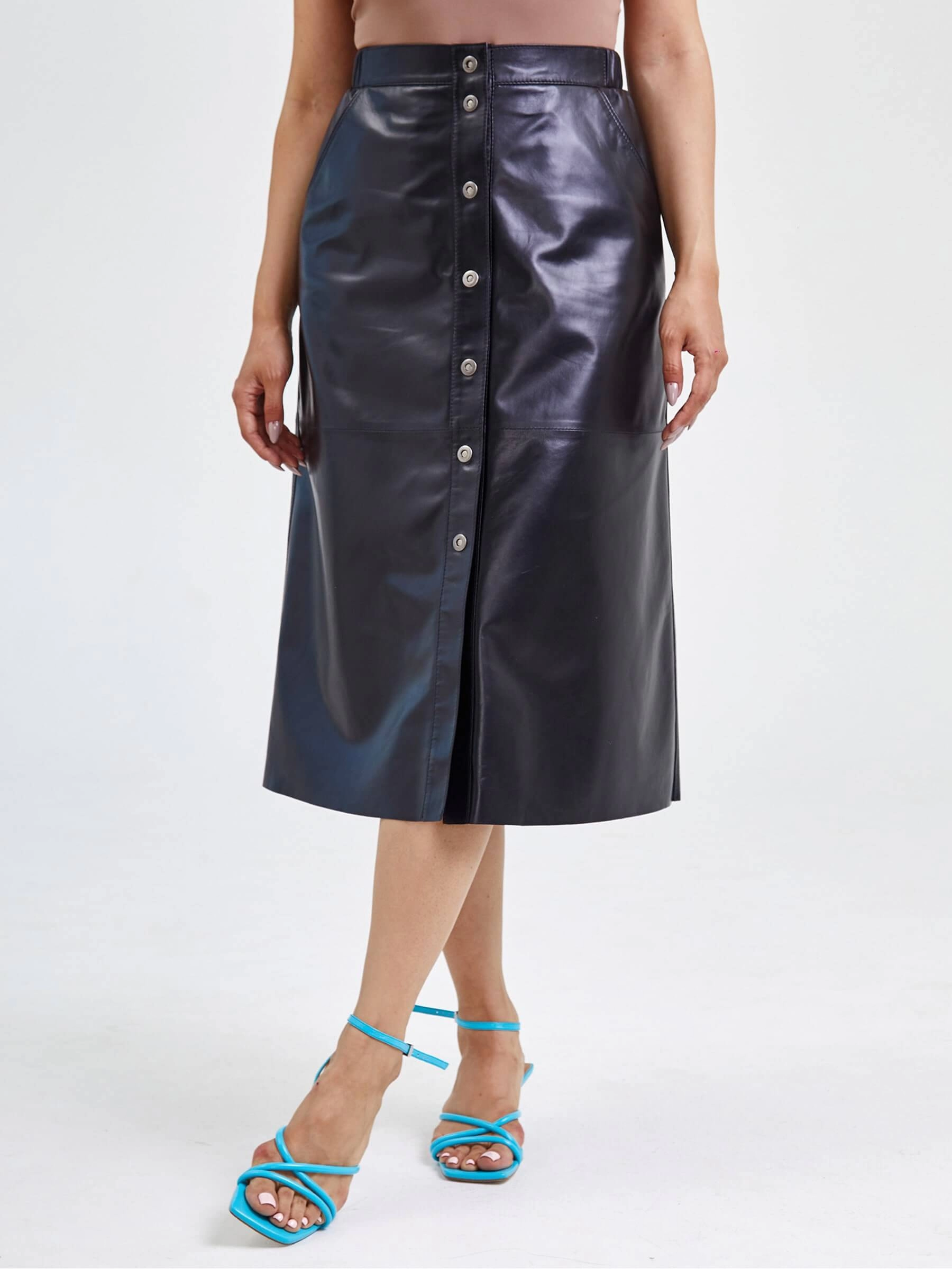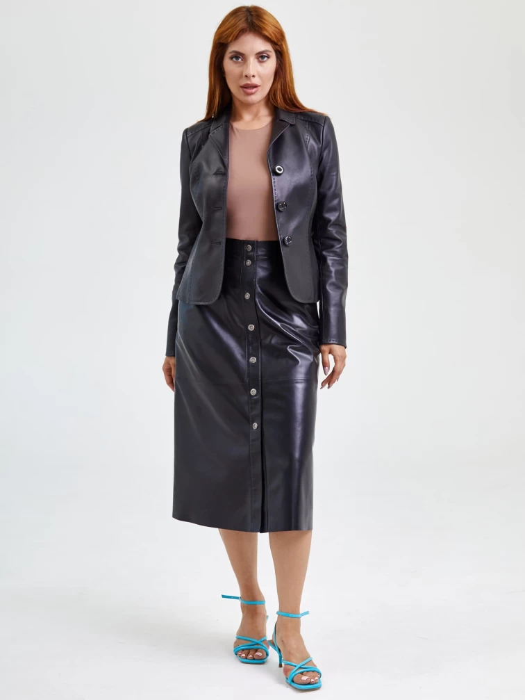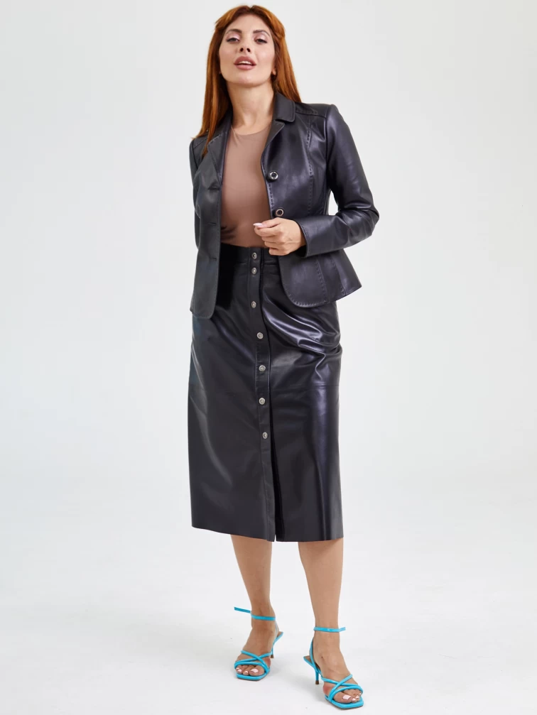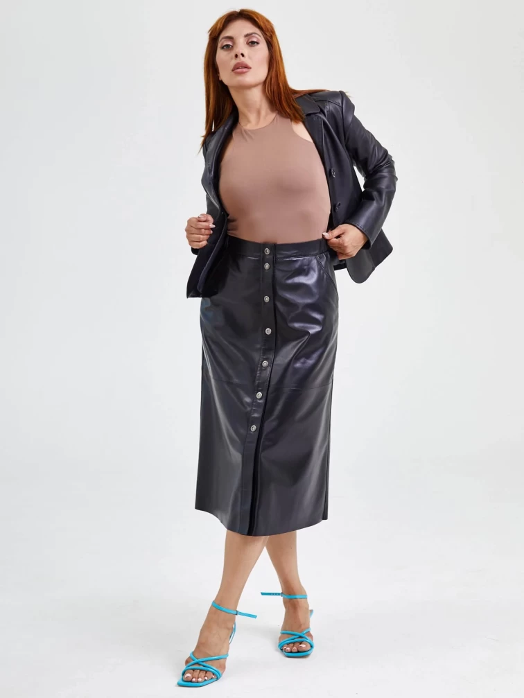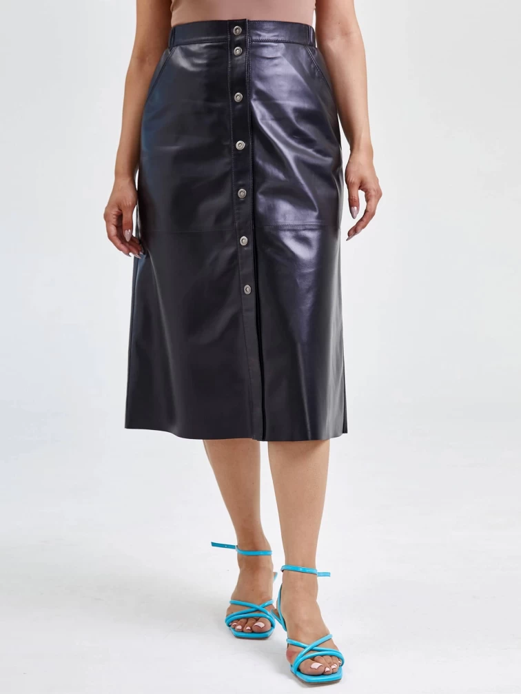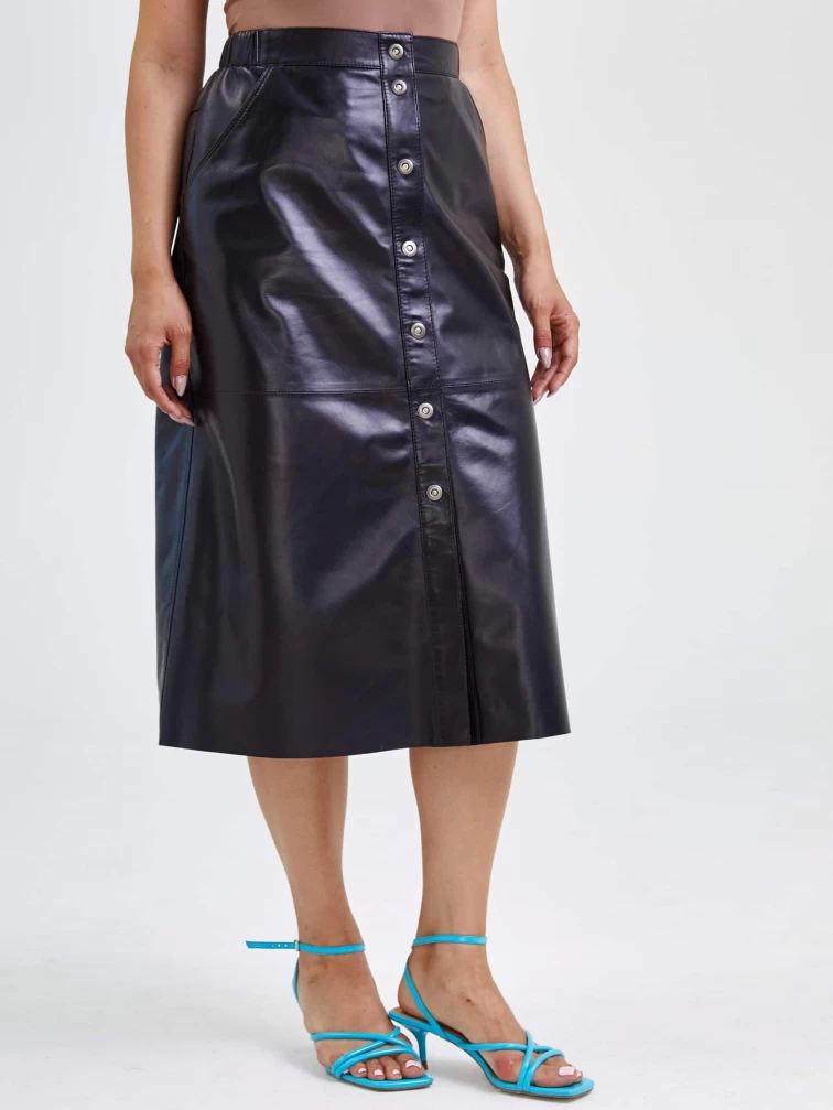 Элегантная длинная юбка из натуральной кожи длиной 80 см с расклешенным силуэтом на кнопках сочетает безупречную посадку с благородной фактурой природного материала. Мягкая кожа глубокого черного оттенка создает универсальную основу для любых образов — от лаконичных ансамблей с водолазками и объемными свитерами до смелых сочетаний с кожаными косухами. Особенность натуральной кожи проявляется в ее податливой пластичности и изысканном блеске: дополняйте образ ботильонами или сапогами на каблуке с металлическими деталями для офиса, вечера или городских прогулок. Этот кожаный крой легко трансформируется от строгой элегантности к дерзкому уличному стилю, демонстрируя все преимущества натурального материала — от комфорта в носке до статусного внешнего вида.