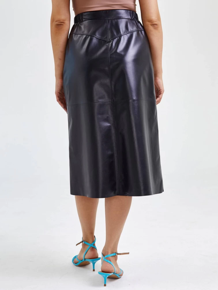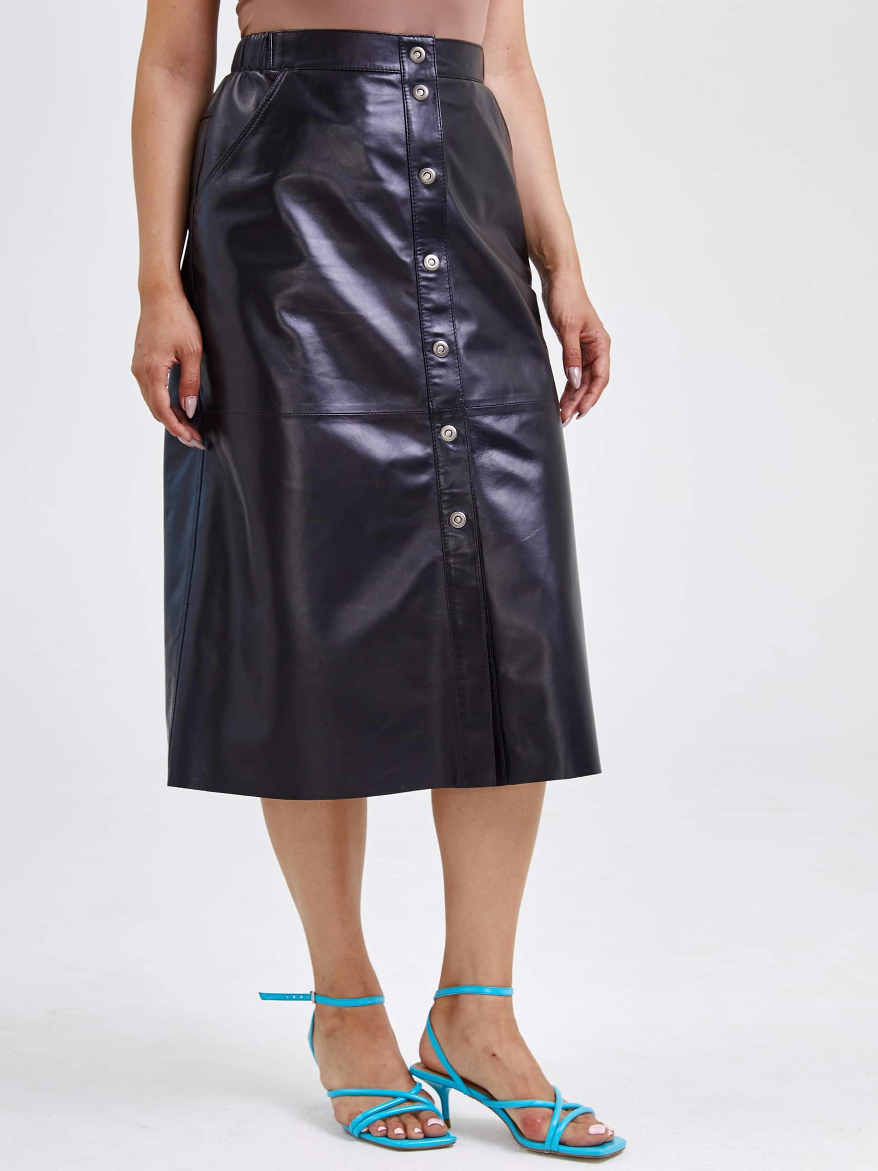 Товар черная кожаная юбка 08, размер 44, артикул 85551 выполнен из натуральной кожи с застежкой кнопки. Рассчитан на сезон: демисезон. Длина изделия 80 см, силуэт расклешенный.