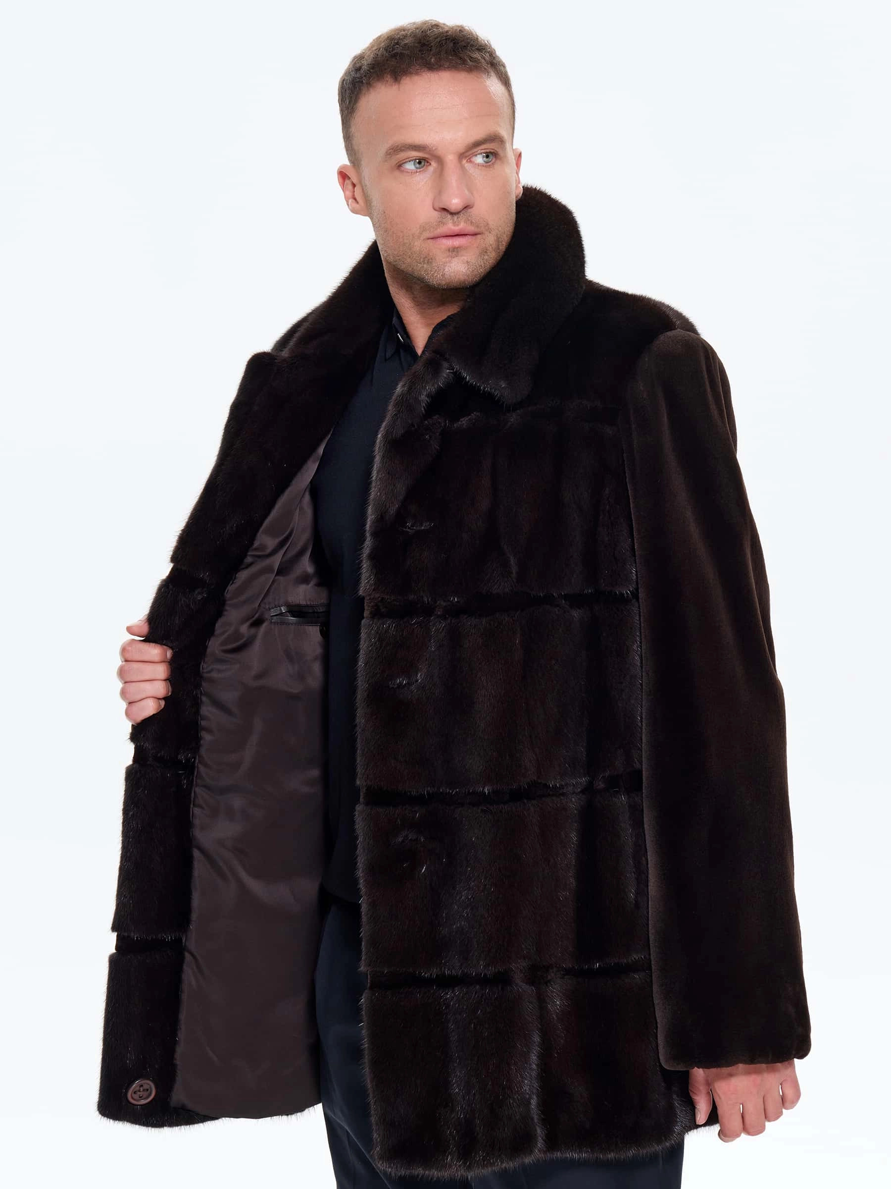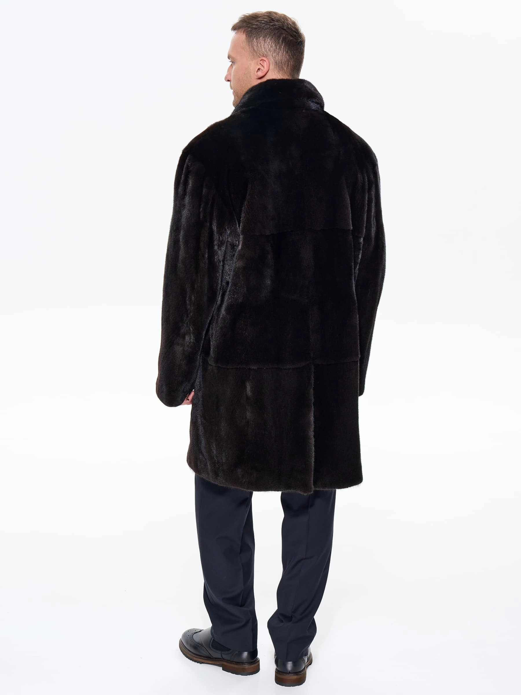 Классическую мужскую шубу пошили из густого меха норки премиум-класса. Строгий английский воротник - подчеркивает аристократизм, совместим с галстуком и шарфами, а прямой крой подчеркивает мужественную строгость».Универсальная длина - закрывает бедра, баланс тепла и мобильности. Полное отсутствие декора акцентирует качество меха. Не высокая шлица сзади улучшает подвижность при ходьбе. Изделие отлично сохраняет тепло в морозную погоду. Модель дополнили двумя внутренними и двумя боковыми карманами. Застежка: пуговицы.