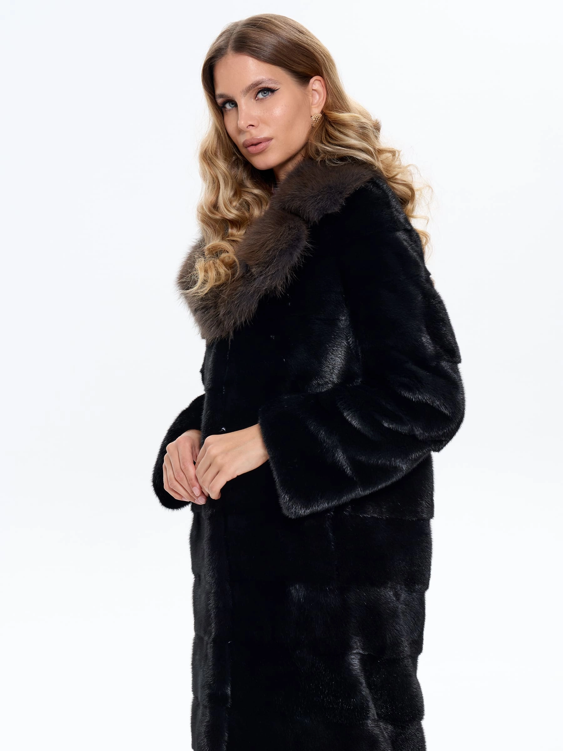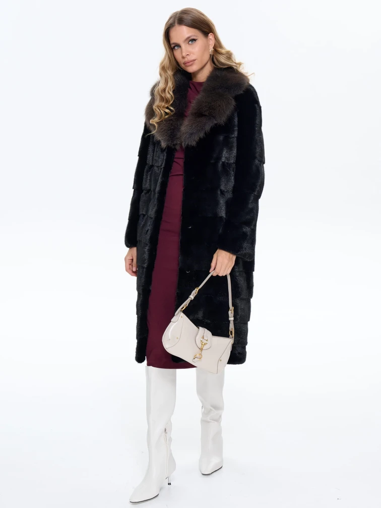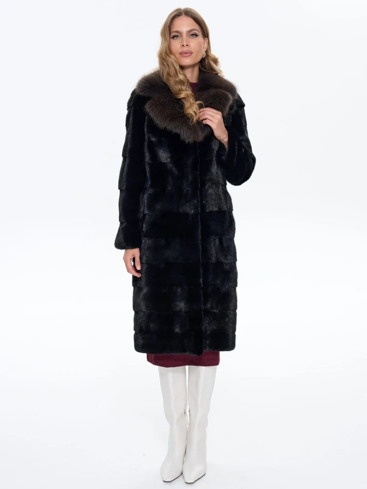 Товар черная норковая шуба с куницей 2а, размер 44, артикул 65150 выполнен из мех норки с застежкой клипсы. Рассчитан на сезон: зима. Длина изделия 110 см, силуэт прямой.