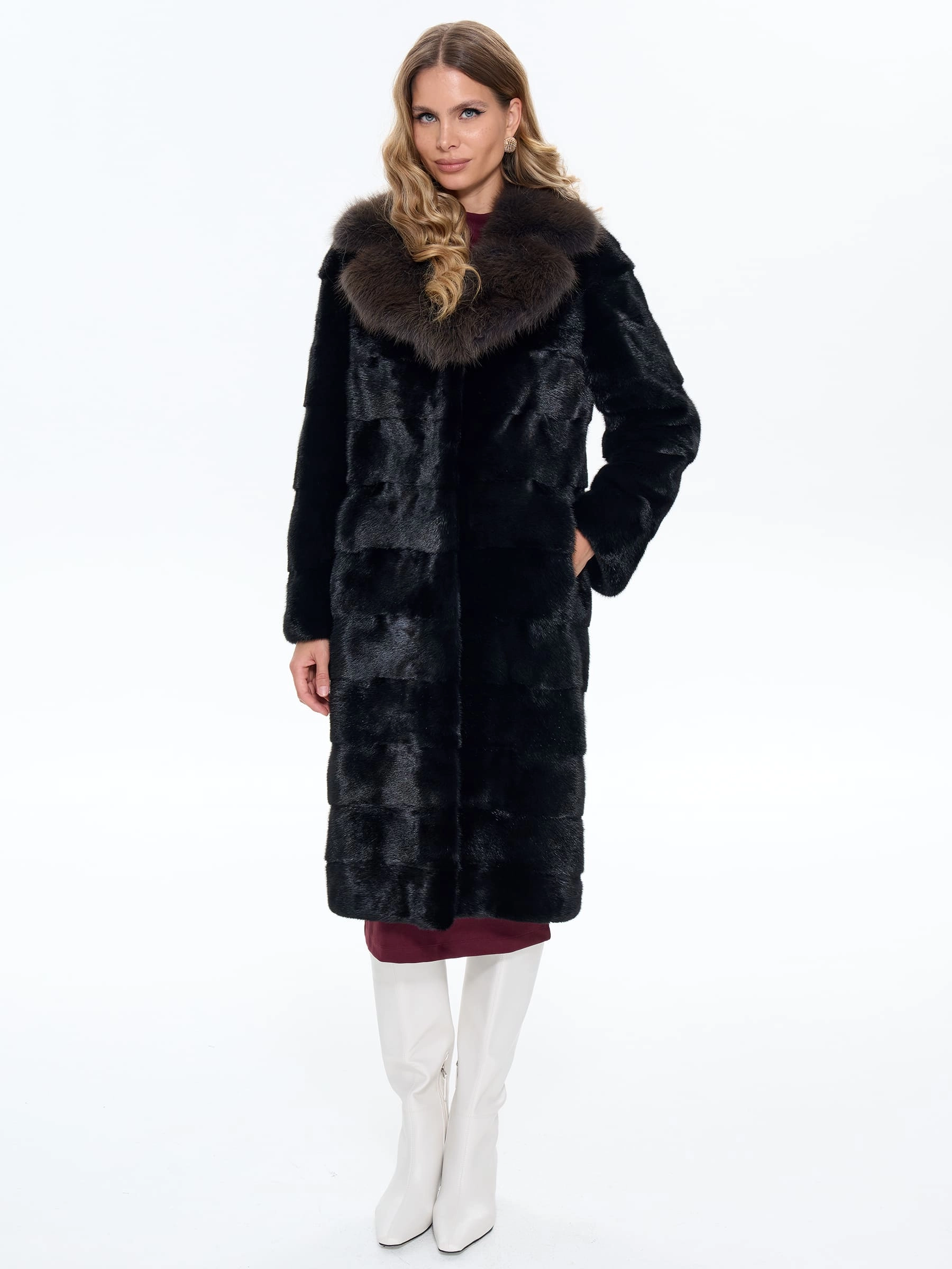 Элегантная черная шуба из густого меха норки поперечной выкладки с роскошным английским воротником, декорированным шелковистой куницей. Ее прямой силуэт и длина до щиколотки 109 см создают образ утонченной аристократичности. Рекомендация стилиста: эта модель великолепно смотрится с облегающими брюками и высокой грубой обувью для дерзкого дневного образа, а также с вечерним платьем и клатчем для выхода в свет. Идеальный выбор для тех, кто ценит безупречный стиль и непревзойденное качество.