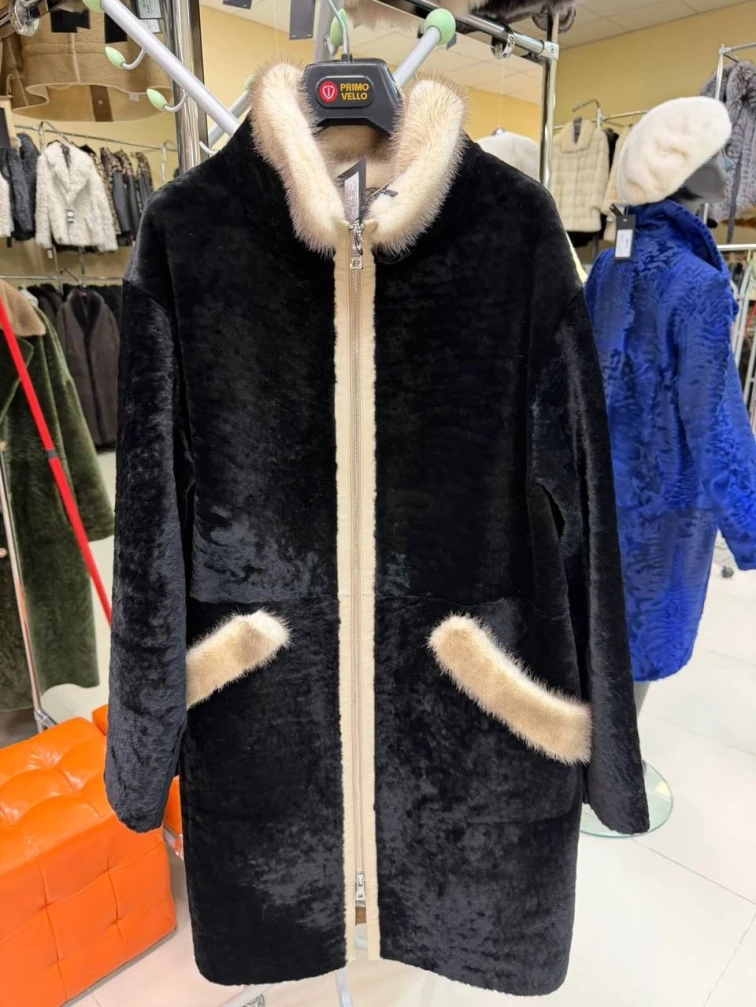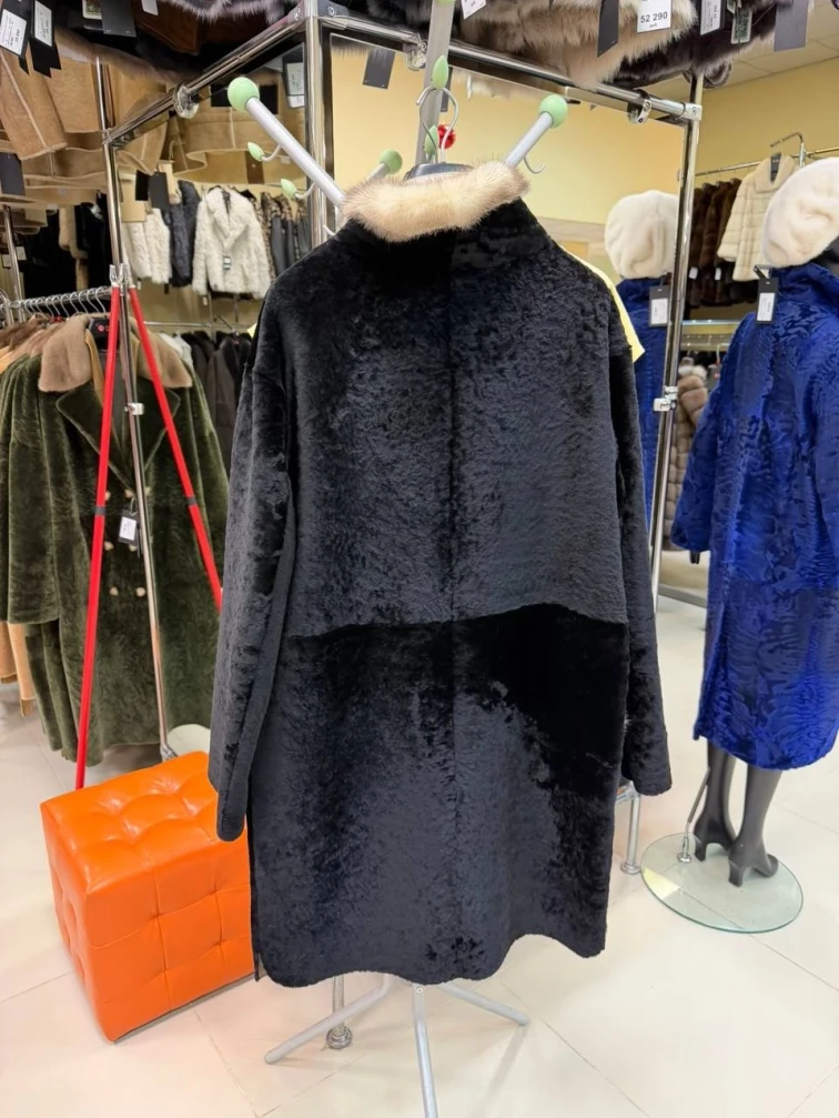 Товар черная женская дубленка из астрагана с мехом норки премиум класса 2018, размер 46, артикул 65140 выполнен из овчина "астраган" с застежкой молния. Рассчитан на сезон: осень-зима. Длина изделия свыше 90 см, силуэт прямой.