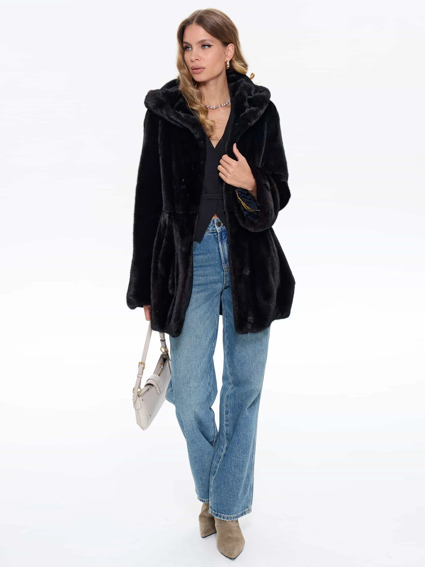 Женская шуба BRASCHI из натурального меха норки представлена в элегантном приталенном силуэте короткой длины примерно 77 см. Модель выполнена в классическом стиле с втачными рукавами и оснащена практичным капюшоном-трансформером, который одновременно служит эффектным объемным воротником. Шуба отличается лаконичным дизайном без декоративной отделки, что подчеркивает роскошь и безупречное качество натурального меха норки. Застежка на надежных металлических клипсах обеспечивает удобство носки, а комфортная вискозная подкладка добавляет практичности. Модель выполнена в редком и благородном оттенке Violet Fox - глубоком холодном цвете с изысканными фиолетово-синеватыми переливами, напоминающими мех черно-бурой лисы. Короткая длина и приталенный силуэт делают эту шубу особенно современной и подчеркивающей фигуру, сохраняя при этом все теплоизоляционные свойства для холодной зимы.