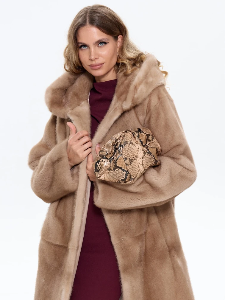 Элегантная длинная шуба из шелковистого меха норки с капюшоном пастельного оттенка модели «Жанет» создает образ утонченной роскоши. А-образный силуэт и объемный капюшон не только обеспечивают комфорт и защиту от непогоды, но и подчеркивают безупречный вкус своей обладательницы. Рекомендация стилиста: эту модель можно носить с облегающими брюками и высокими сапогами для создания элегантного повседневного образа или сочетать с платьем-миди и замшевыми ботильонами для особого случая. Идеальное сочетание королевской элегантности и современного комфорта.