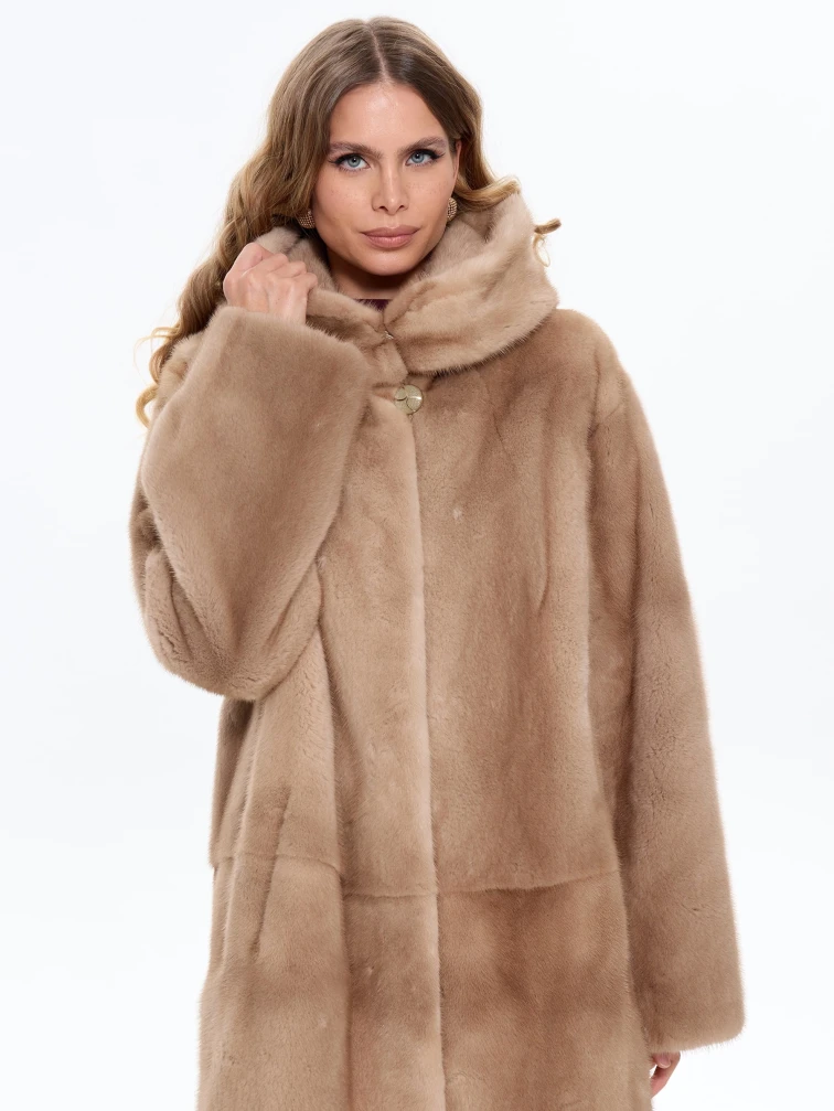 Длинная норковая женская шуба с капюшоном Жанет, пастельная, размер 52, артикул 65170