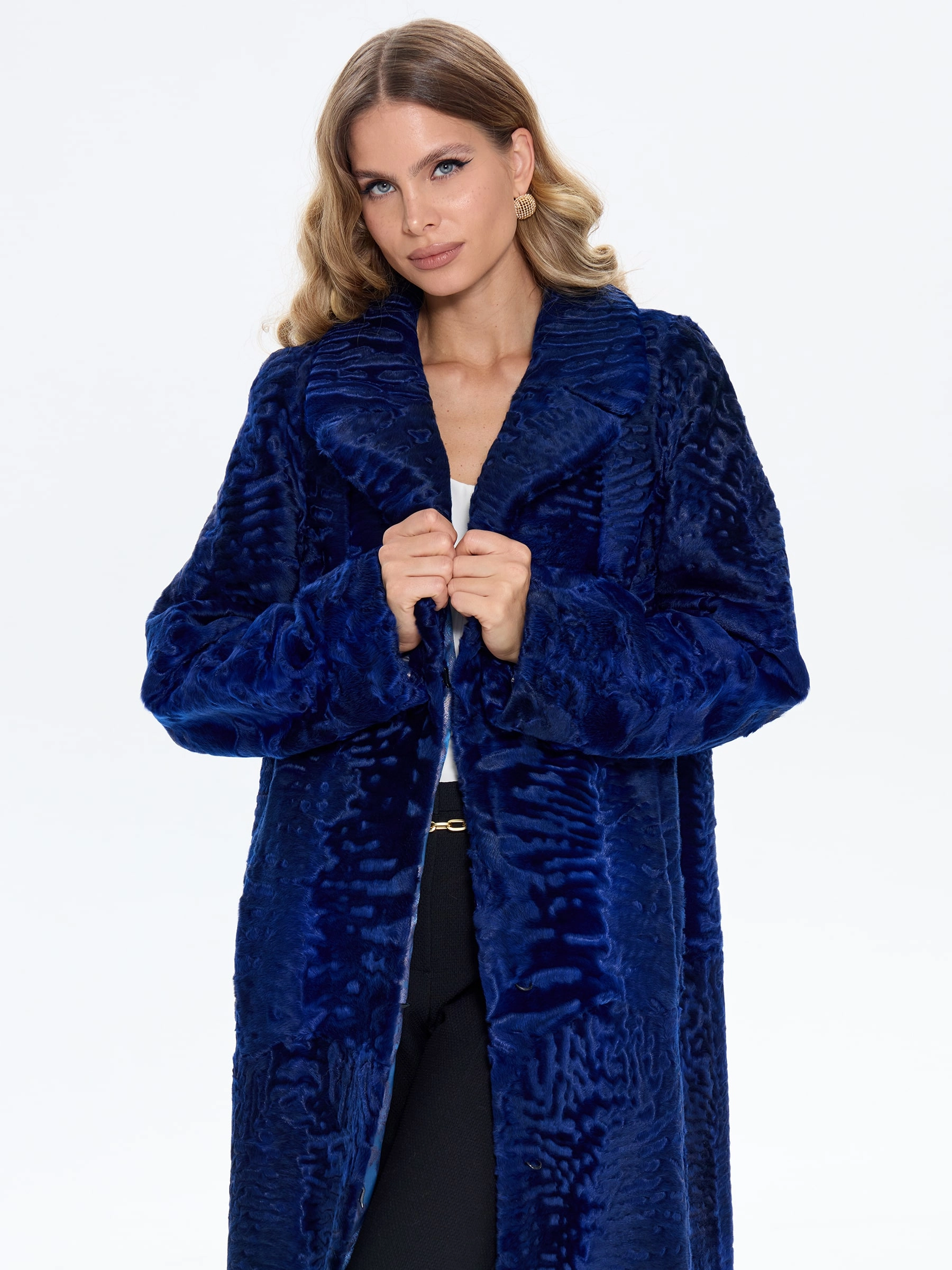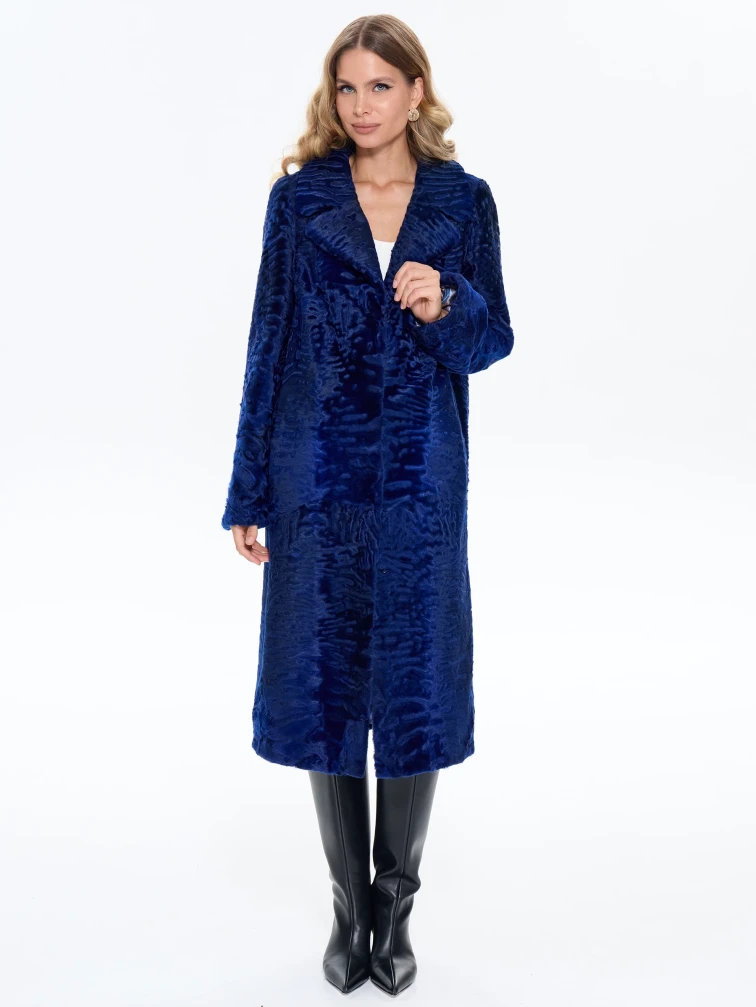 Товар длинная синяя каракулевая женская шуба алиса, размер 48, артикул 65190 выполнен из мех каракульчи с застежкой клипсы. Рассчитан на сезон: весна-осень. Длина изделия 110 см, силуэт прямой.