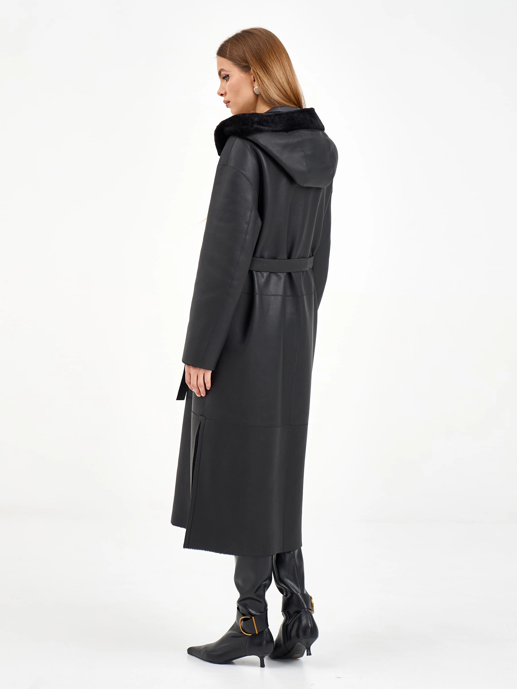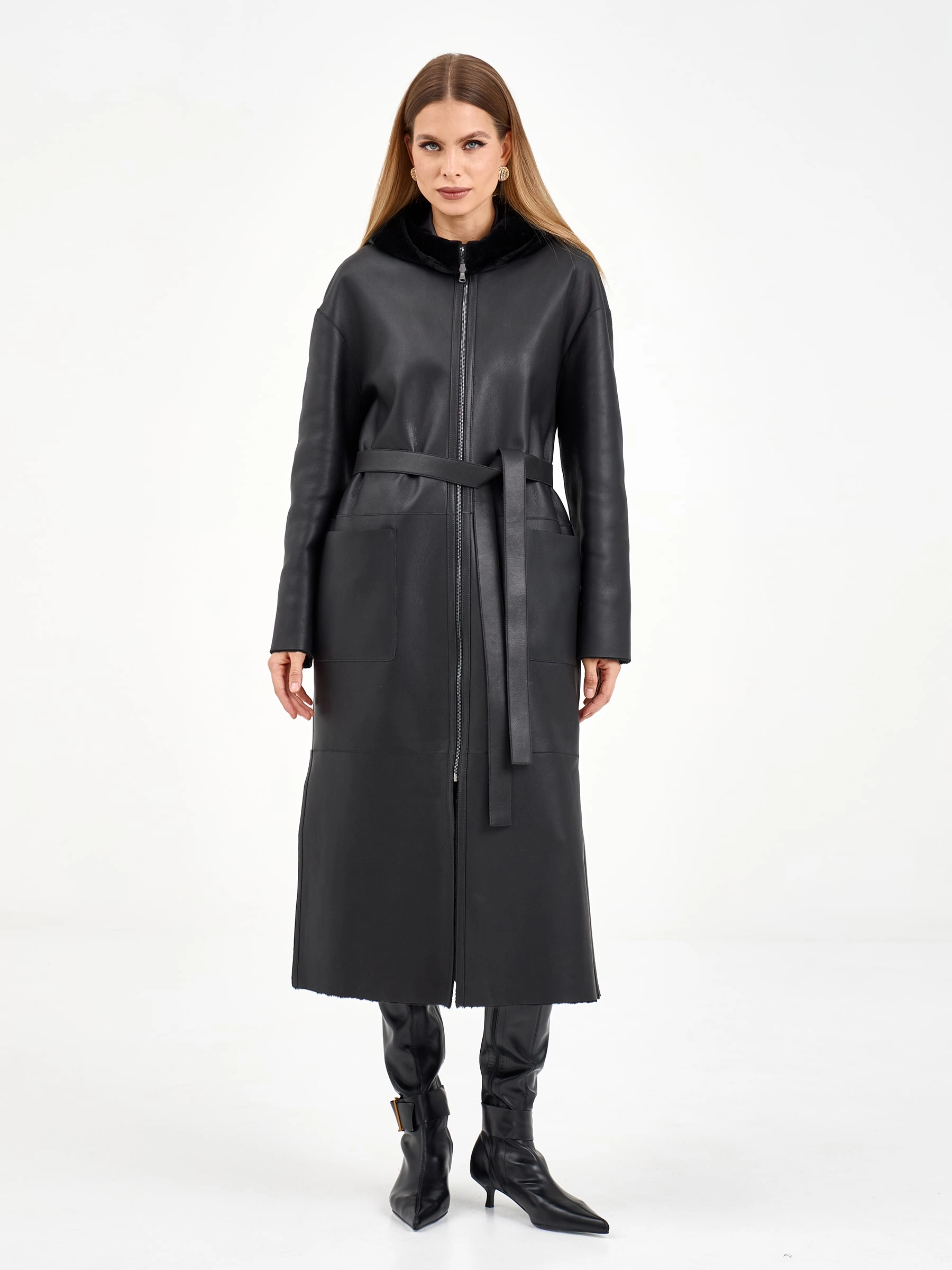 Длинная женская дубленка с капюшоном 2071, черная, размер 50, артикул 65060