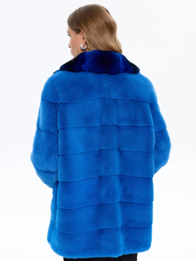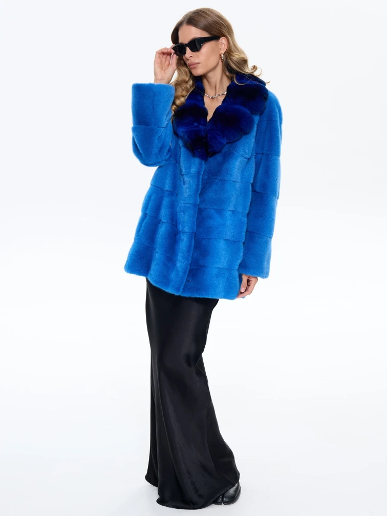 Изысканная короткая шуба из меха норки с английским воротником и отделкой шиншиллы, где нежно-голубой оттенок норки гармонично сочетается с воротником насыщенного синего цвета. Прямой силуэт с поперечной раскладкой и элегантные лацканы, декорированные шелковистым мехом шиншиллы, создают уникальный цветовой дуэт. Рекомендация стилиста: сочетайте с молочно-белыми брюками классического кроя и туфлями-лодочками для дневного выхода или с кружевным платьем миди для особого случая. Эта шуба станет жемчужиной гардероба для ценительниц безупречного стиля и изысканных цветовых решений.