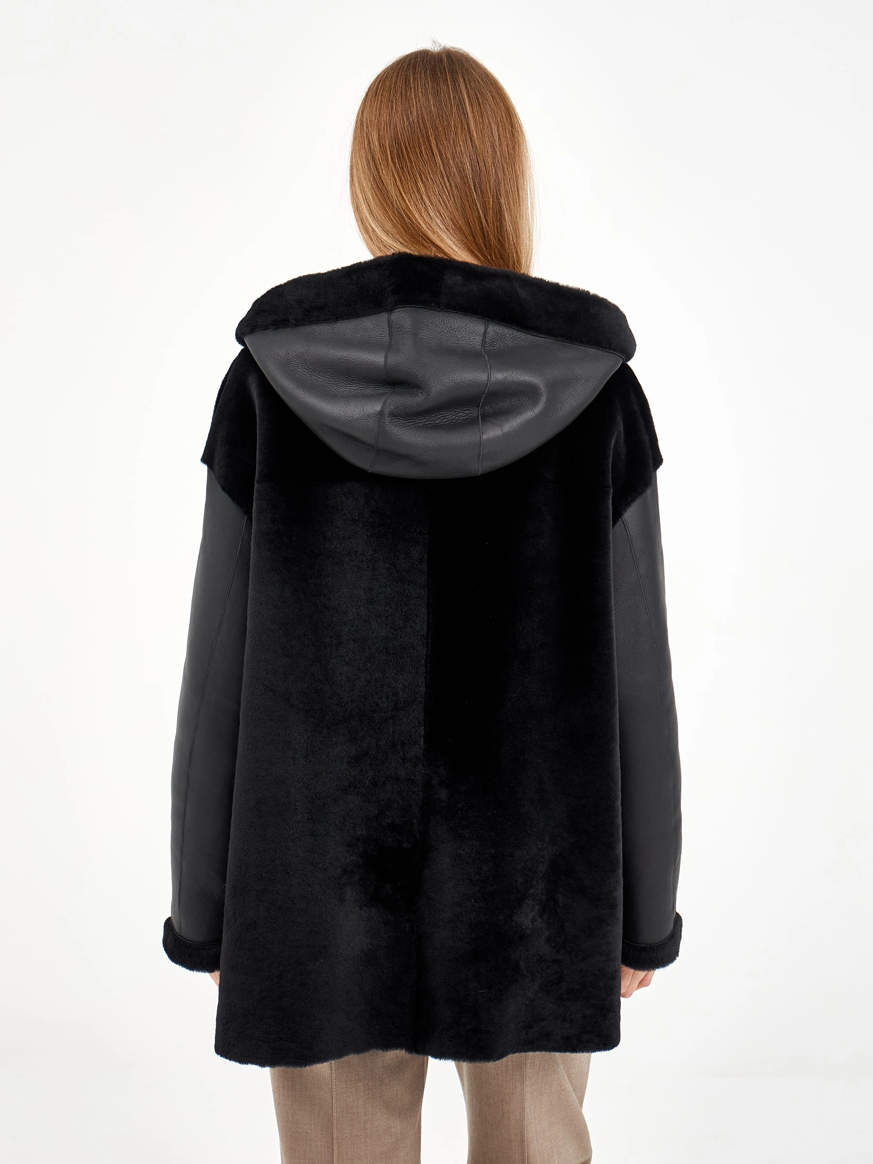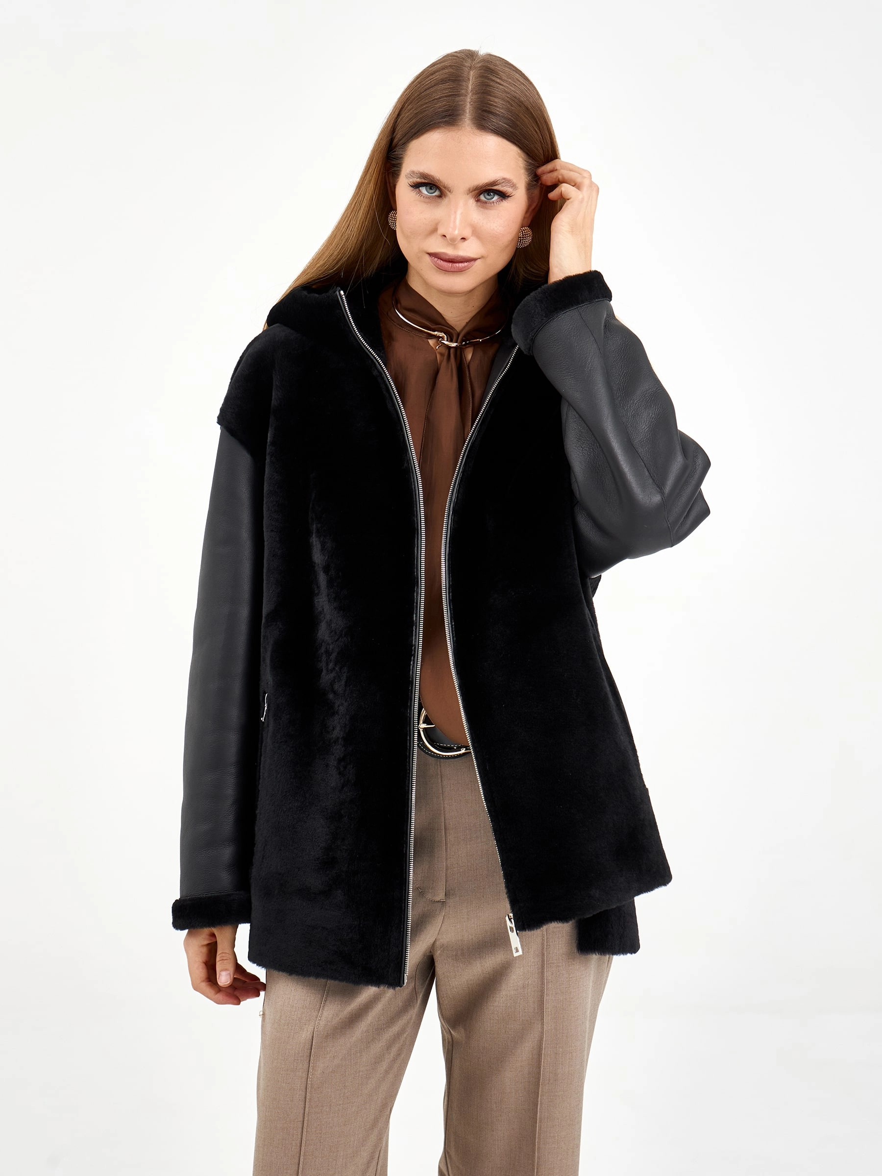 Товар короткая черная женская дубленка с капюшоном 2076, размер 46, артикул 65260 выполнен из овчина "мерино" с застежкой молния. Рассчитан на сезон: зима. Длина изделия 75 см, силуэт свободный.