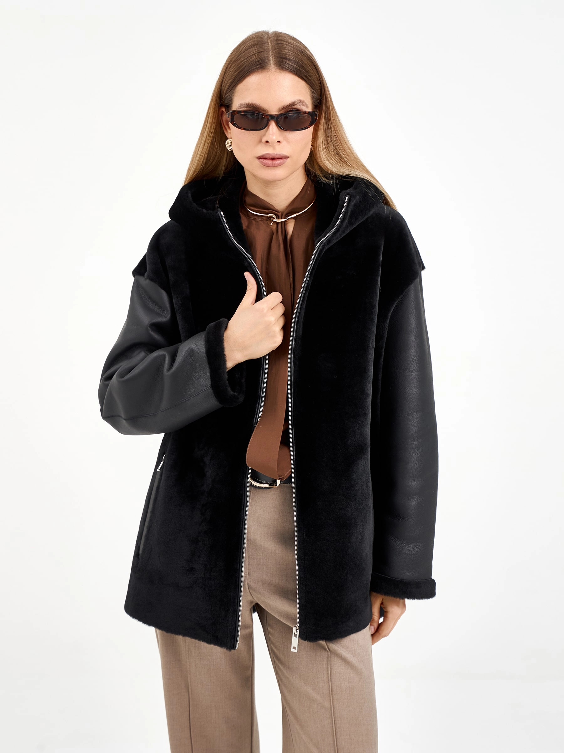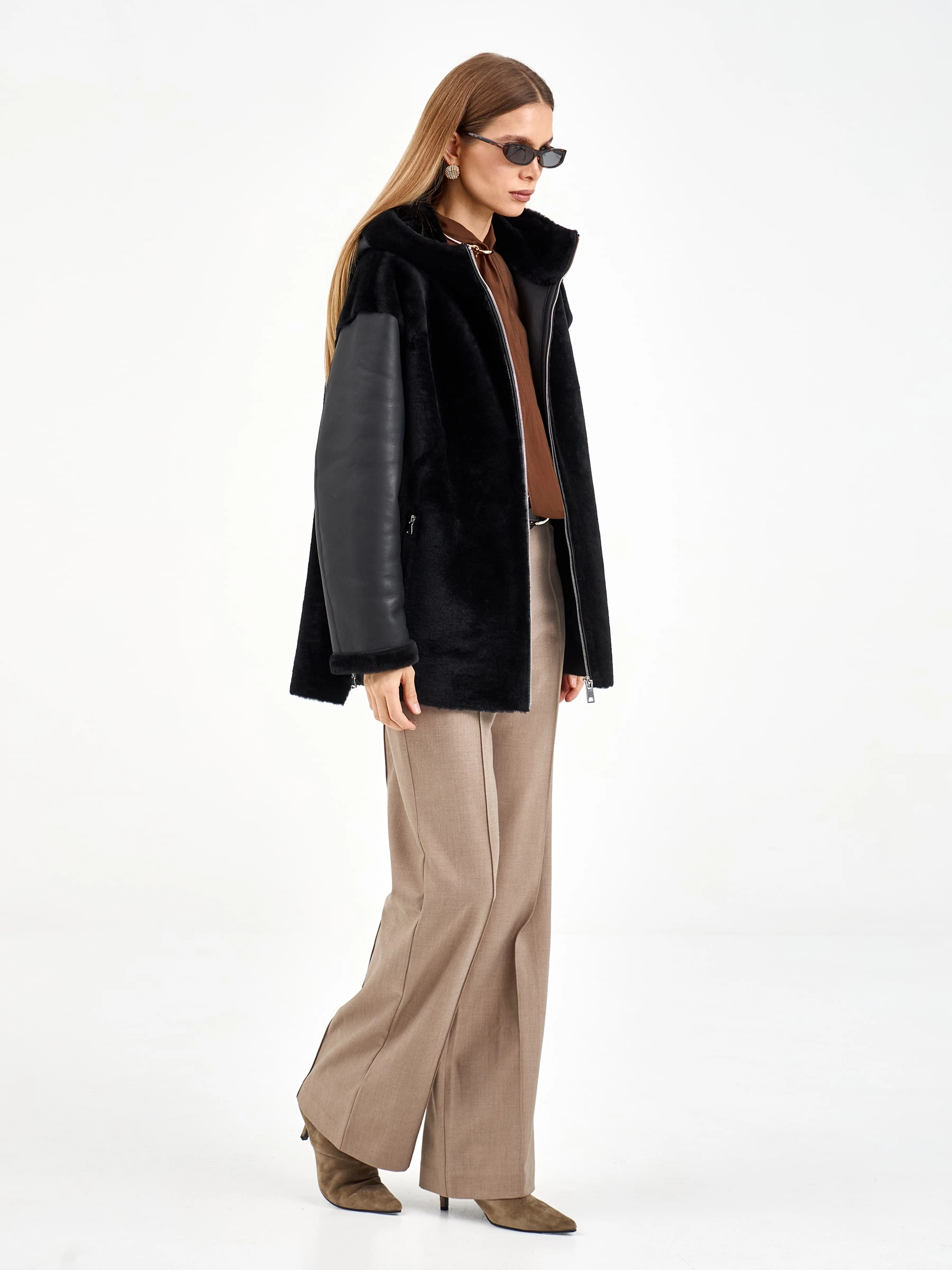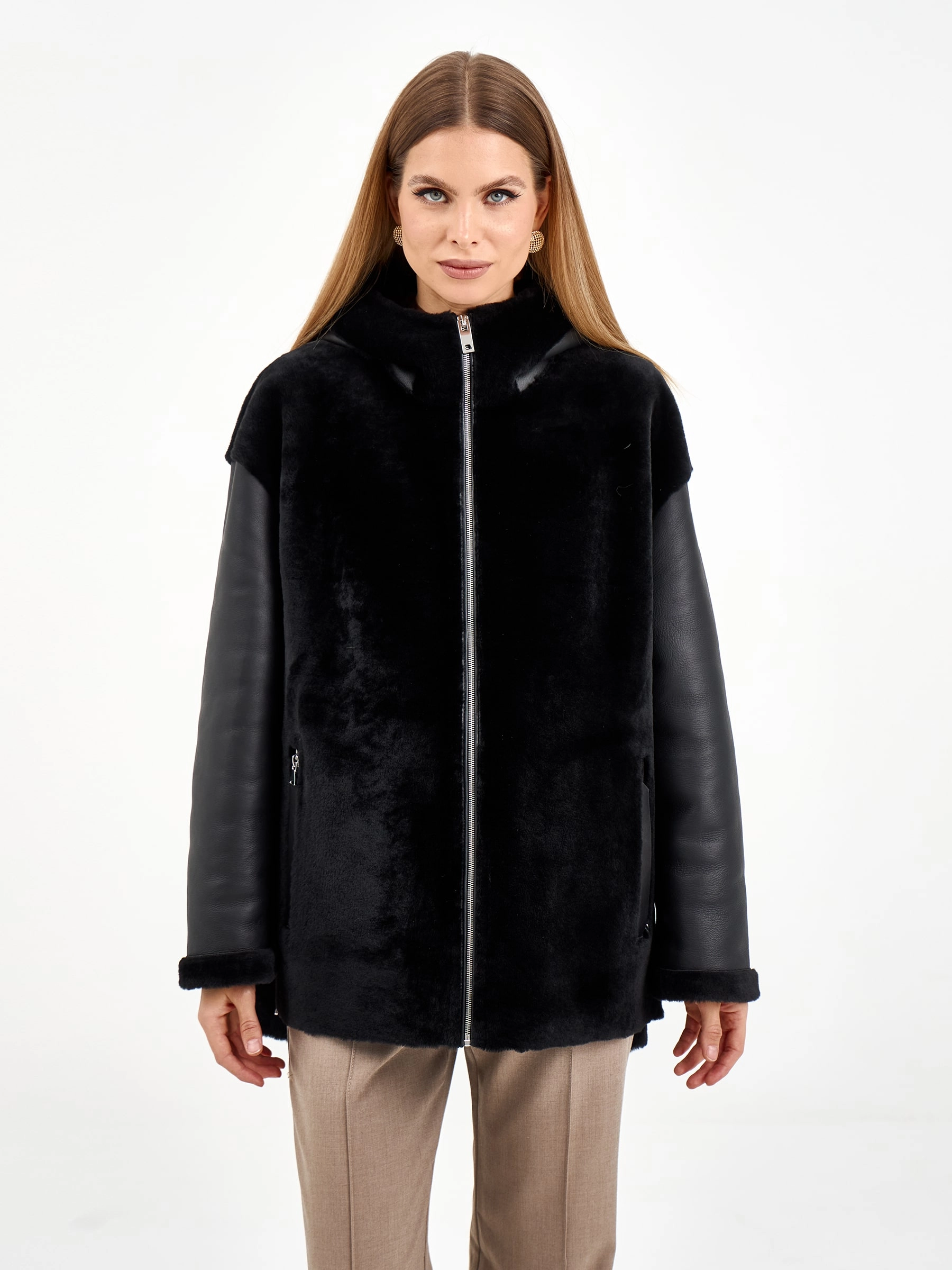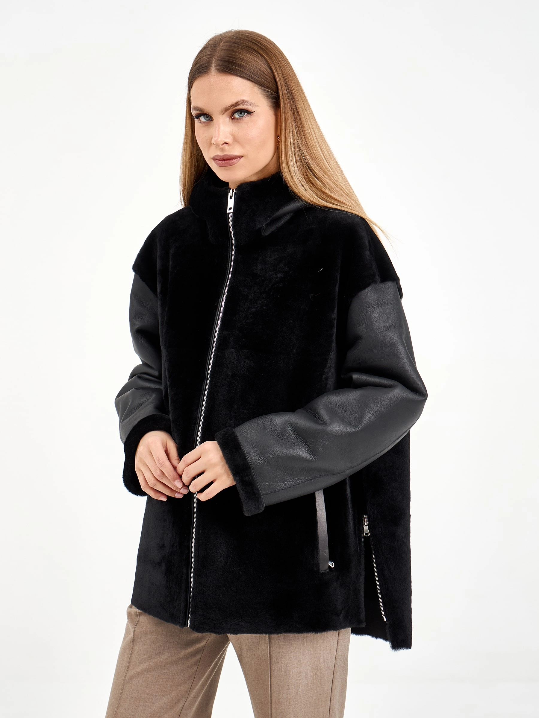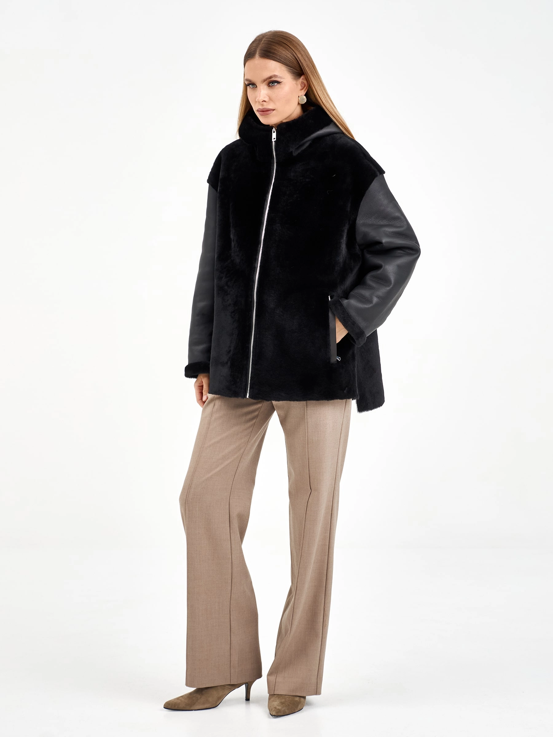 Короткая комбинированная дубленка из овчины мерино с леопардовым принтом и кожаными рукавами. Модель свободного кроя длиной 75 см с воротником-стойкой и спущенным рукавом сочетает смелые текстурные контрасты. Боковые разрезы и врезные карманы застегиваются на молнии, подчеркивая современный дизайн. Стилисты рекомендуют носить с монохромными базовыми вещами — черными узкими джинсами, водолазкой и кожаными ботильонами, чтобы выразительная фактура дубленки стала центром образа. Идеальный выбор для создания смелого городского образа, где дерзкая эстетика встречается с непревзойденным комфортом.