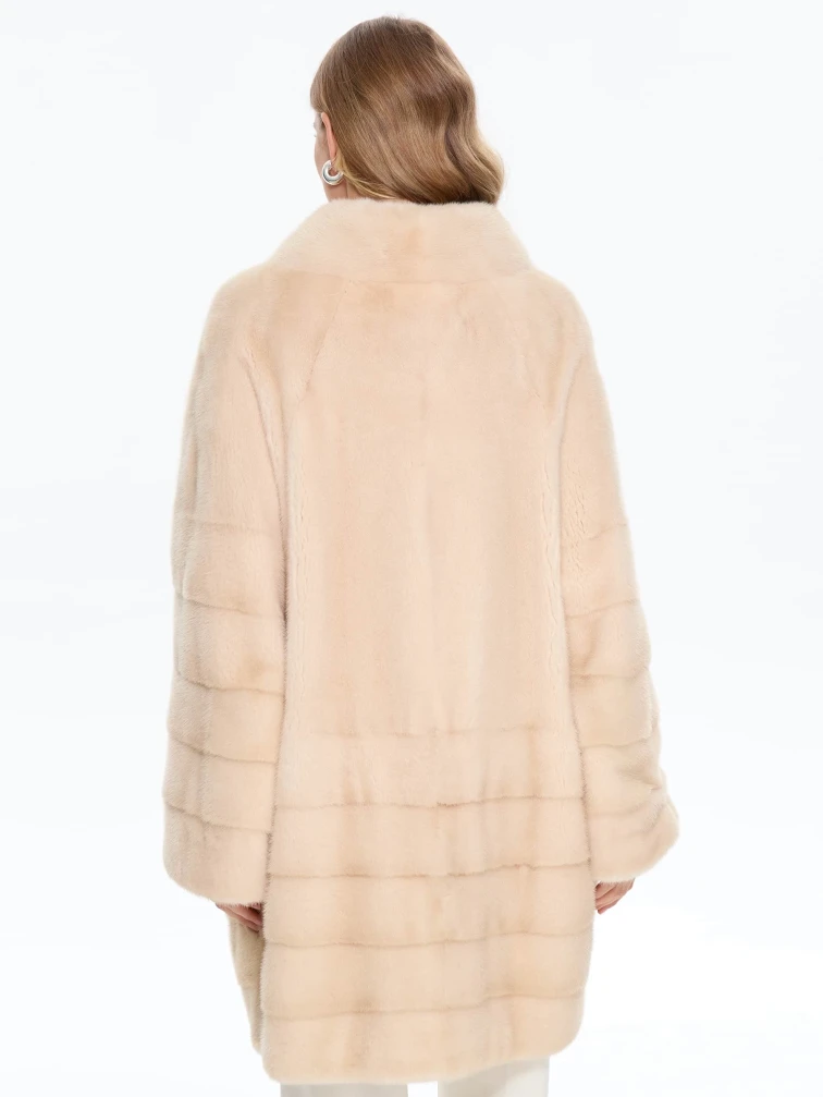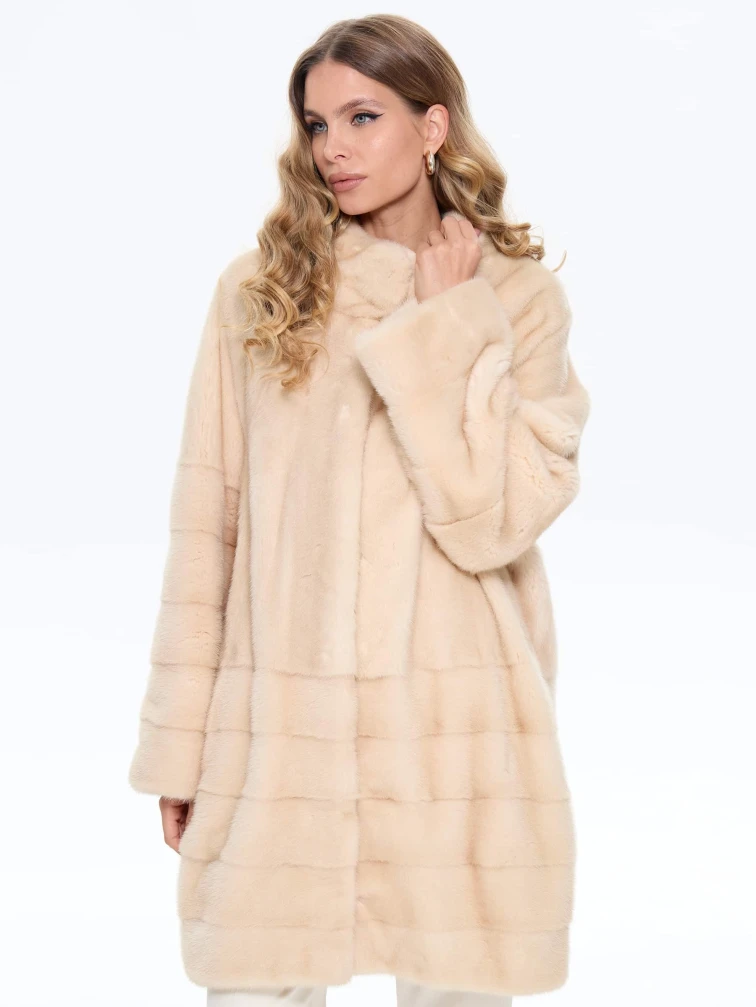 Эта шуба создана для истинных ценителей качества - мастера использовали нежную шелковистую бежевую норку с густым ворсом, которая великолепно сохраняет тепло в зимние холода. Её комбинированная раскладка, прямой силуэт и элегантно спущенные рукава без слов говорят о вашем безупречном вкусе и статусе. Практичный воротник-стойка надежно защищает от ветра, визуально удлиняет шею и гармонично сочетается с любыми аксессуарами. Мягкая вискозная подкладка с гипоаллергенной антистатической пропиткой обеспечивает комфорт носки, предотвращая трение об одежду, а скрытые клипсы бережно фиксируют изделие, сохраняя целостность мехового полотна.