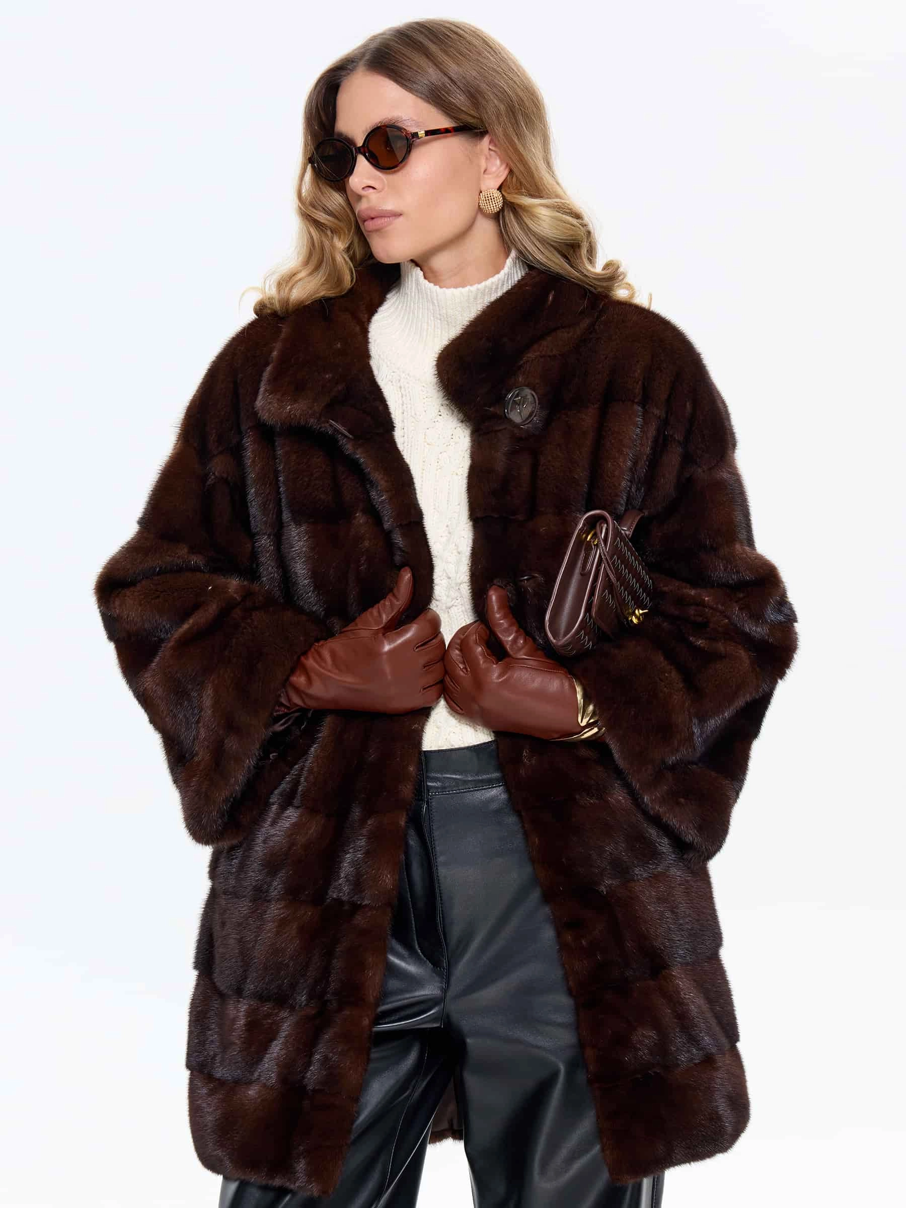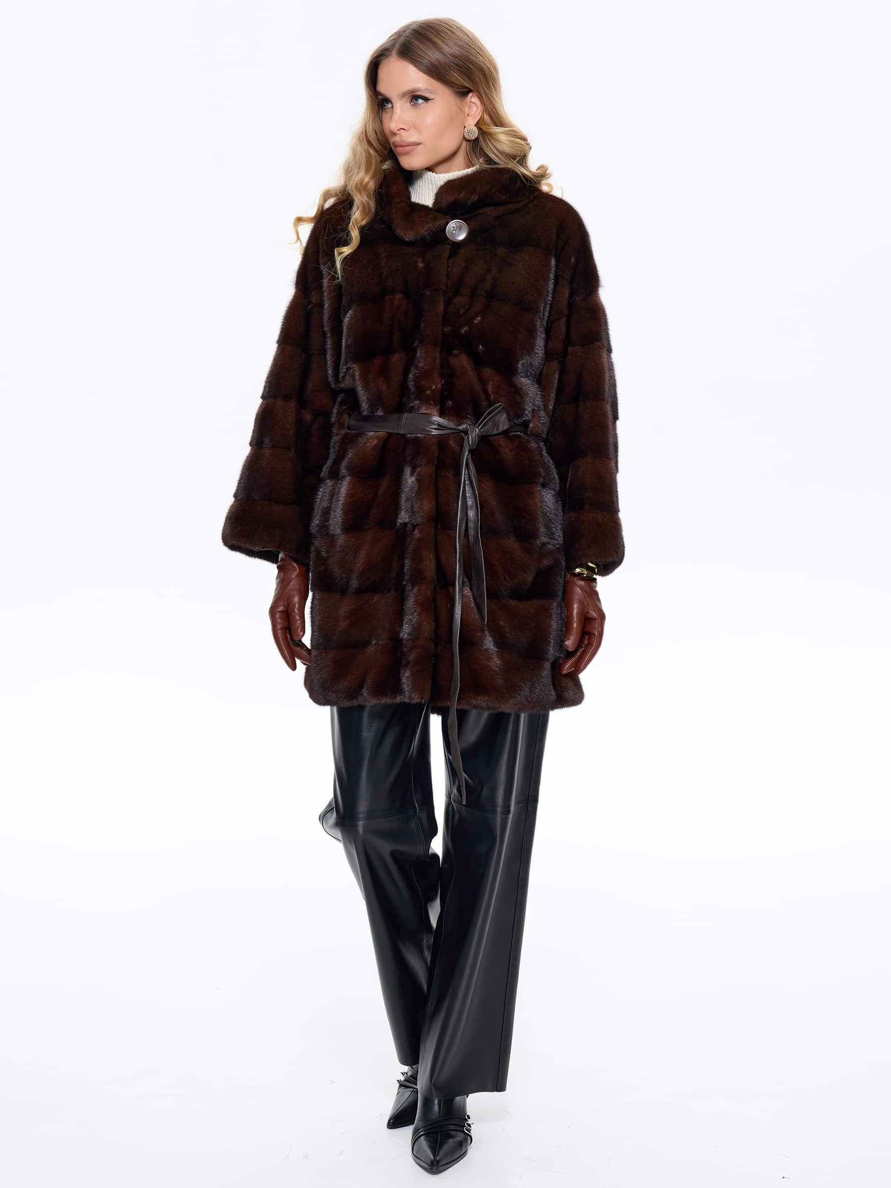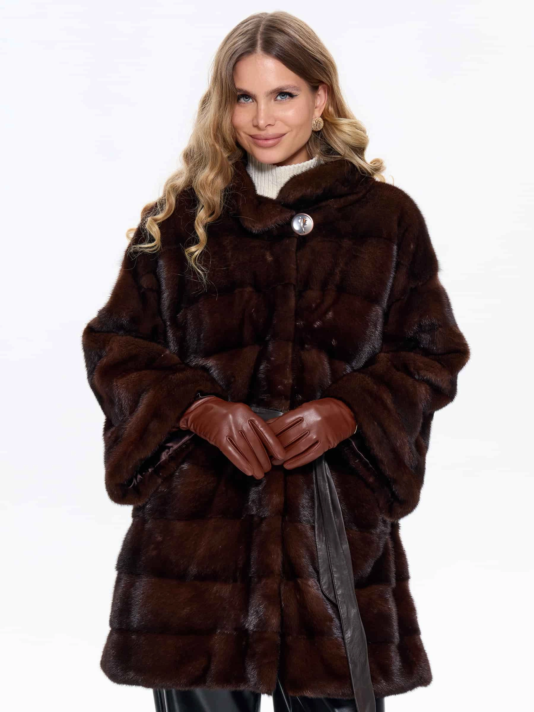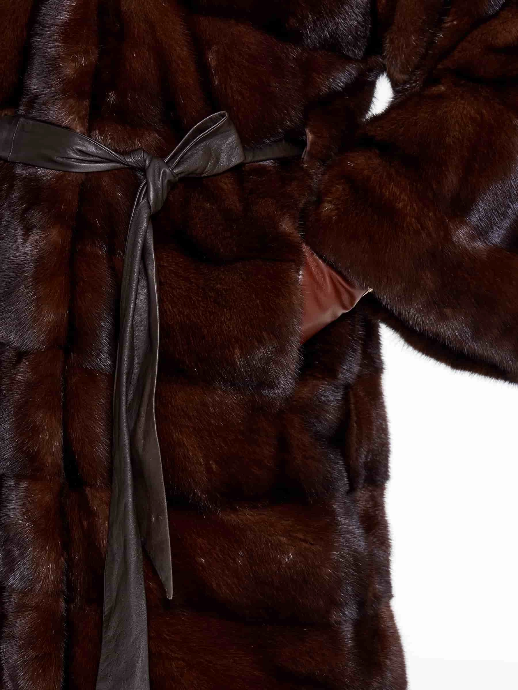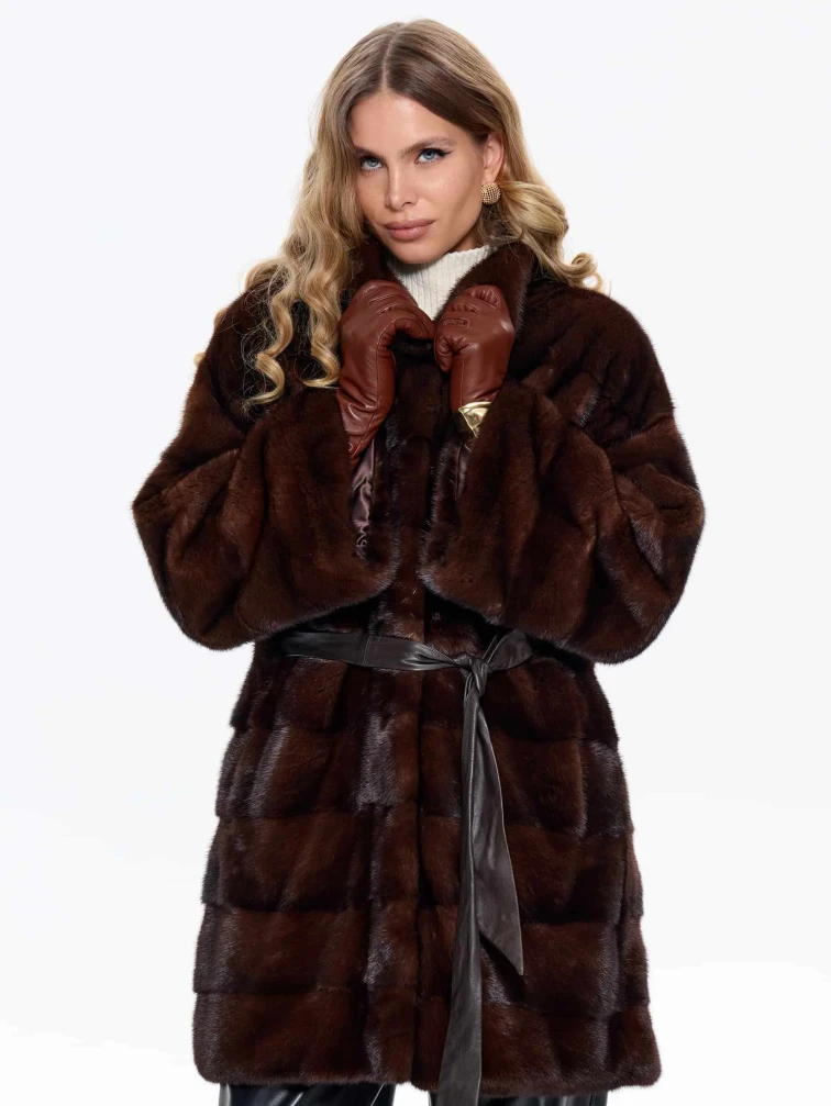 Короткую шубу в универсальной длине выполнили из густой коричневой норки премиум-класса в диагональной раскладке, где ручная сортировка шкурок гарантирует безупречный глянцевый блеск, равномерную плотность и шелковистую текстуру меха. Спущенный крой рукавов создает модный силуэт с мягкой линией плеч, который маскирует сутулость, добавляет образу легкости и не ограничивает подвижность, делая модель идеальной для активной городской жизни. Воротник-стойка надежно защищает от ветра и гармонично сочетается с любыми аксессуарами, а скрытые клипсы обеспечивают надежную фиксацию без повреждения меха, сохраняя чистоту линий фасона. Модель дополнена двумя удобными боковыми карманами и широким кожаным поясом для акцента на талии.