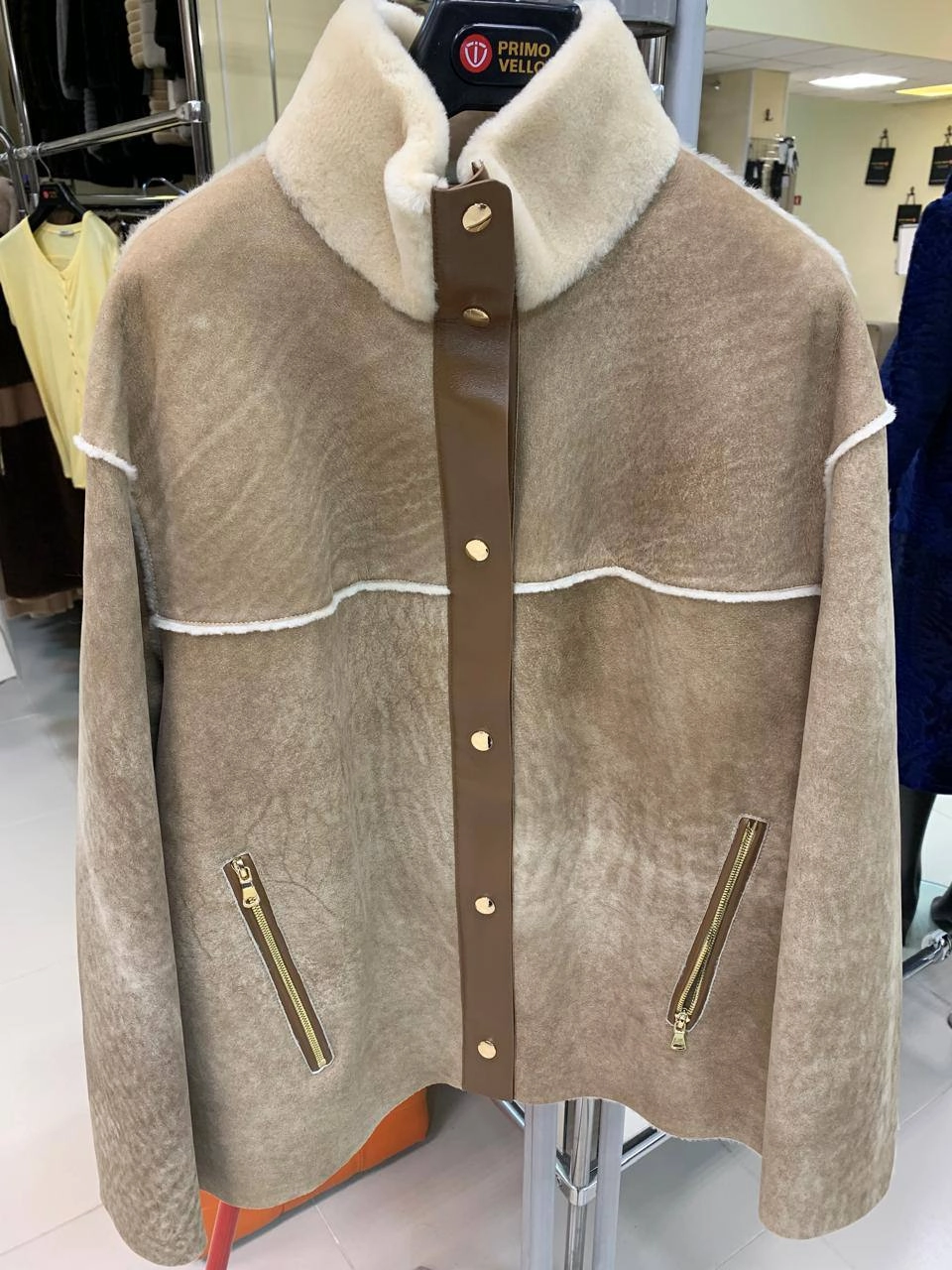 Товар короткая женская дубленка 2074, бежевая, размер 44, артикул 65250. Длина изделия 65 см.