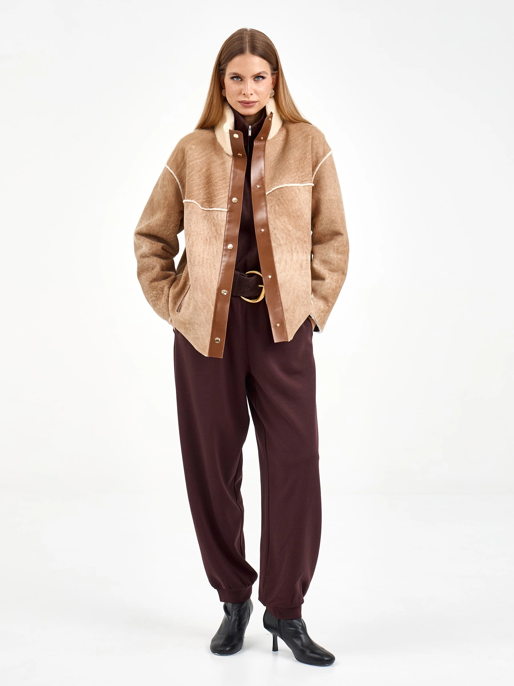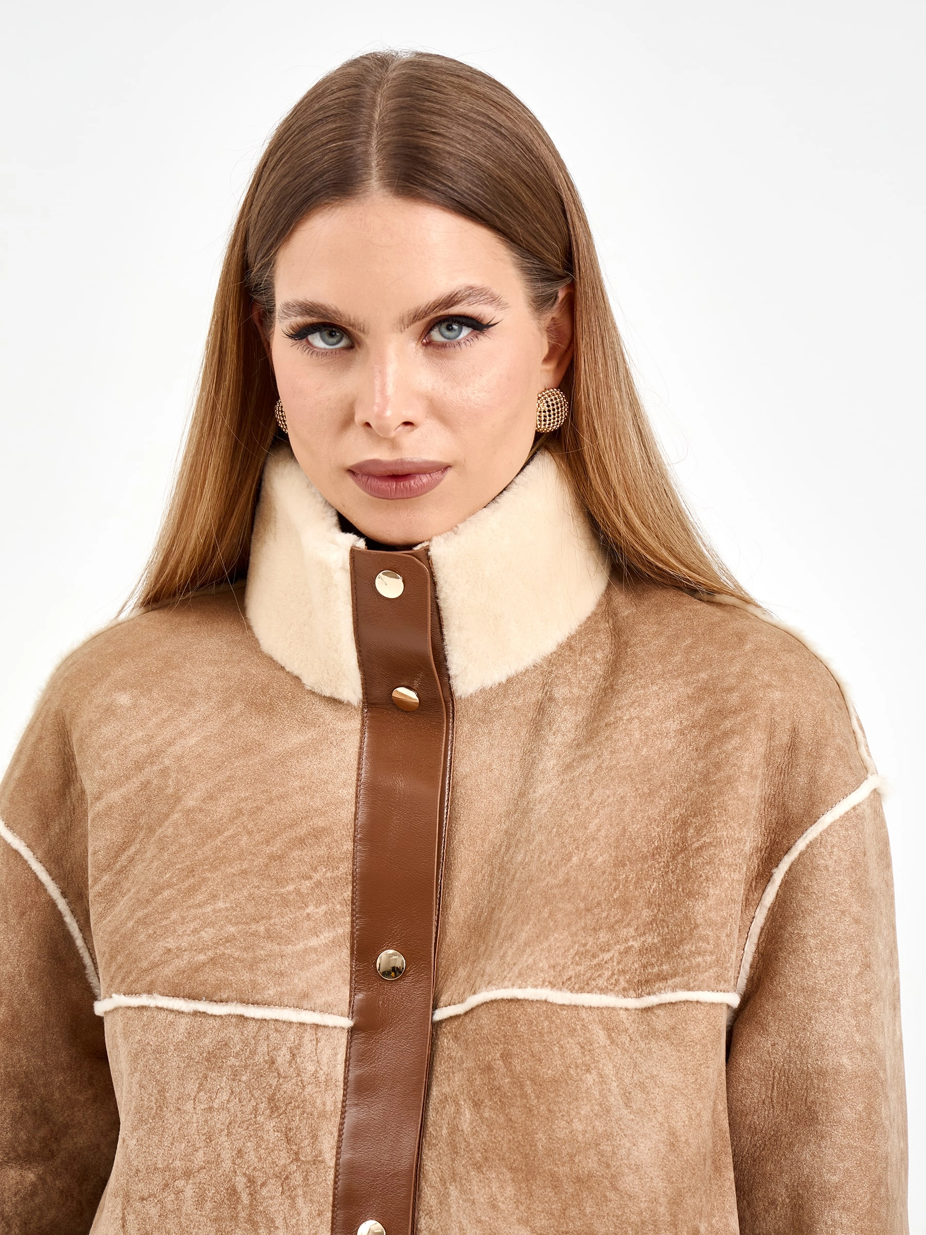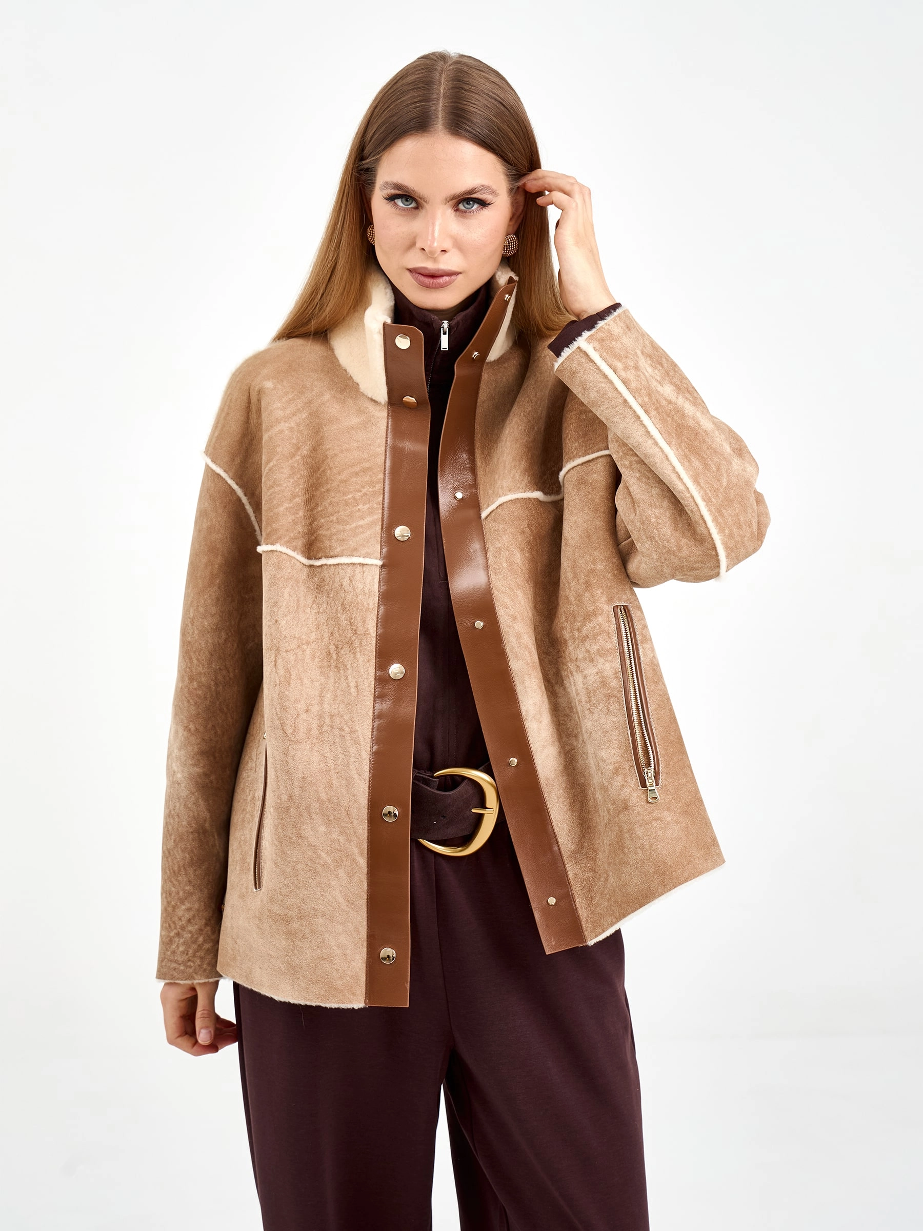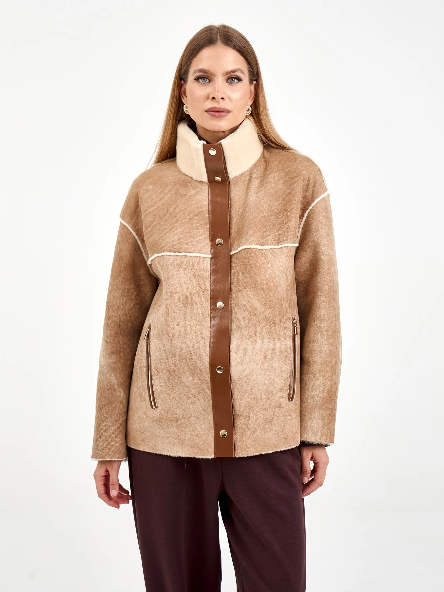 Короткая дубленка без капюшона из мягчайшей овчины мерино свободного кроя. Модель длиной 65 см с воротником-стойкой и спущенным рукавом демонстрирует утонченную эстетику: декоративные швы вывернуты мехом наружу, а карманы и планка на кнопках оформлены кожаными кантами с золотистой фурнитурой. Стилисты рекомендуют сочетать с водолазками, кожаными брюками и челси для создания образа в стиле smart casual — эта дубленка станет идеальным выбором для городских прогулок, добавляя образу непринужденной элегантности и уюта.