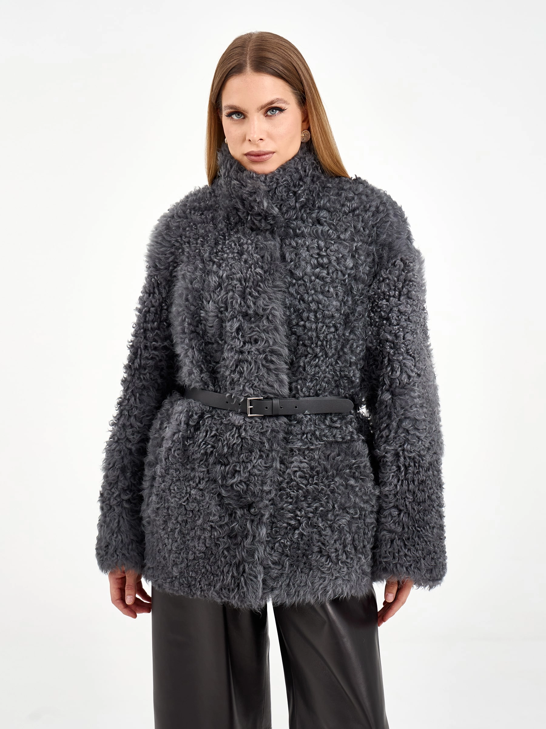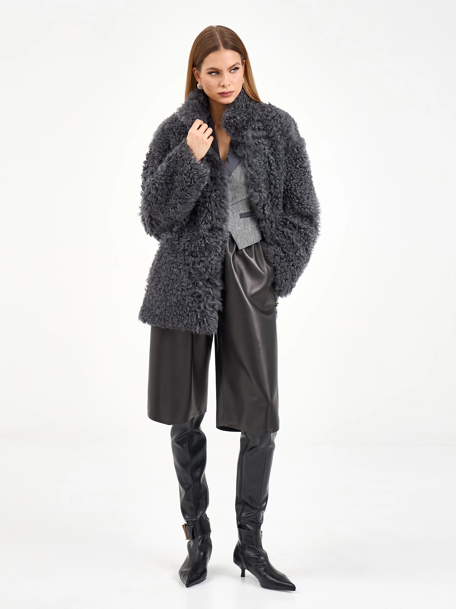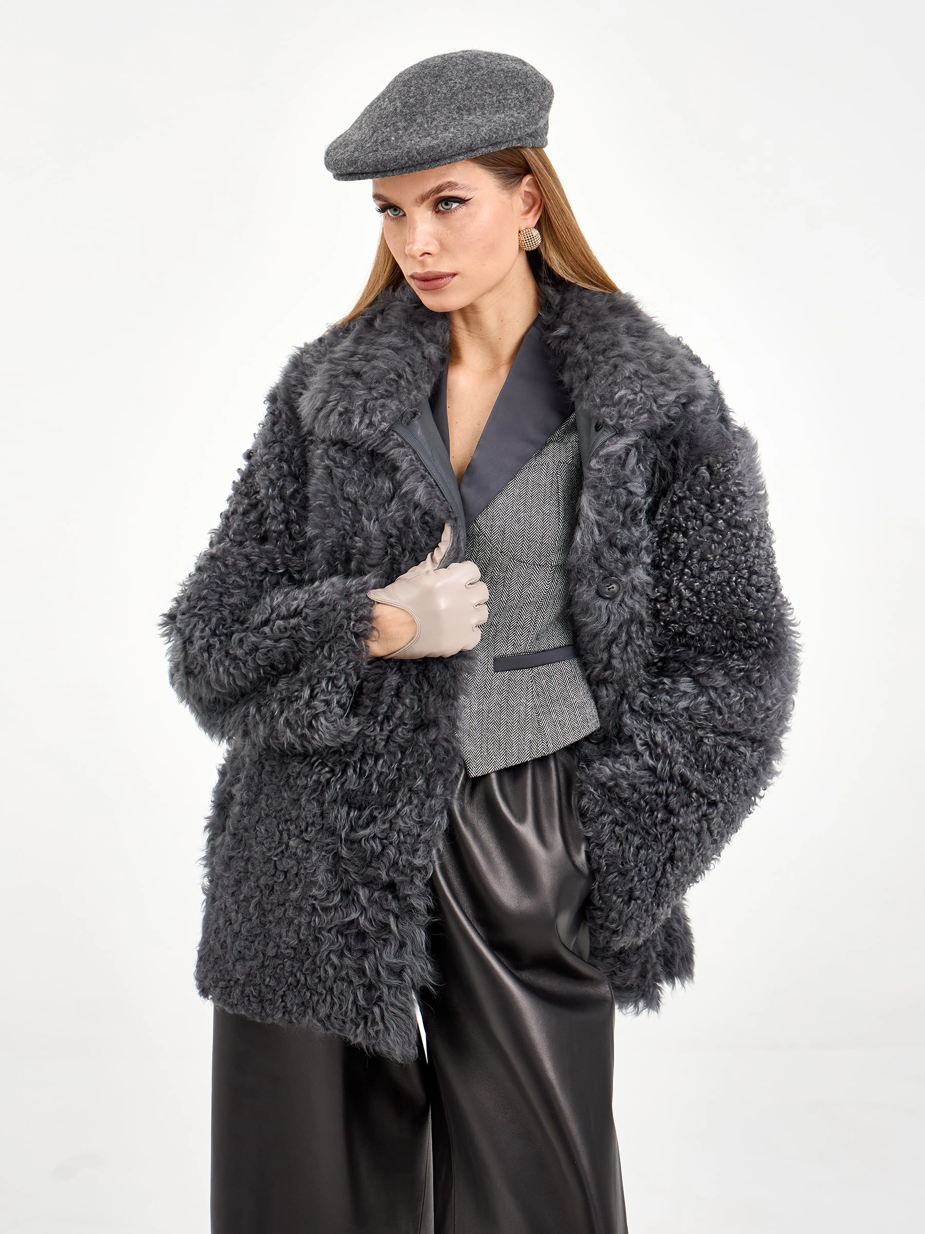 Короткая дубленка из натуральной овчины «Тиградо» с выразительной текстурой крупного завитка. Эта модель не для скромных! Свободный силуэт, спущенный рукав и воротник-стойка создают образ с характером. Совет стилиста: наденьте с кожаными брюками и грубыми ботинками для уличного шика или с однотонным платьем и сапогами-челси для контраста фактур.