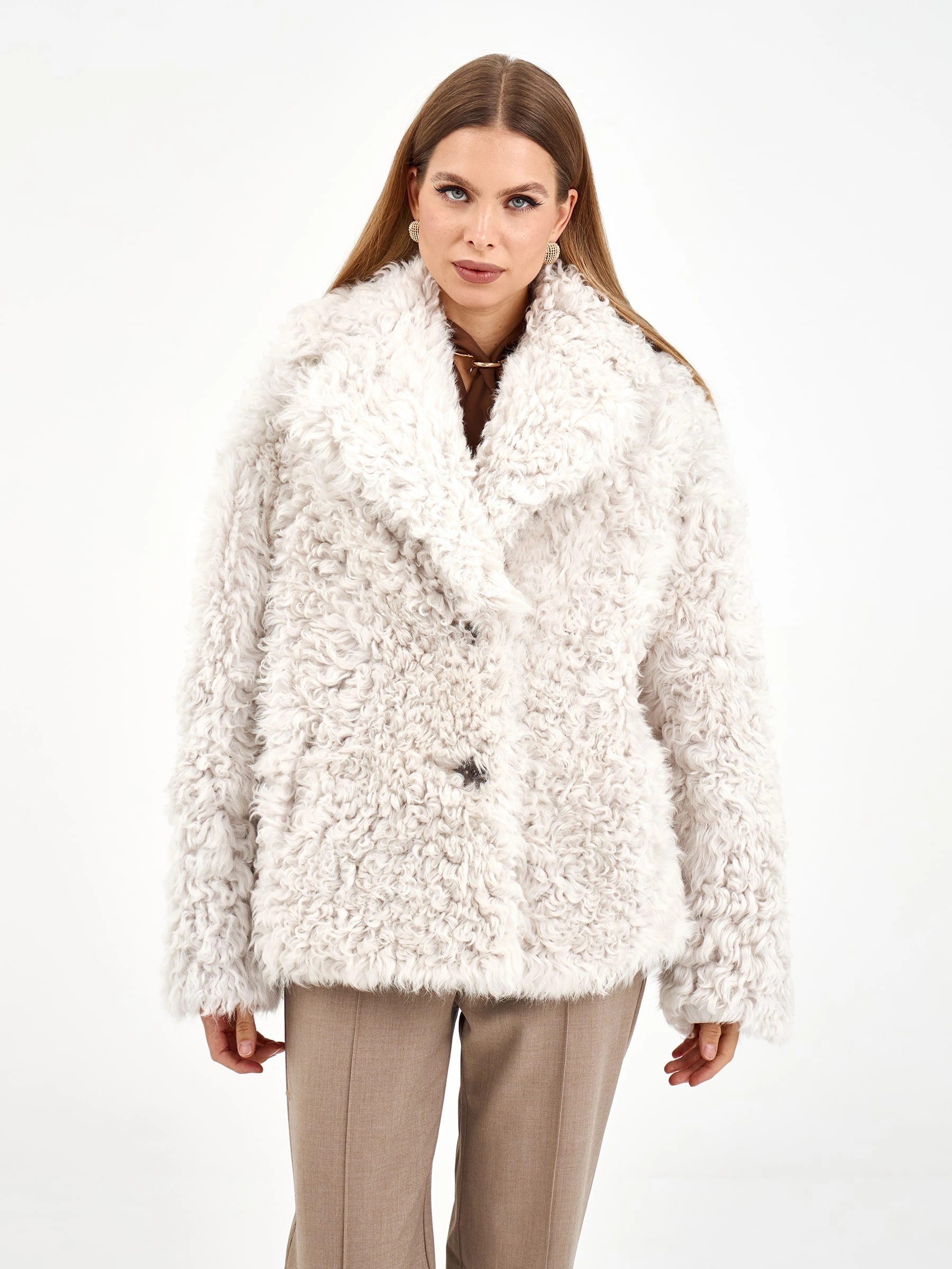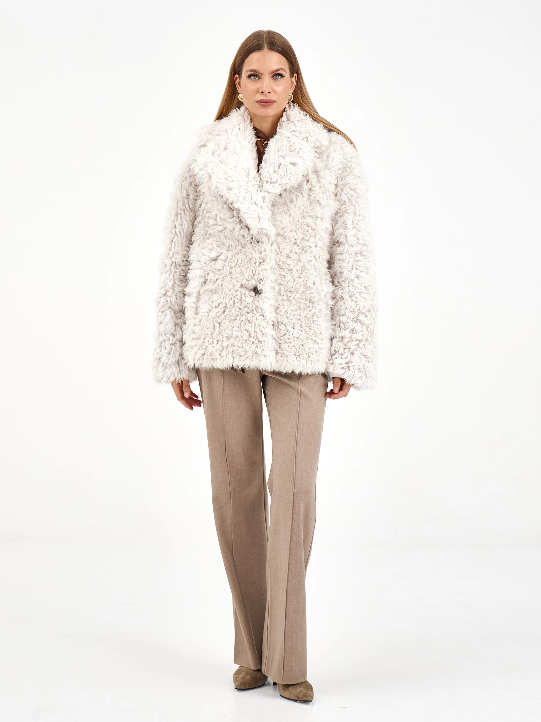 Товар короткая женская дубленка из тиградо 2081, белая, размер 42, артикул 65040 выполнен из овчина "тиградо" с застежкой пуговицы. Рассчитан на сезон: зима. Длина изделия 70 см, силуэт свободный.