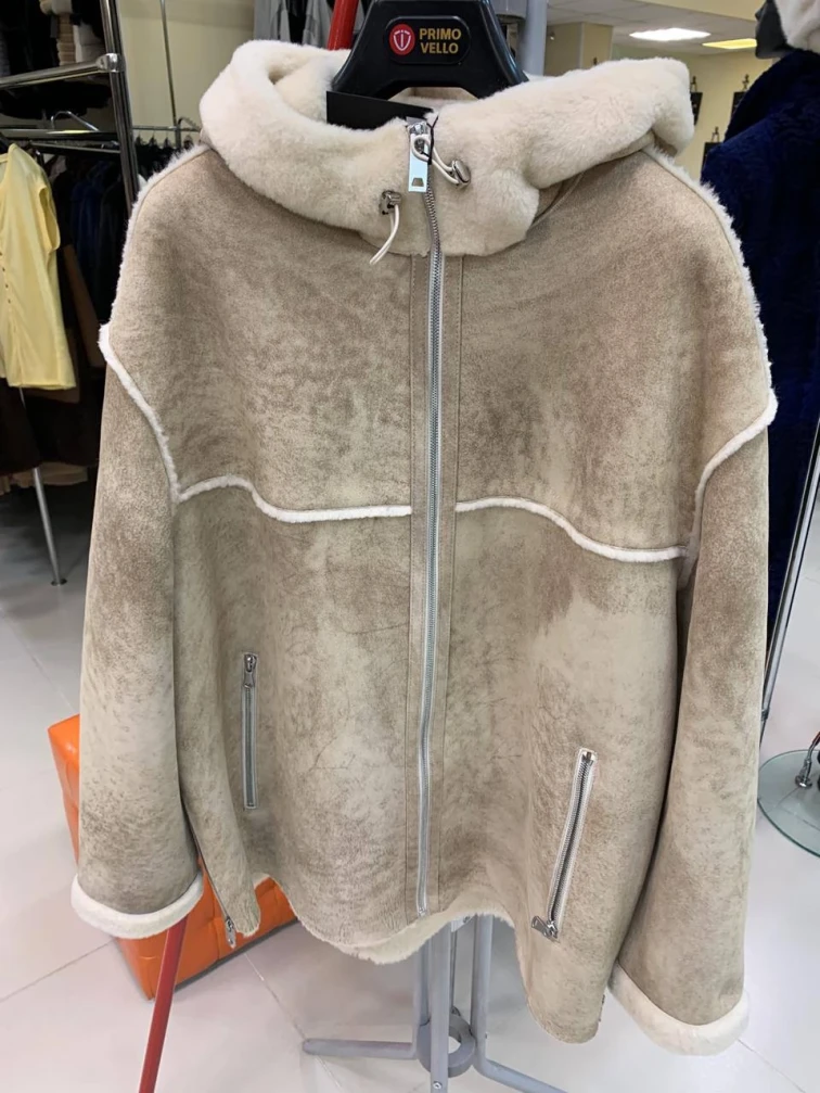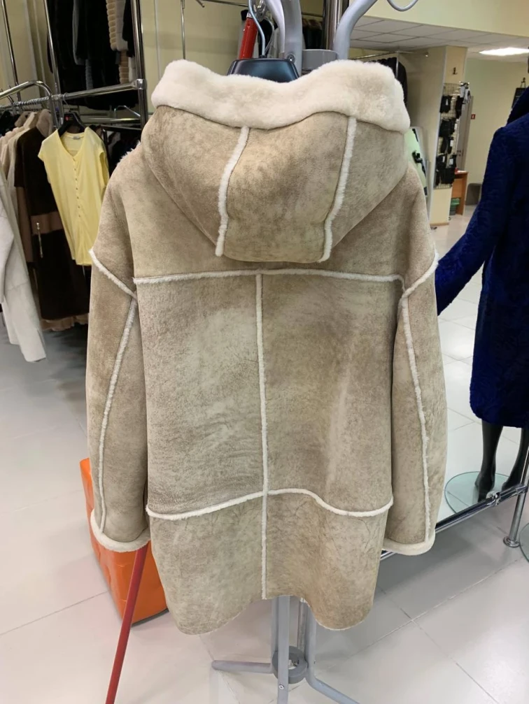Товар короткая женская дубленка с капюшоном 2075, бежевая, размер 44, артикул 65230. Рассчитан на сезон: зима. Длина изделия 75 см, силуэт свободный.