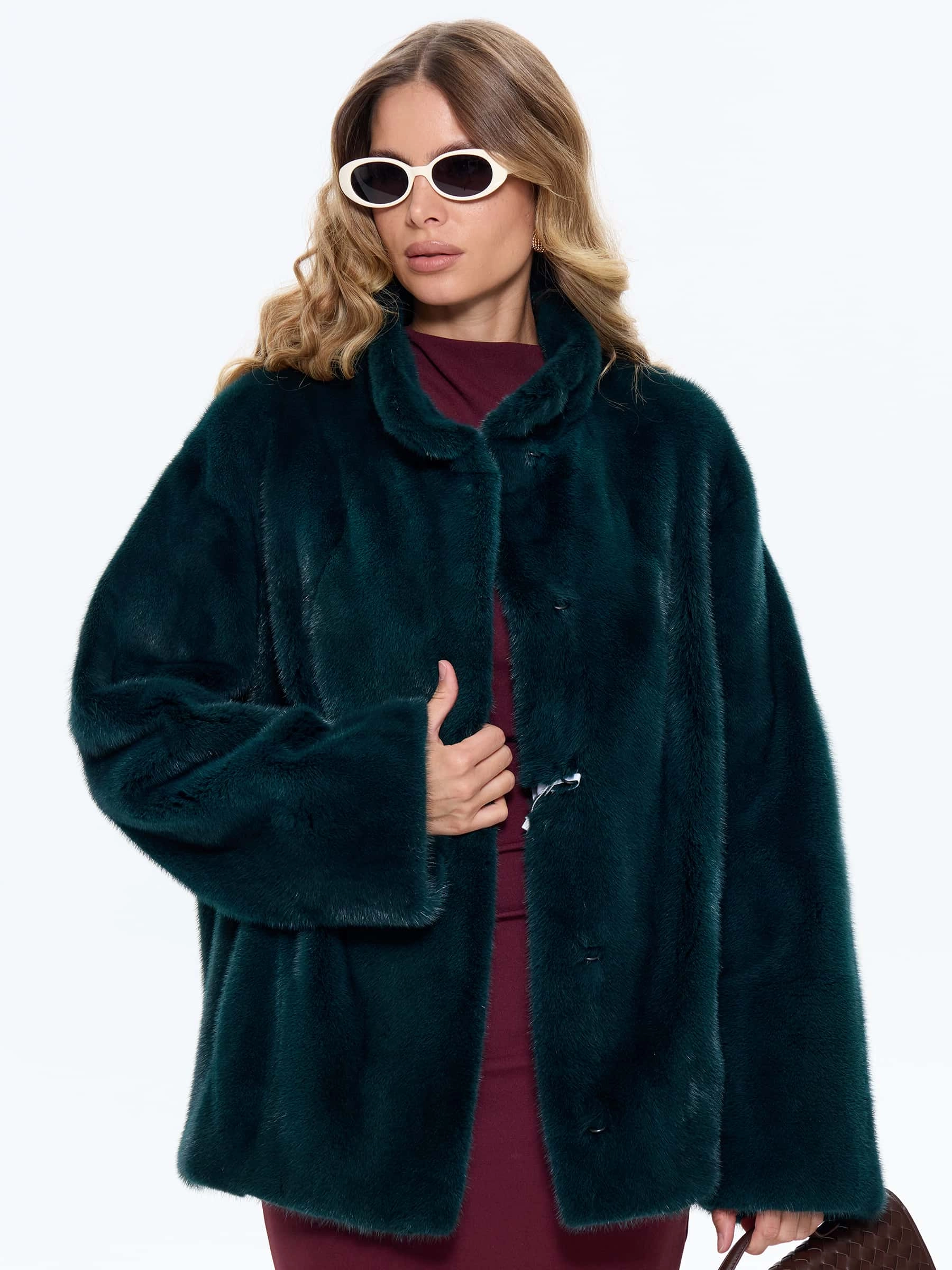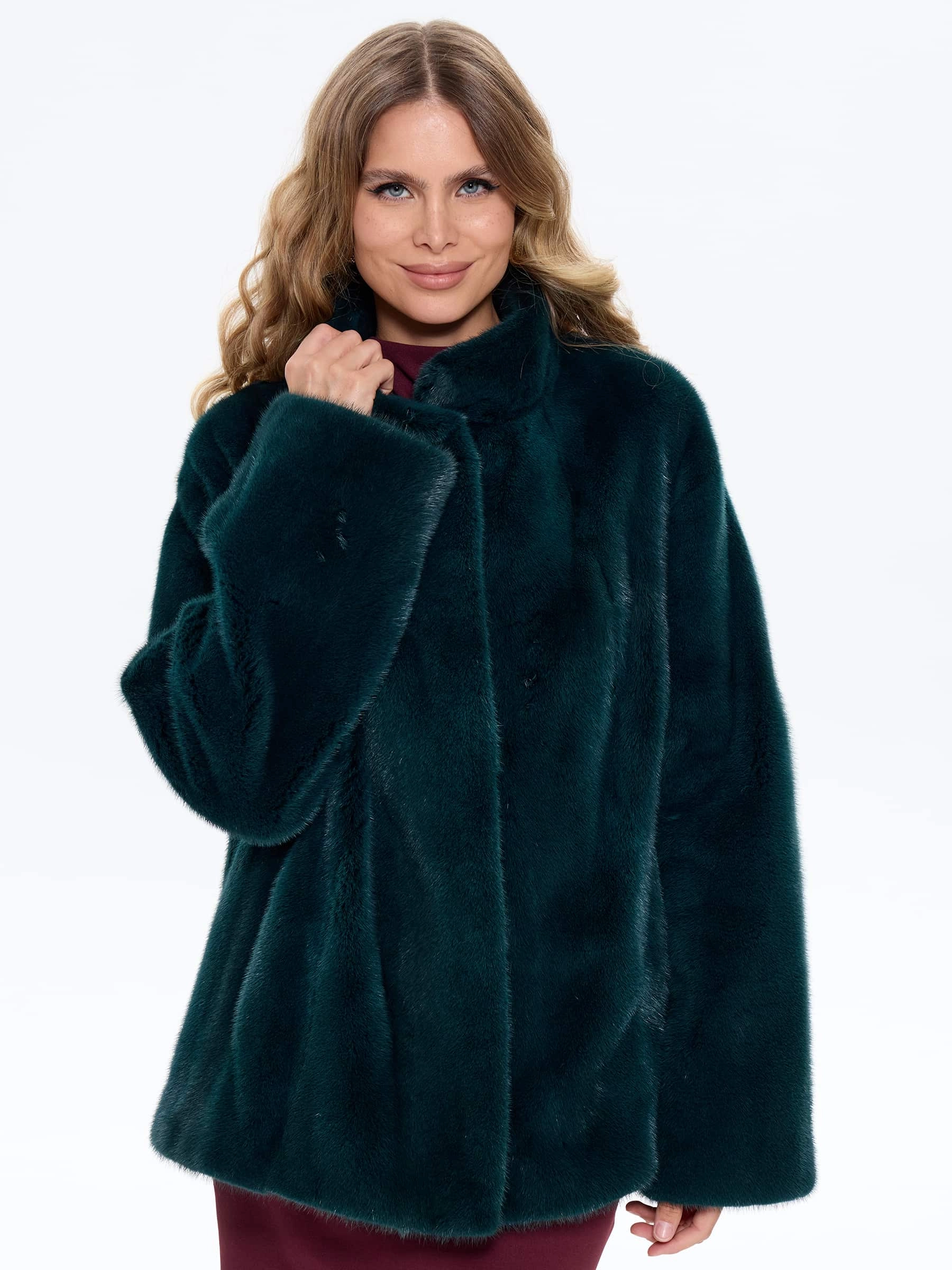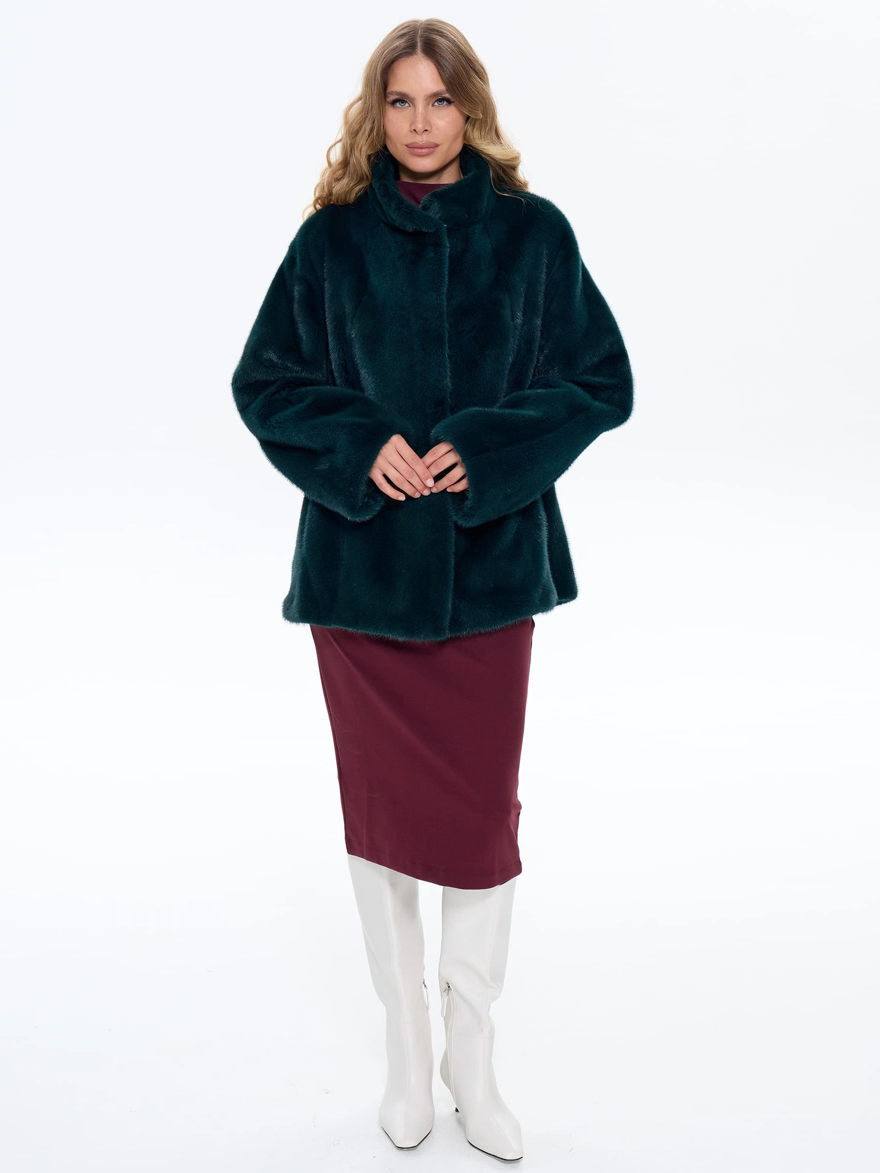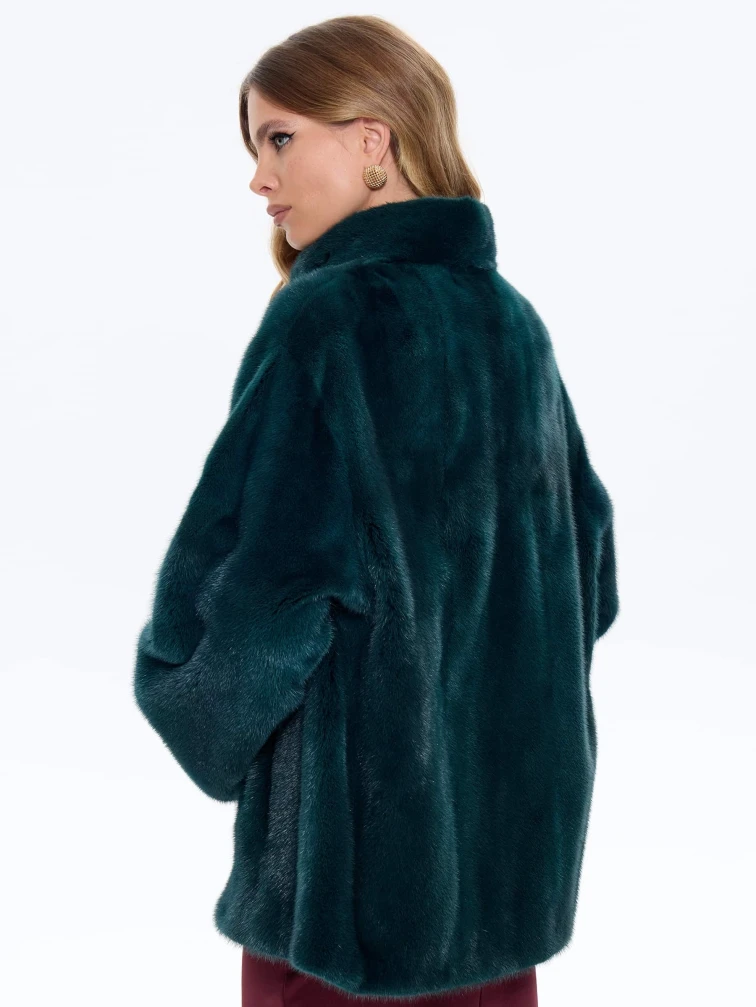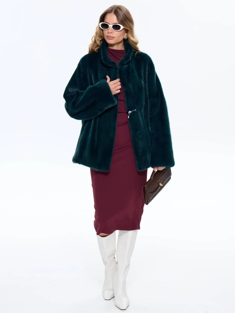 Стильная короткая куртка из меха норки премиум-класса насыщенного зеленого оттенка с элегантным воротником-стойкой. Свободный крой длиной 80 см со спущенной линией плеча создает современный силуэт, сочетающий непринужденную элегантность и уют. Стилисты рекомендуют носить эту куртку с кожаными брюками и уггами для повседневного образа или с юбкой-миди и сапогами на каблуке для вечернего выхода. Идеальный баланс классического шарма и современного дизайна для модниц, ценящих комфорт и роскошь.