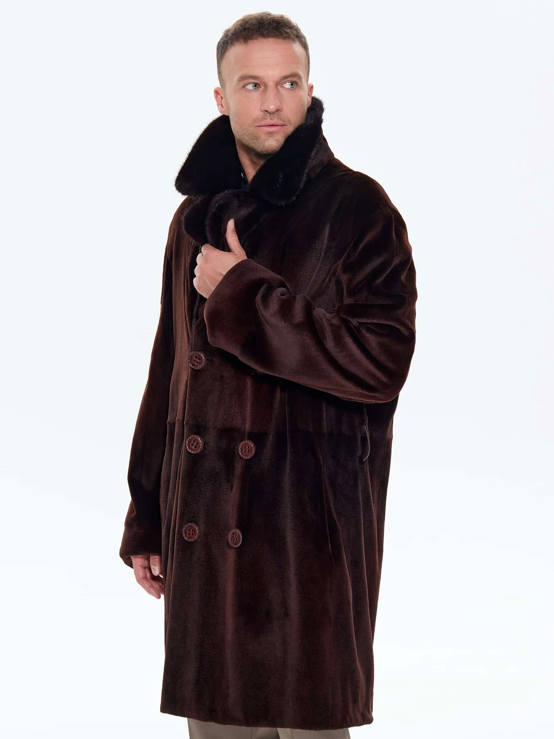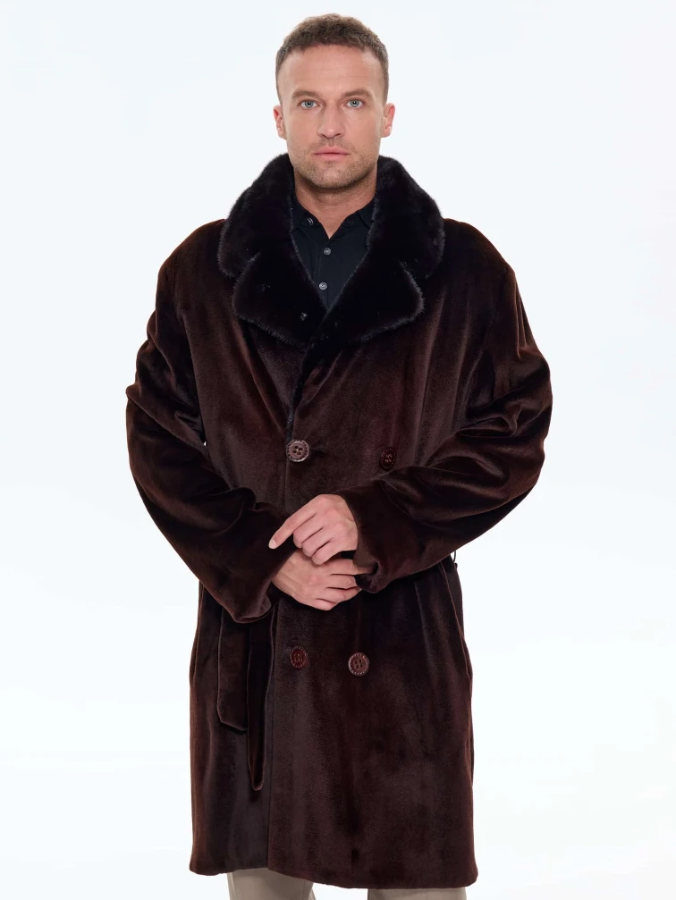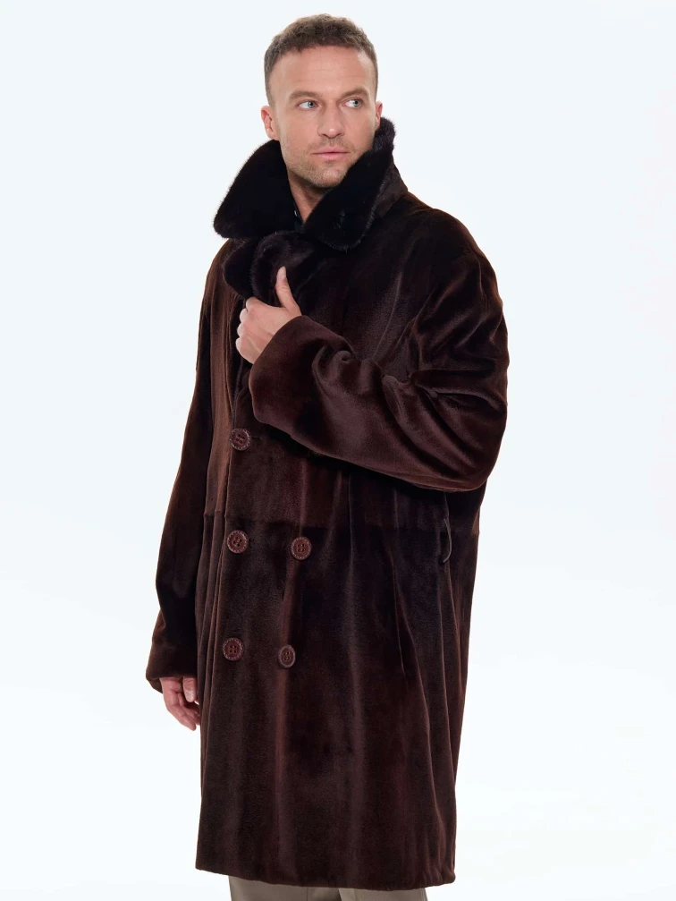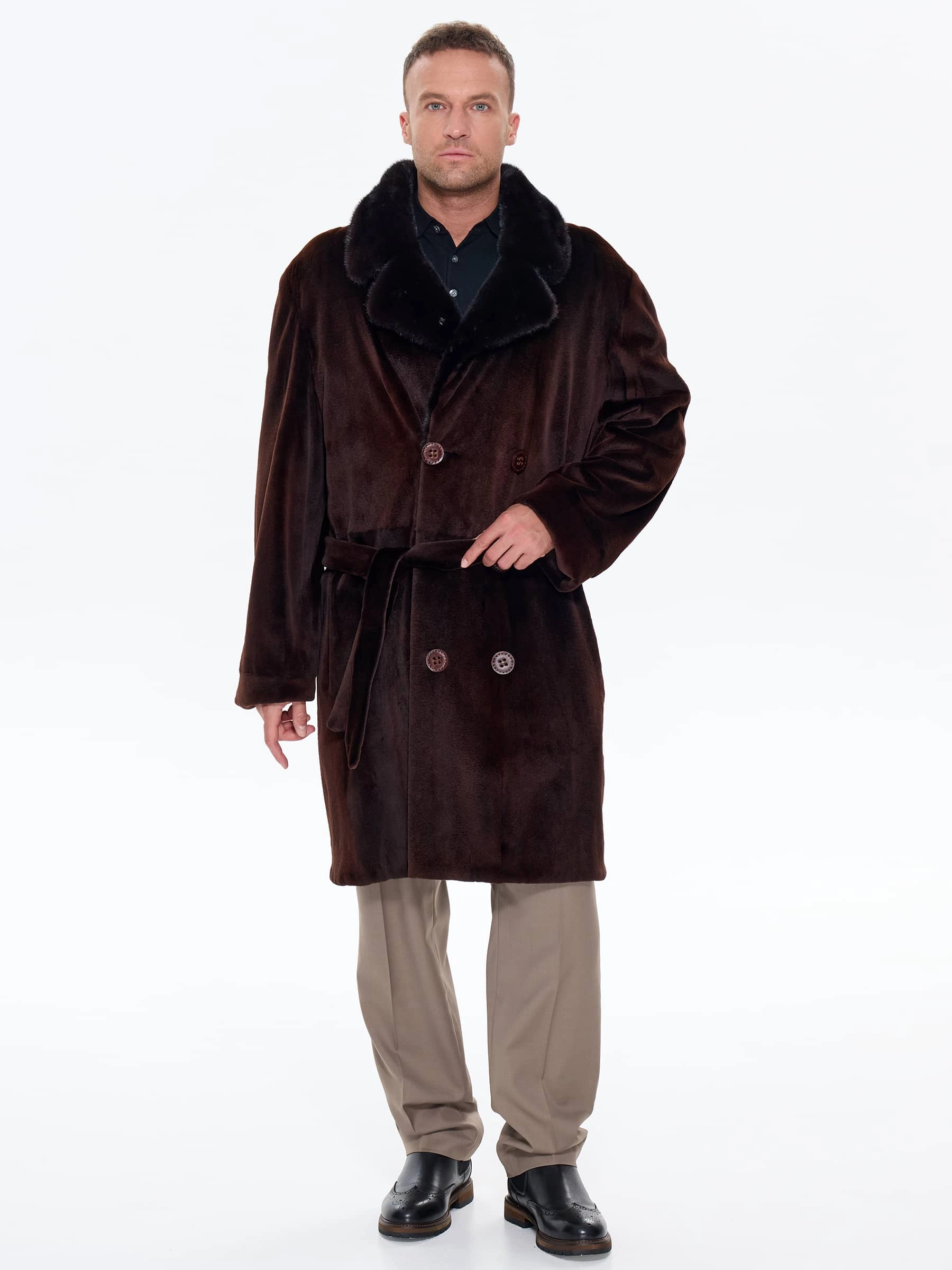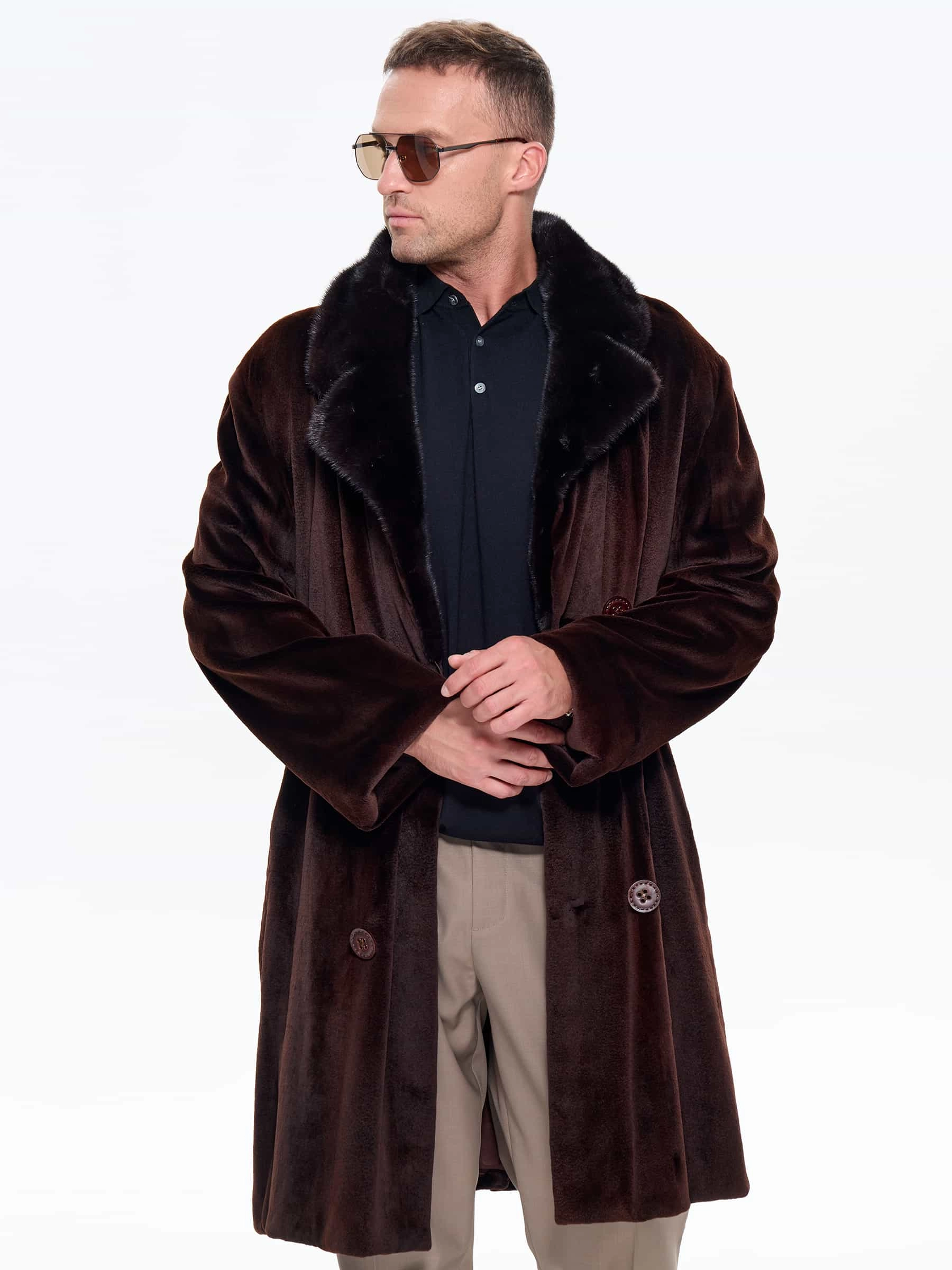 Для пошива двубортного мужского полупальто использовали щипаный мех норки с благородным матовым блеском. Прямой крой, английский воротник, два врезных и два внутренних кармана. Длина миди создают образ мужчины, для которого качество — не компромисс. Удобно в авто, общественном транспорте, при ходьбе. Максимальная защита от ветра и мороза. Изменить силуэт поможет широкий пояс. Застежка: крупные пуговицы.