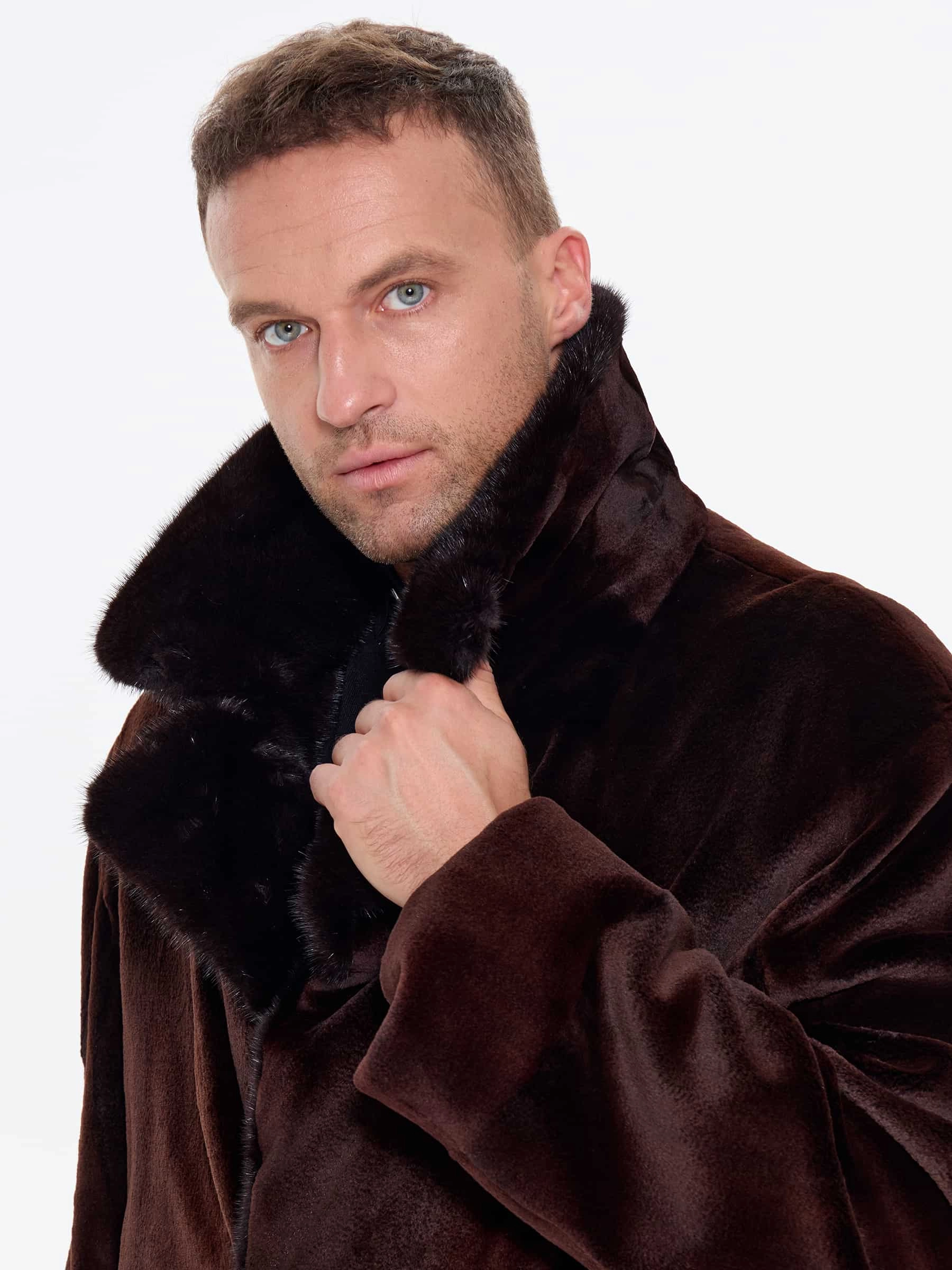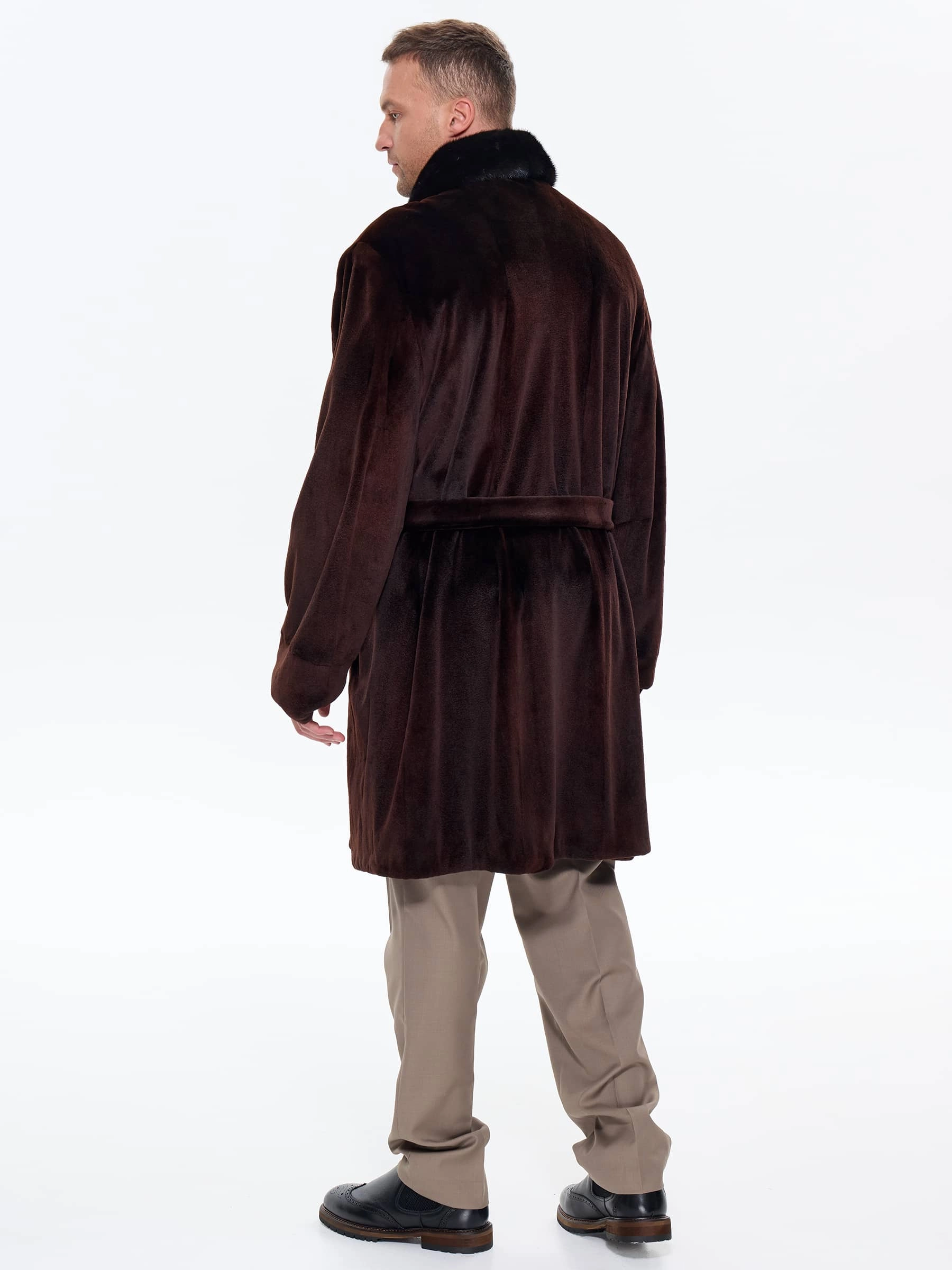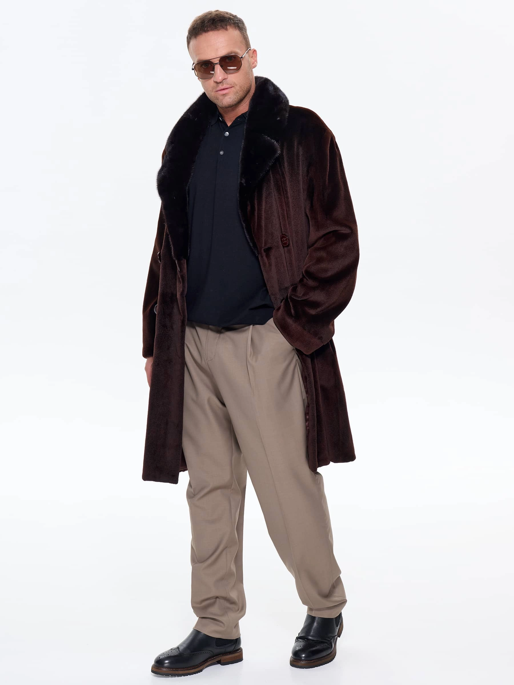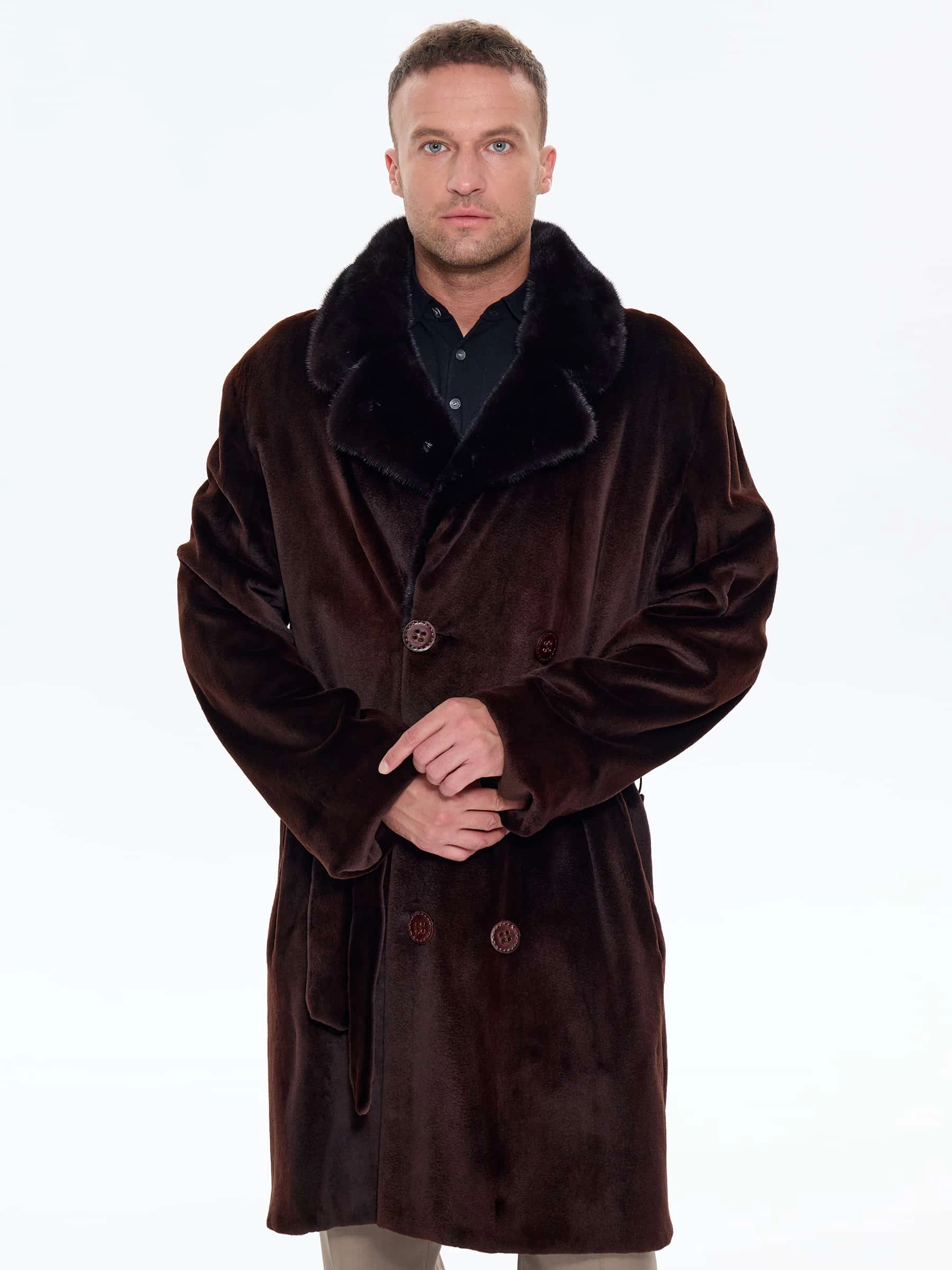 Для пошива двубортного мужского полупальто использовали щипаный мех норки с благородным матовым блеском. Прямой крой, английский воротник, два врезных и два внутренних кармана. Длина миди создают образ мужчины, для которого качество — не компромисс. Удобно в авто, общественном транспорте, при ходьбе. Максимальная защита от ветра и мороза. Изменить силуэт поможет широкий пояс. Застежка: крупные пуговицы.