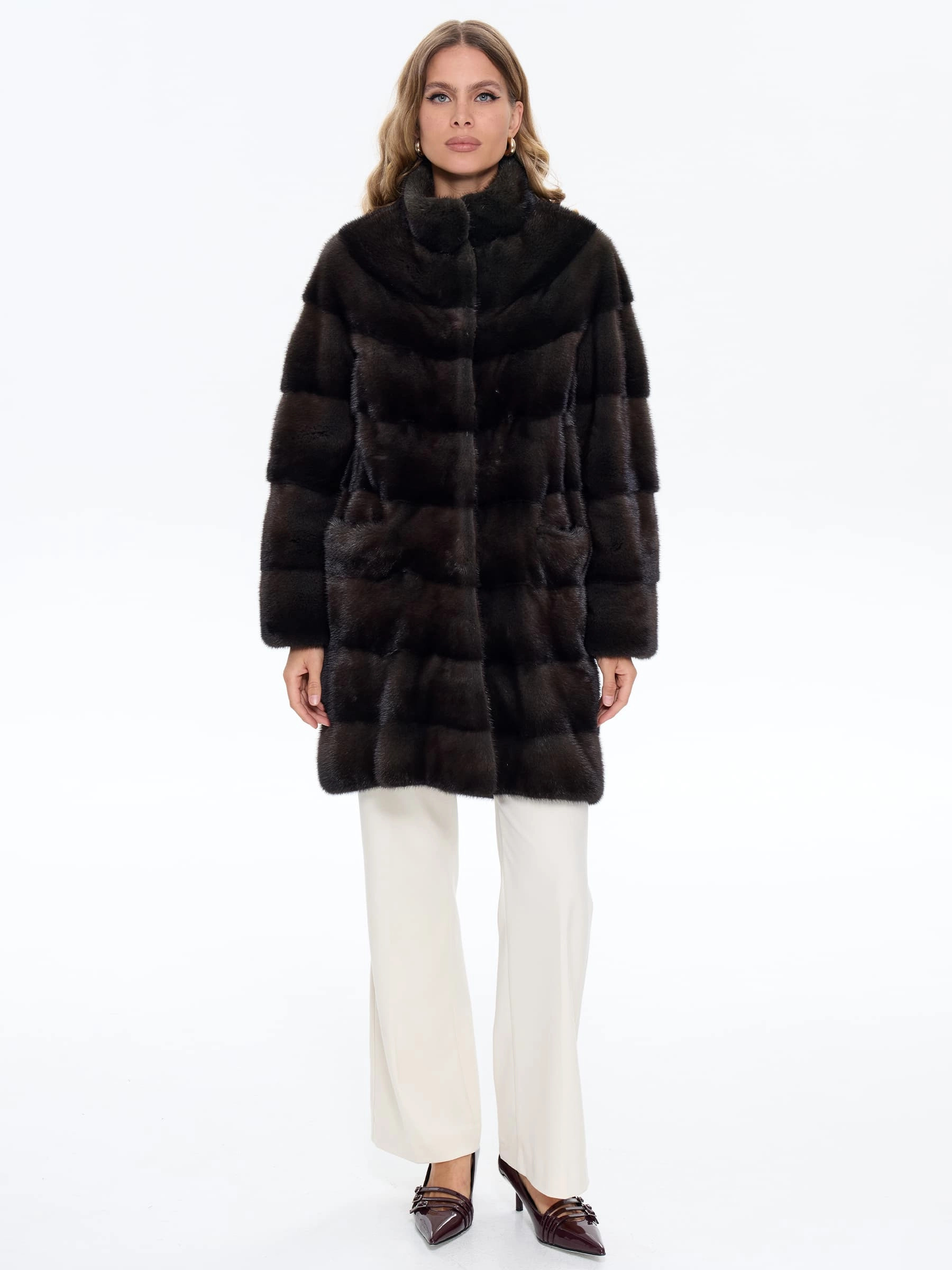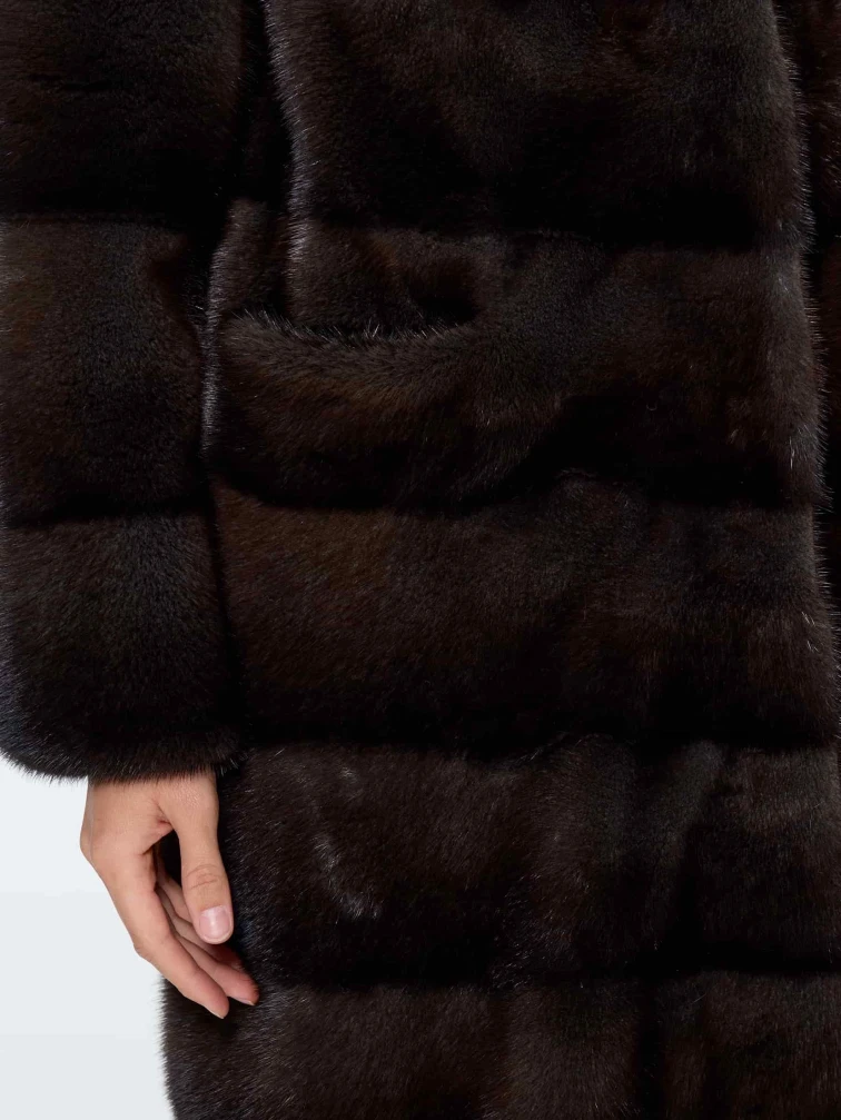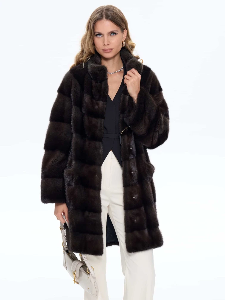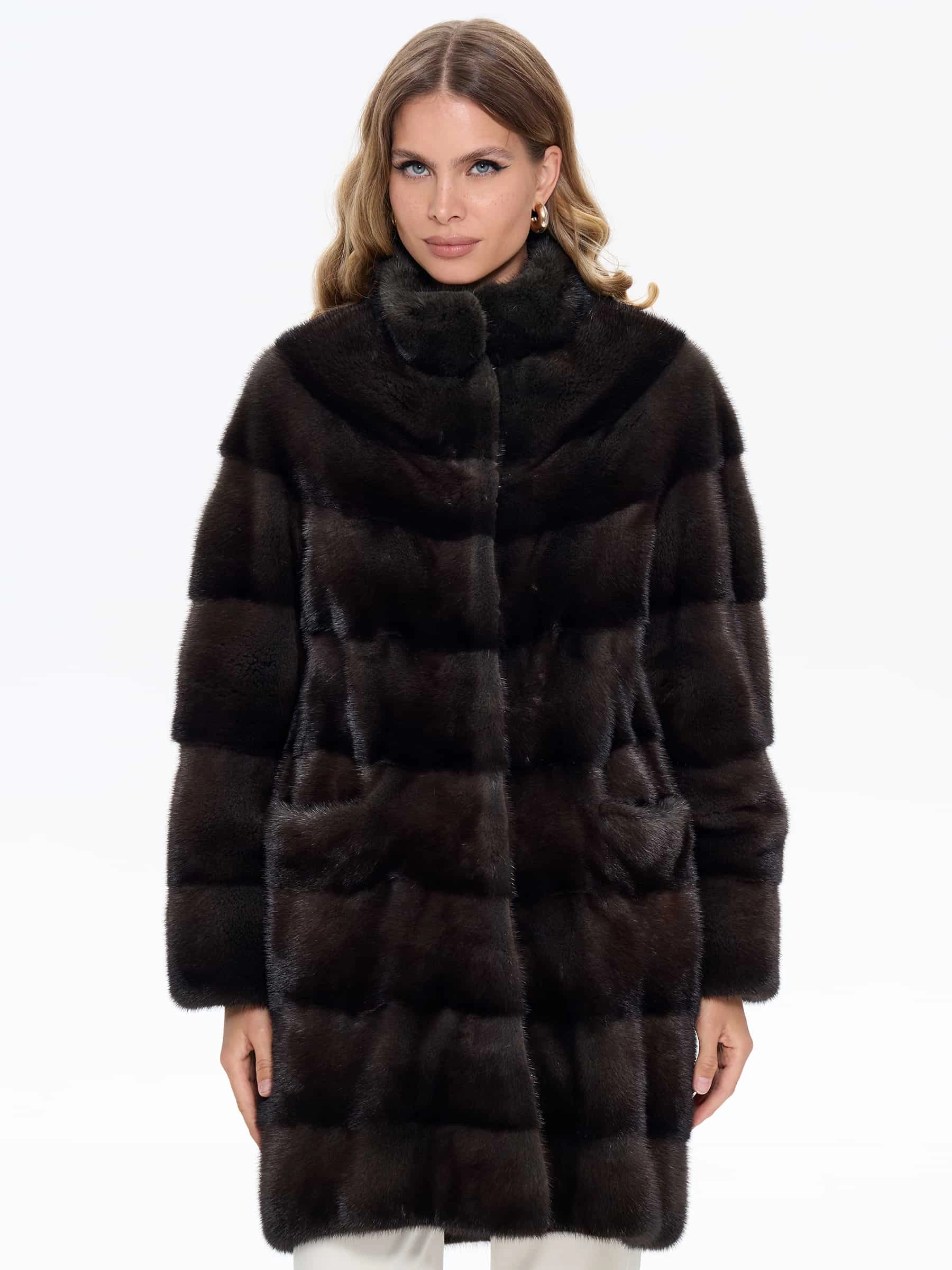 Классическое женское полупальто из густого шелковистого меха норки выполнено в поперечной раскладке. Универсальная длина ниже бедер, но короче классического пальто, подчеркивает талию и удобна для города. Два боковых кармана добавляют практичности. Спущенный крой рукавов создает мягкую линию плеч, сохраняя свободу движений. Воротник-стойка защищает от ветра, не перегружая силуэт. Скрытые клипсы-застежки обеспечивают аккуратный вид и бережное обращение с мехом. Это полупальто сочетает классическую элегантность с современным комфортом.
