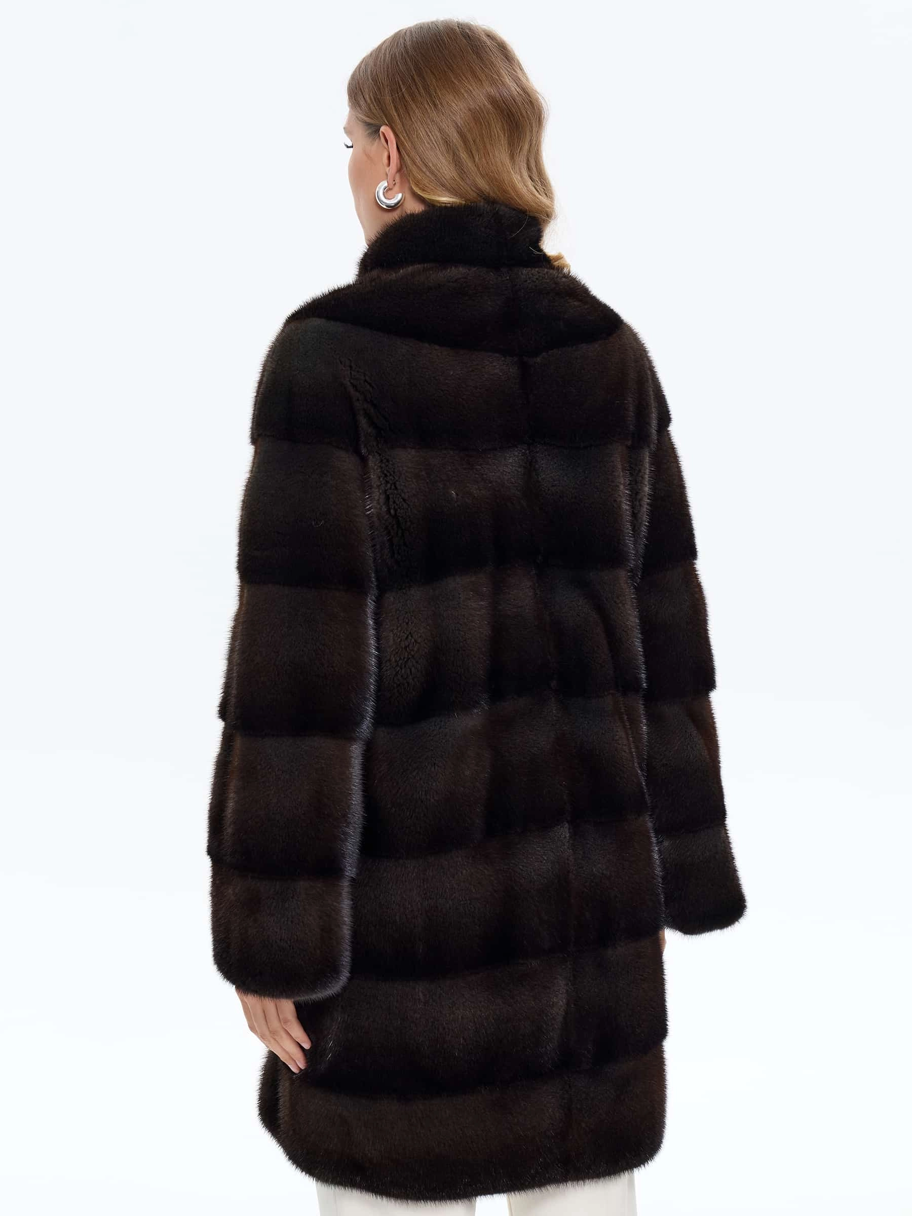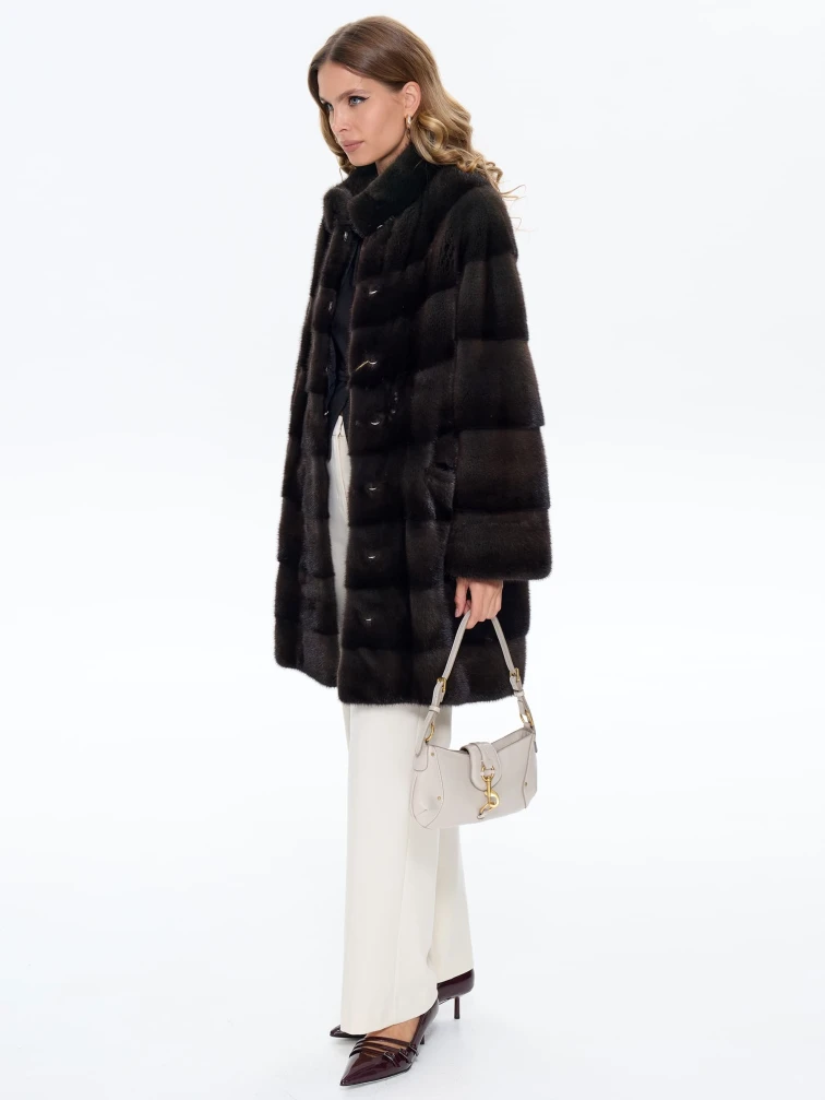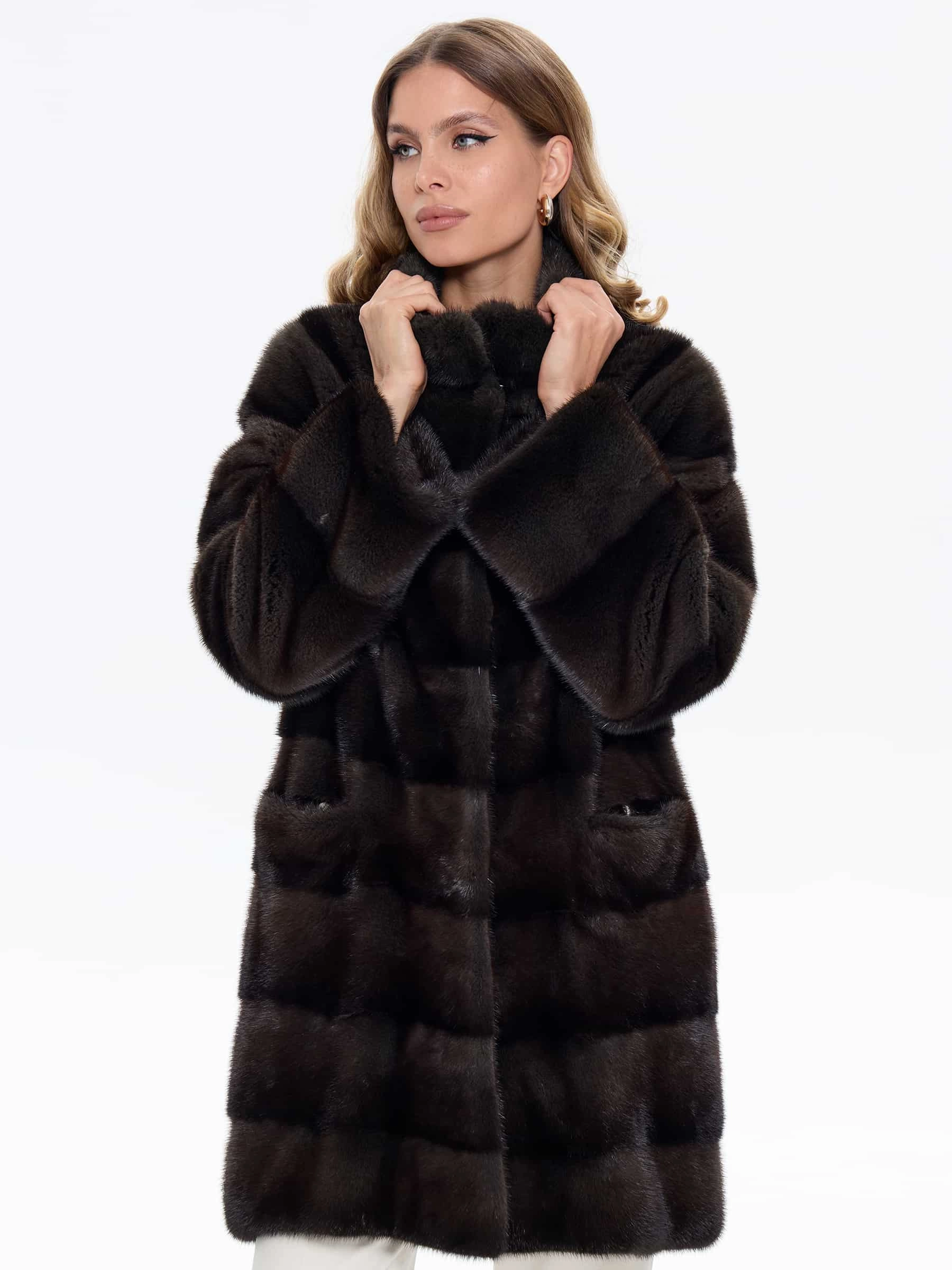 Классическое женское полупальто из густого шелковистого меха норки выполнено в поперечной раскладке. Универсальная длина ниже бедер, но короче классического пальто, подчеркивает талию и удобна для города. Два боковых кармана добавляют практичности. Спущенный крой рукавов создает мягкую линию плеч, сохраняя свободу движений. Воротник-стойка защищает от ветра, не перегружая силуэт. Скрытые клипсы-застежки обеспечивают аккуратный вид и бережное обращение с мехом. Это полупальто сочетает классическую элегантность с современным комфортом.