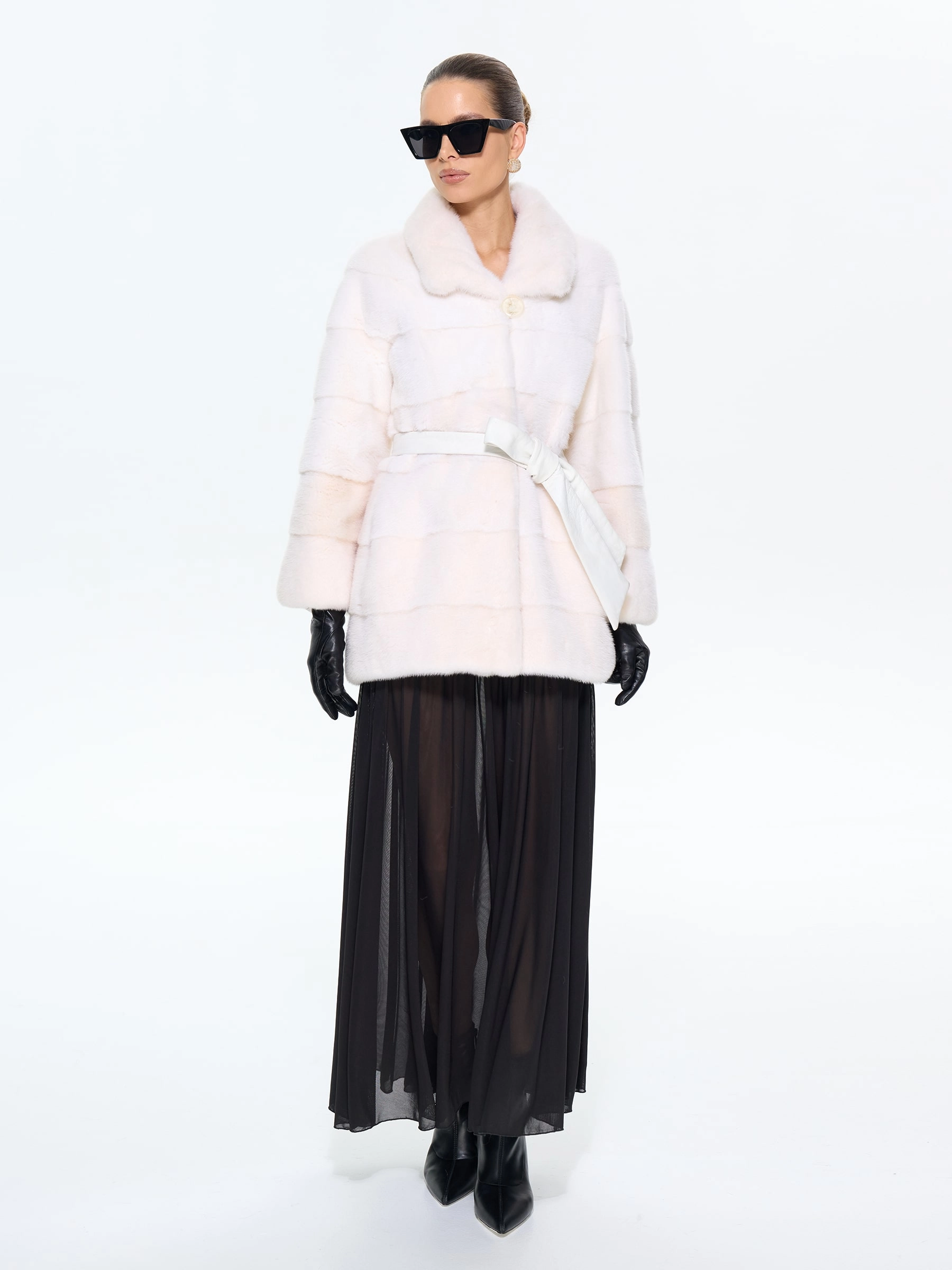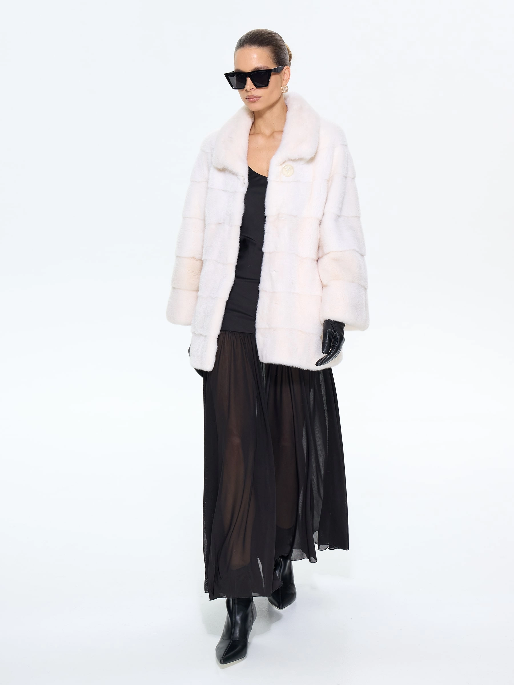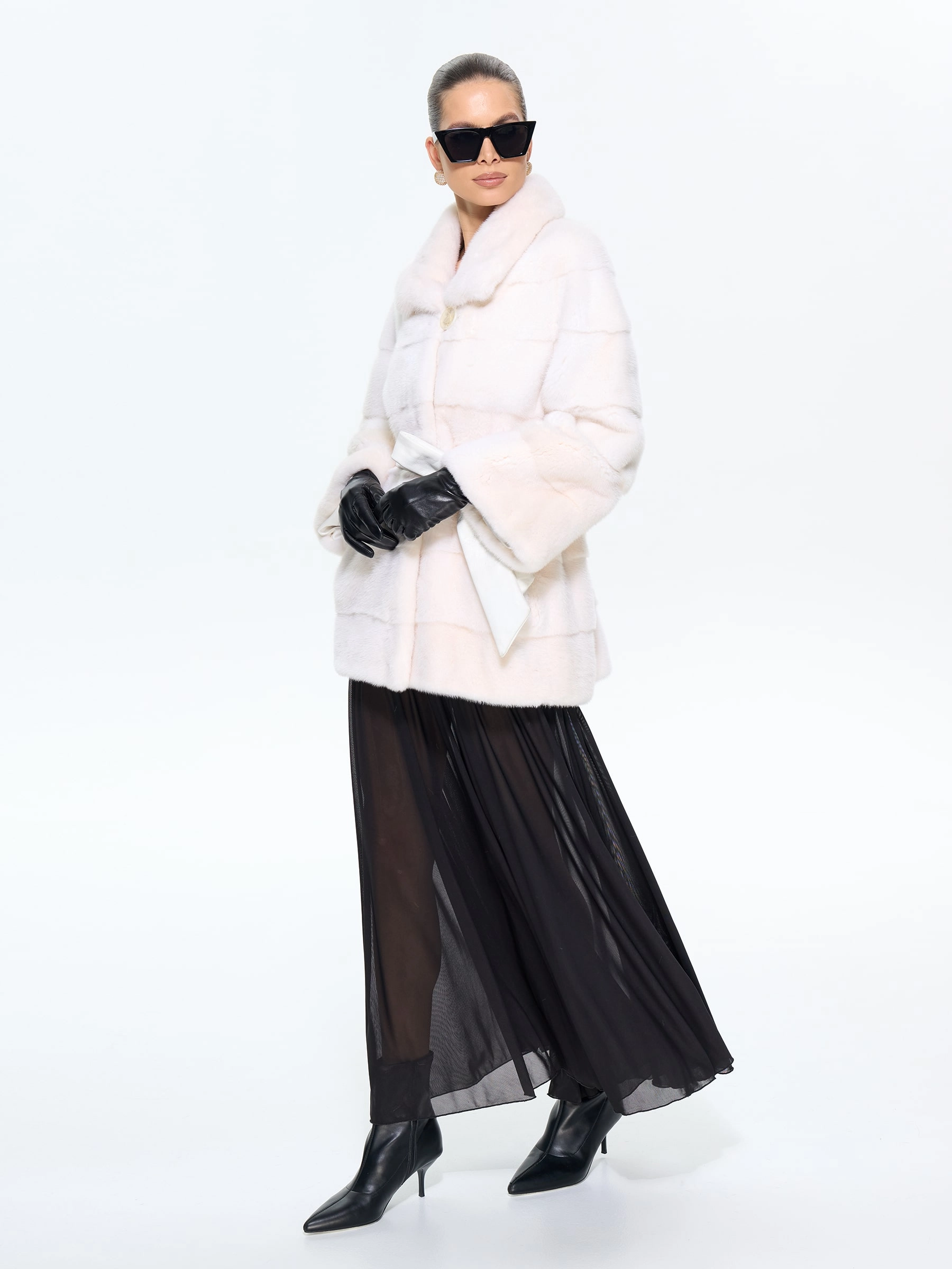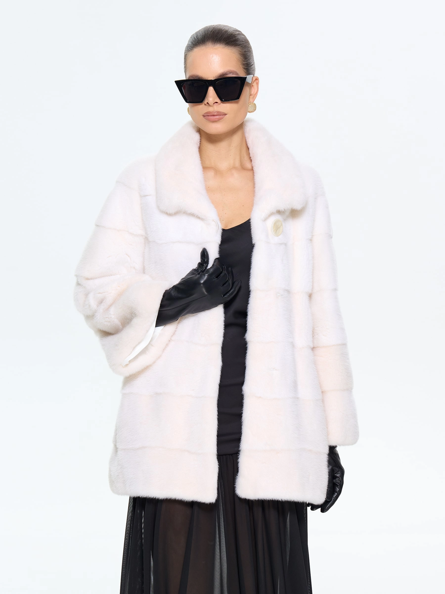 Короткая шуба BRASCHI из белоснежного меха натуральной норки в поперечной раскладке сочетает практичность и роскошь. Шкурки, выложенные перпендикулярно хребтовой линии, создают выразительную полосатую текстуру. Удобный крой с рукавом реглан и укороченным силуэтом подходит для активной жизни, подчеркивая стройность ног. Многофункциональный воротник адаптируется к любому образу — от строгой стойки до драпированных складок. Два боковых кармана и скрытые клипсы дополняют этот элегантный дизайн.