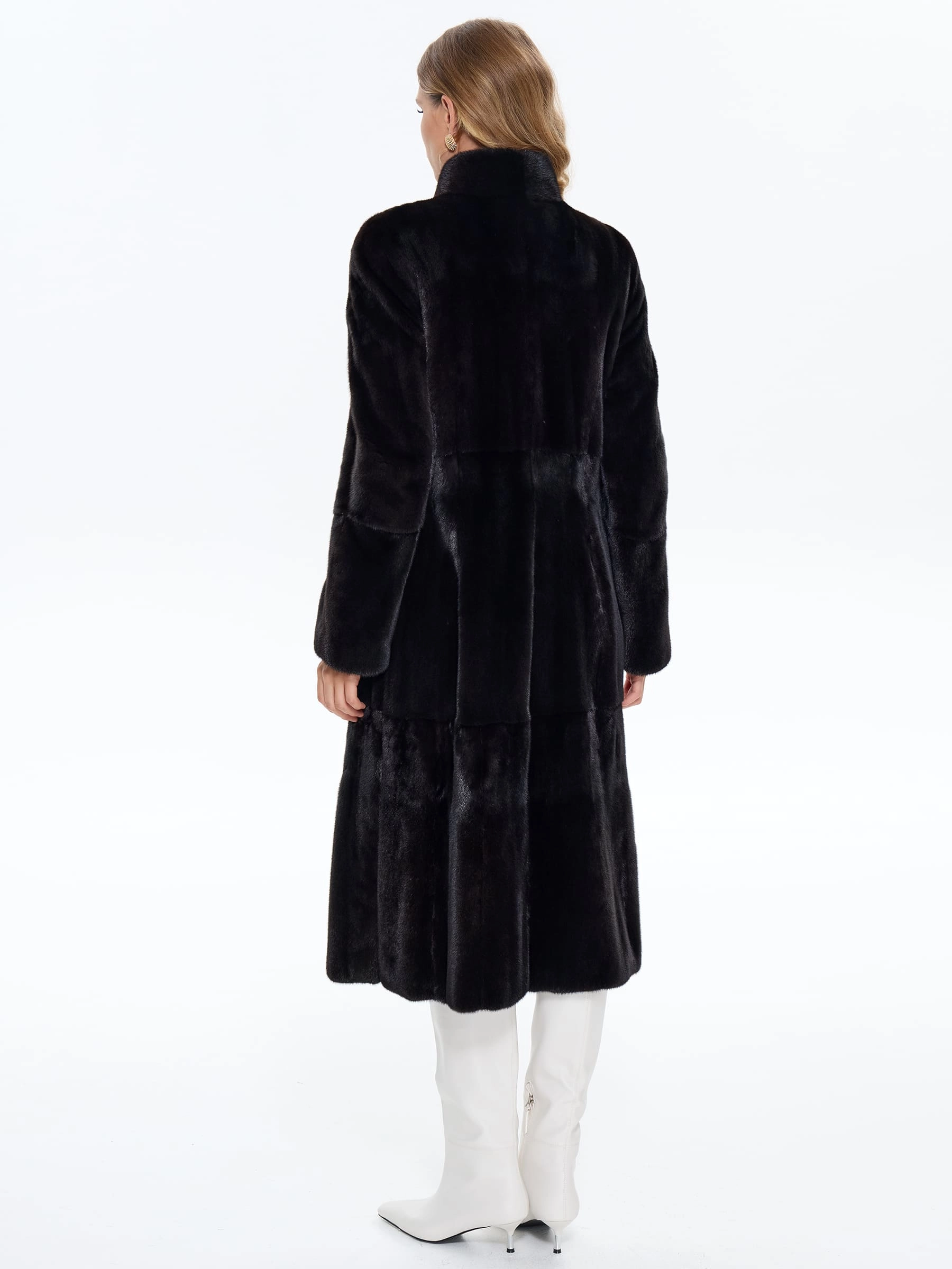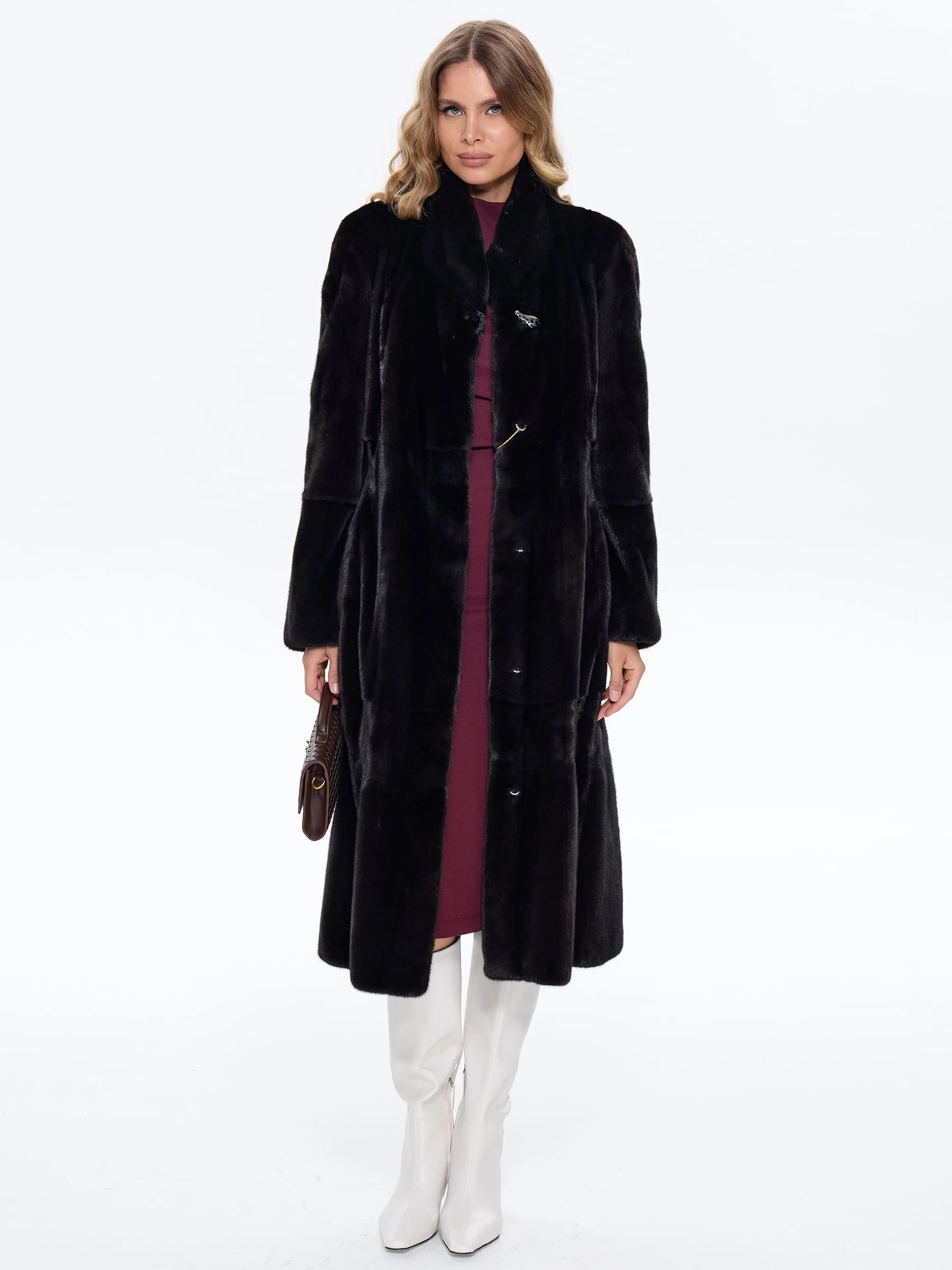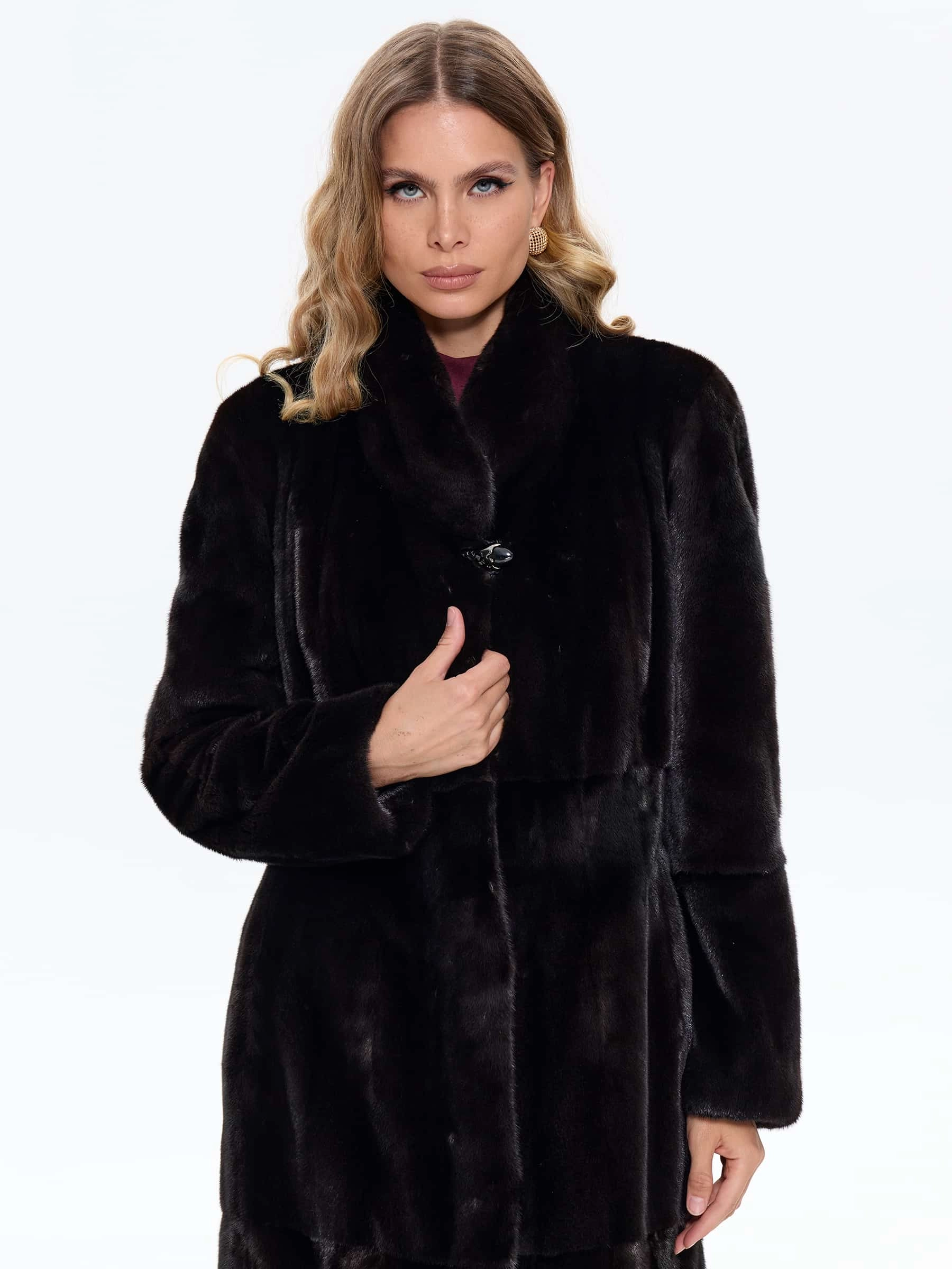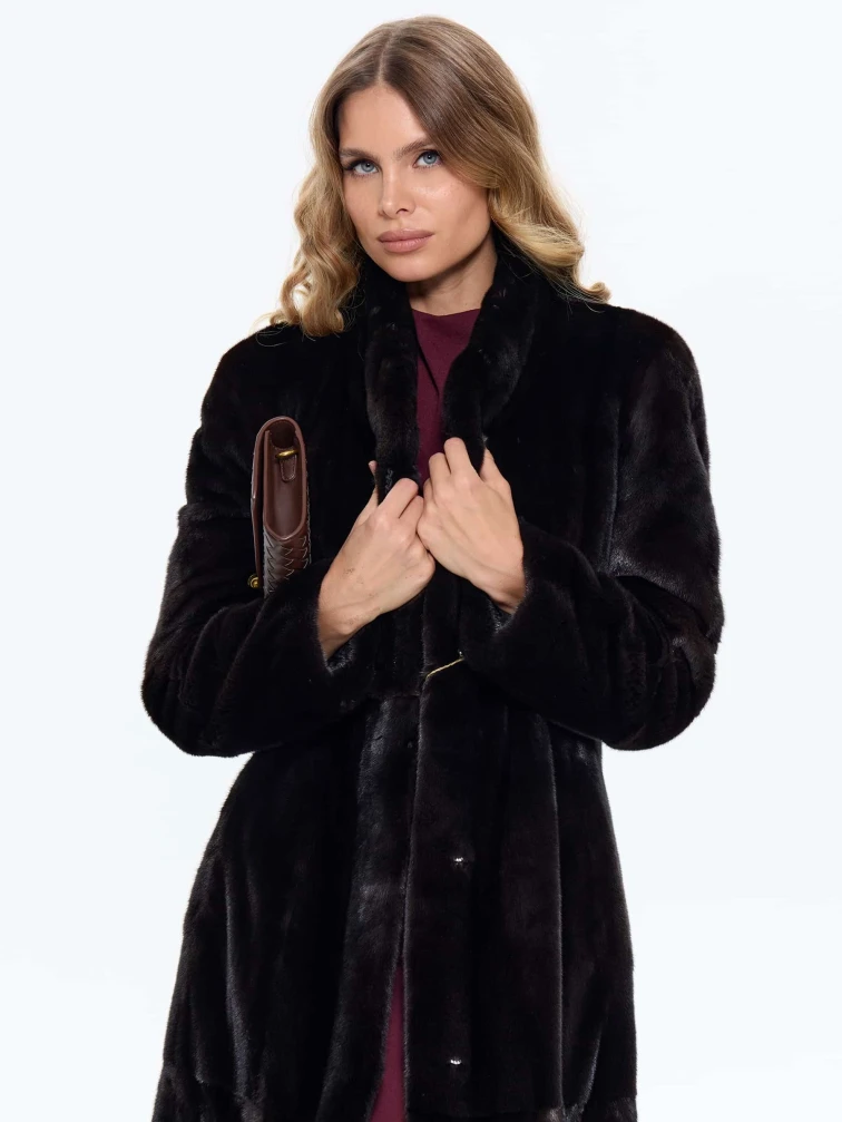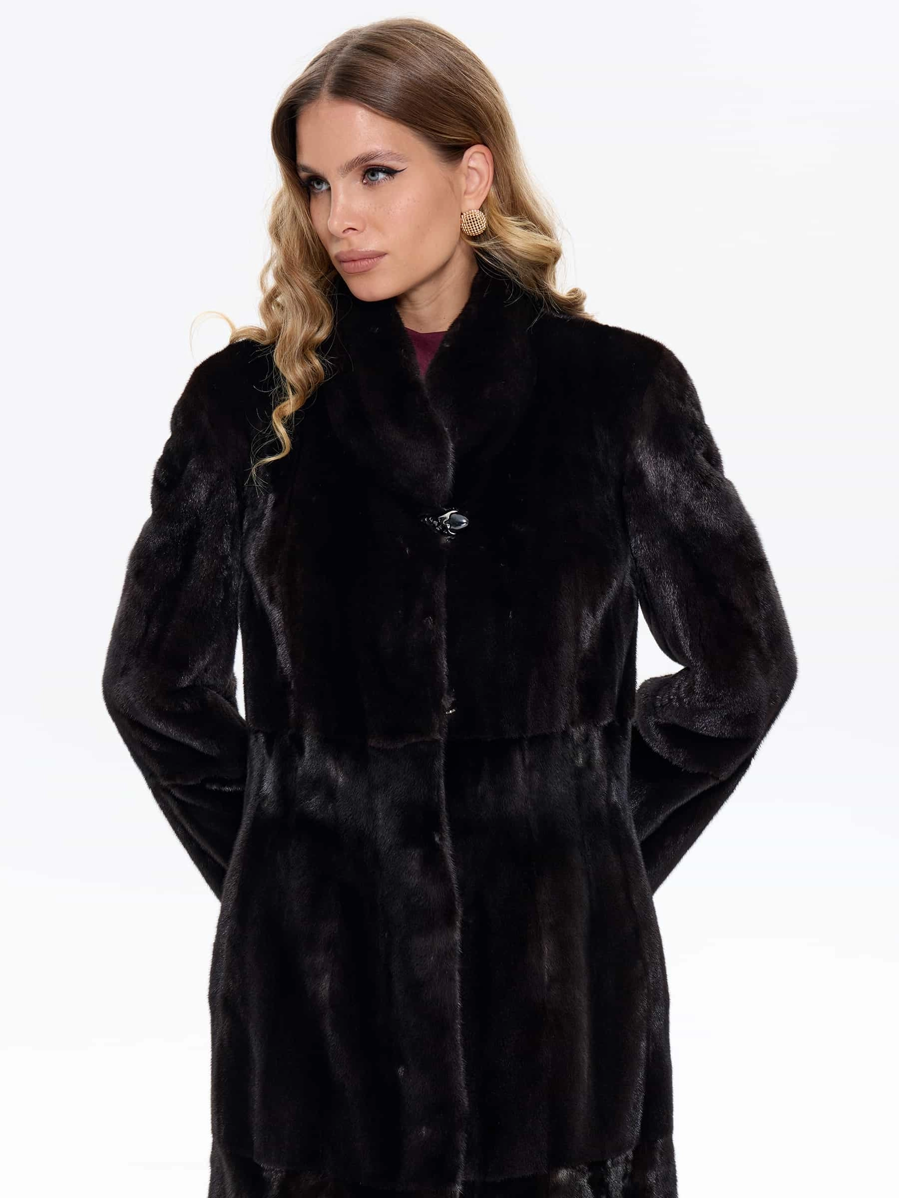 Для пошива длинной классической шубы мастера использовали нежный густой мех норки глубокого черного цвета. Полуприлегающий крой с анатомическими вытачками в талии подчеркивает силуэт, не стягивая фигуру, и дополнен двумя боковыми карманами. Строгая шалевидная стойка обеспечивает защиту в ветреную погоду, а свободный крой от бедра мягко маскирует особенности фигуры. Изделие отлично сохраняет тепло в зимние морозы. Застёжка выполнена на невидимых клипсах с прочным титановым покрытием.