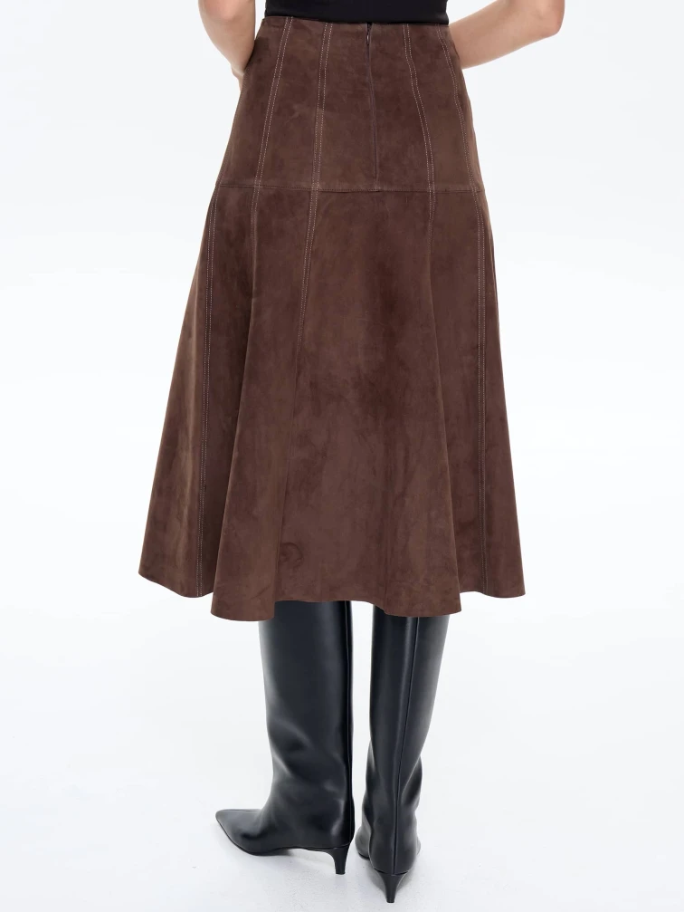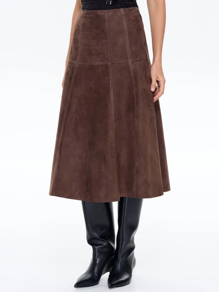 Юбка-миди из мягкой натуральной замши в насыщенном светло-коричневом цвете с контрастной отстрочкой сочетает полуприлегающий крой с элегантным клешем. Контрастная строчка и потайная застежка добавляют модели изысканности, а универсальный оттенок делает ее идеальной для создания разных образов — от повседневных с объемными свитерами до вечерних с шелковыми блузами. Качественная замша гарантирует комфорт и долговечность.