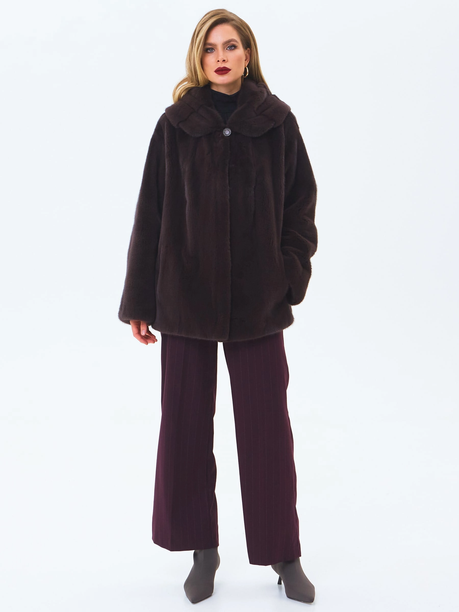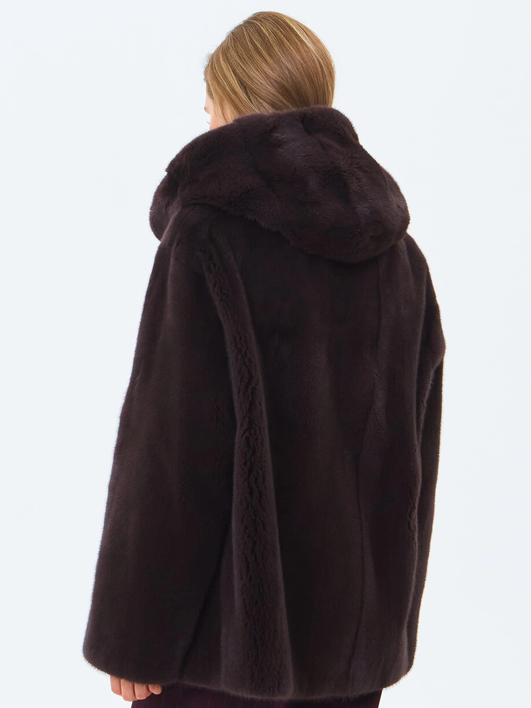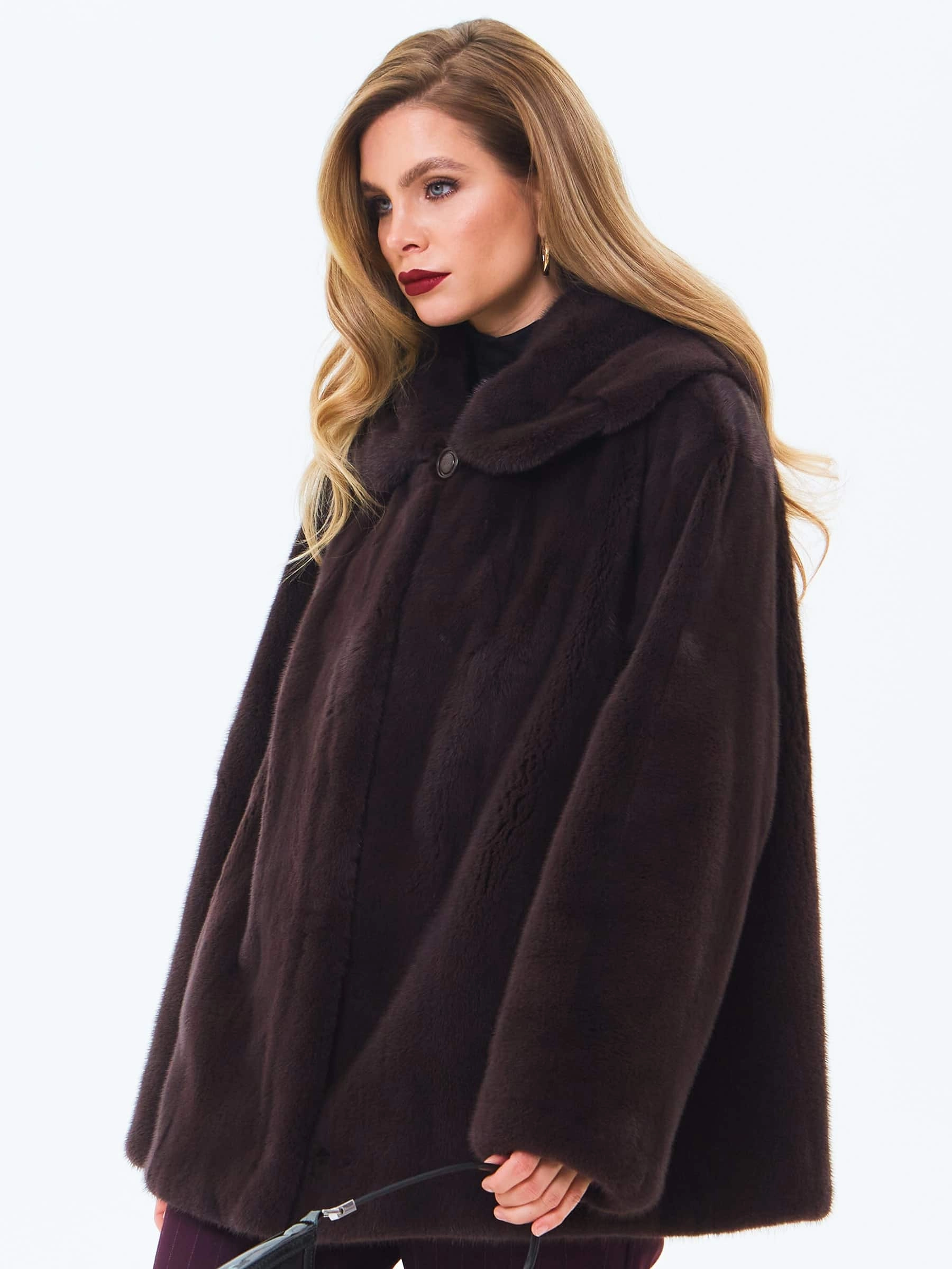 Для пошива короткой шубы с глубоким капюшоном и спущенной линией плеча использовали густой нежный мех норки. Свободная модель с двумя врезными боковыми карманами застегивается металлическими клипсами.