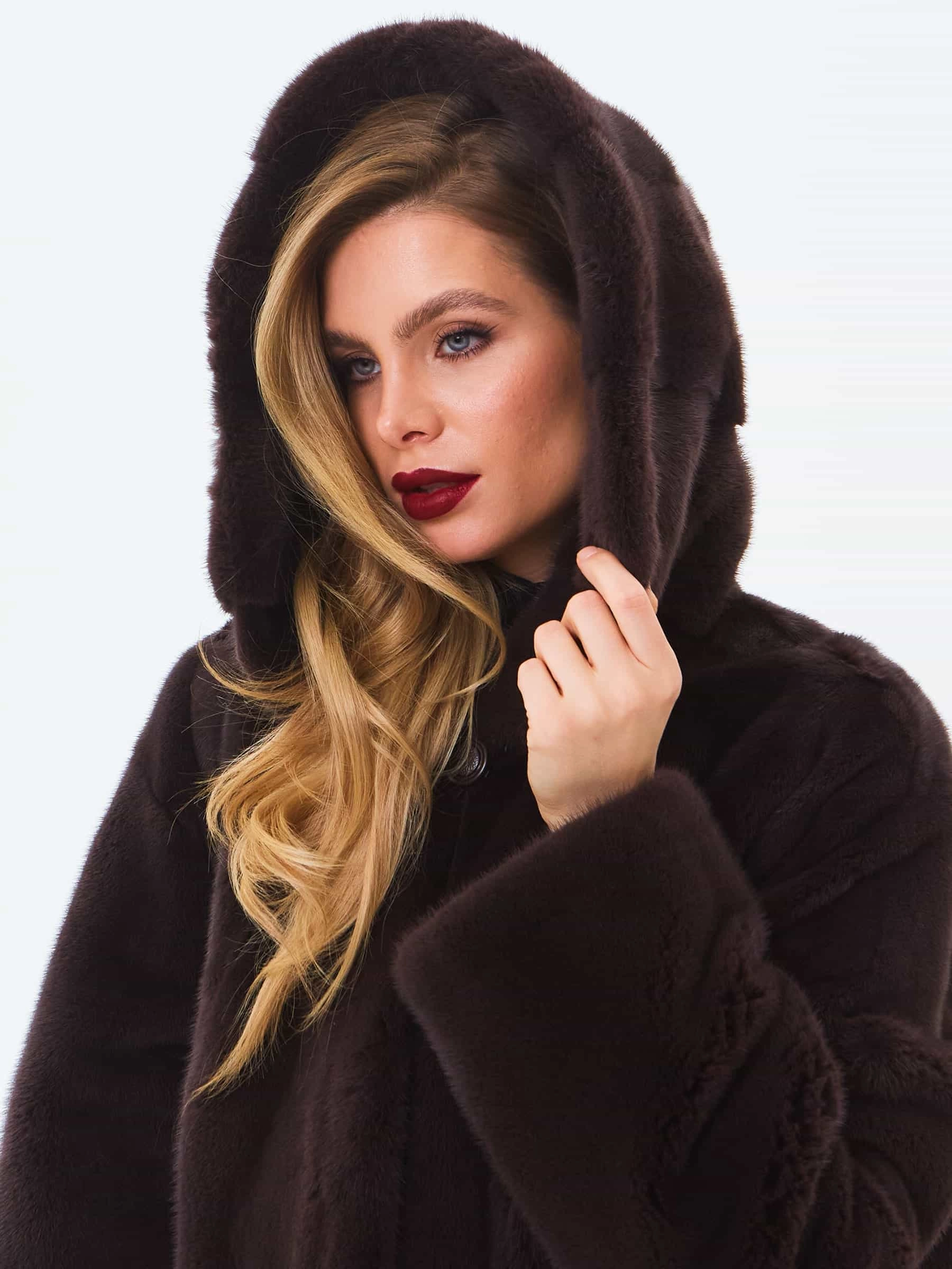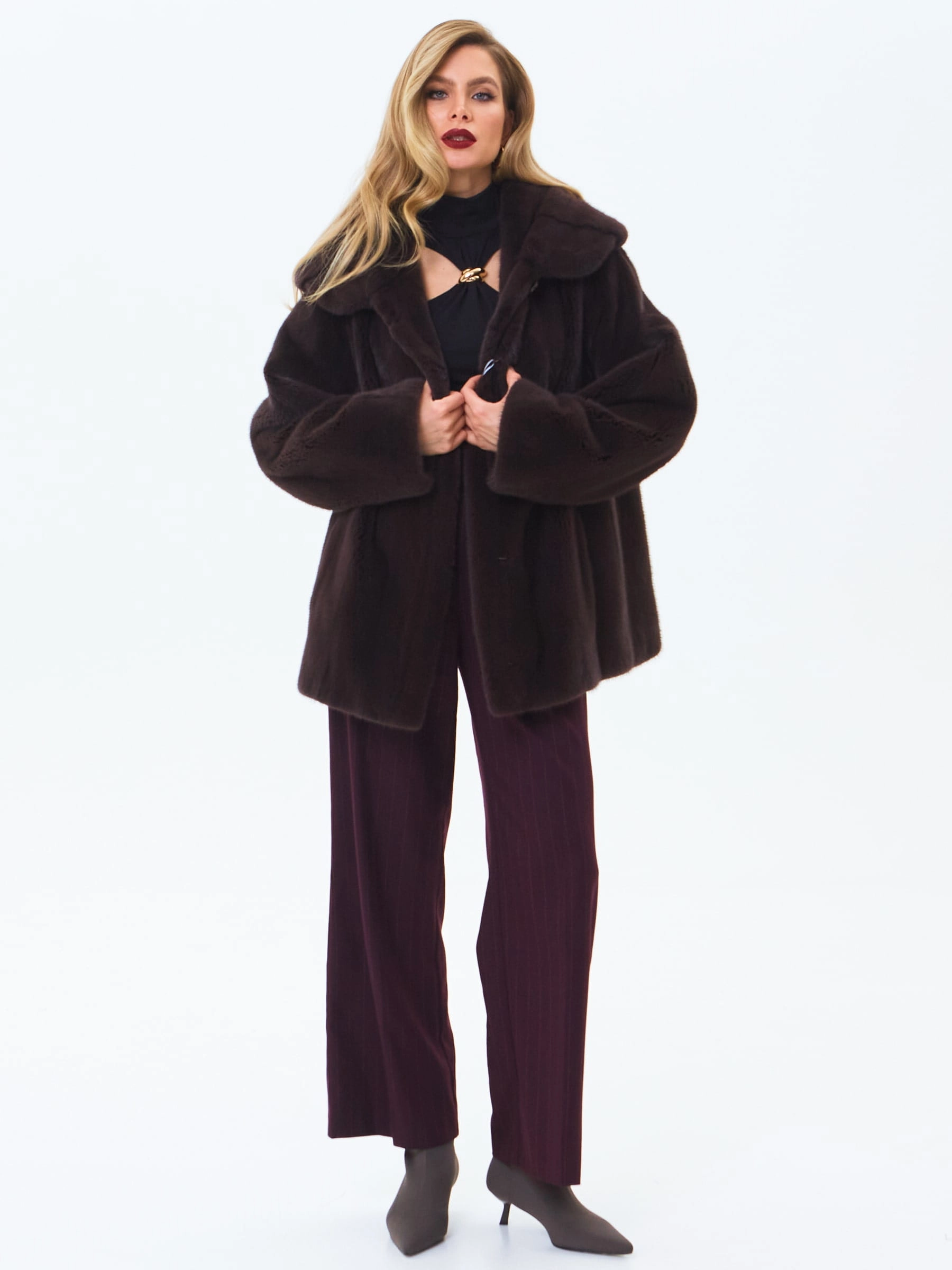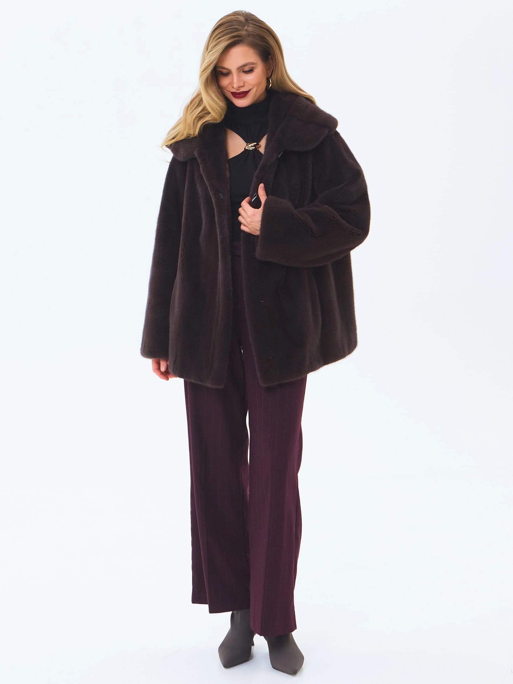 Для пошива короткой шубы с глубоким капюшоном и спущенной линией плеча использовали густой нежный мех норки. Свободная модель с двумя врезными боковыми карманами застегивается металлическими клипсами.