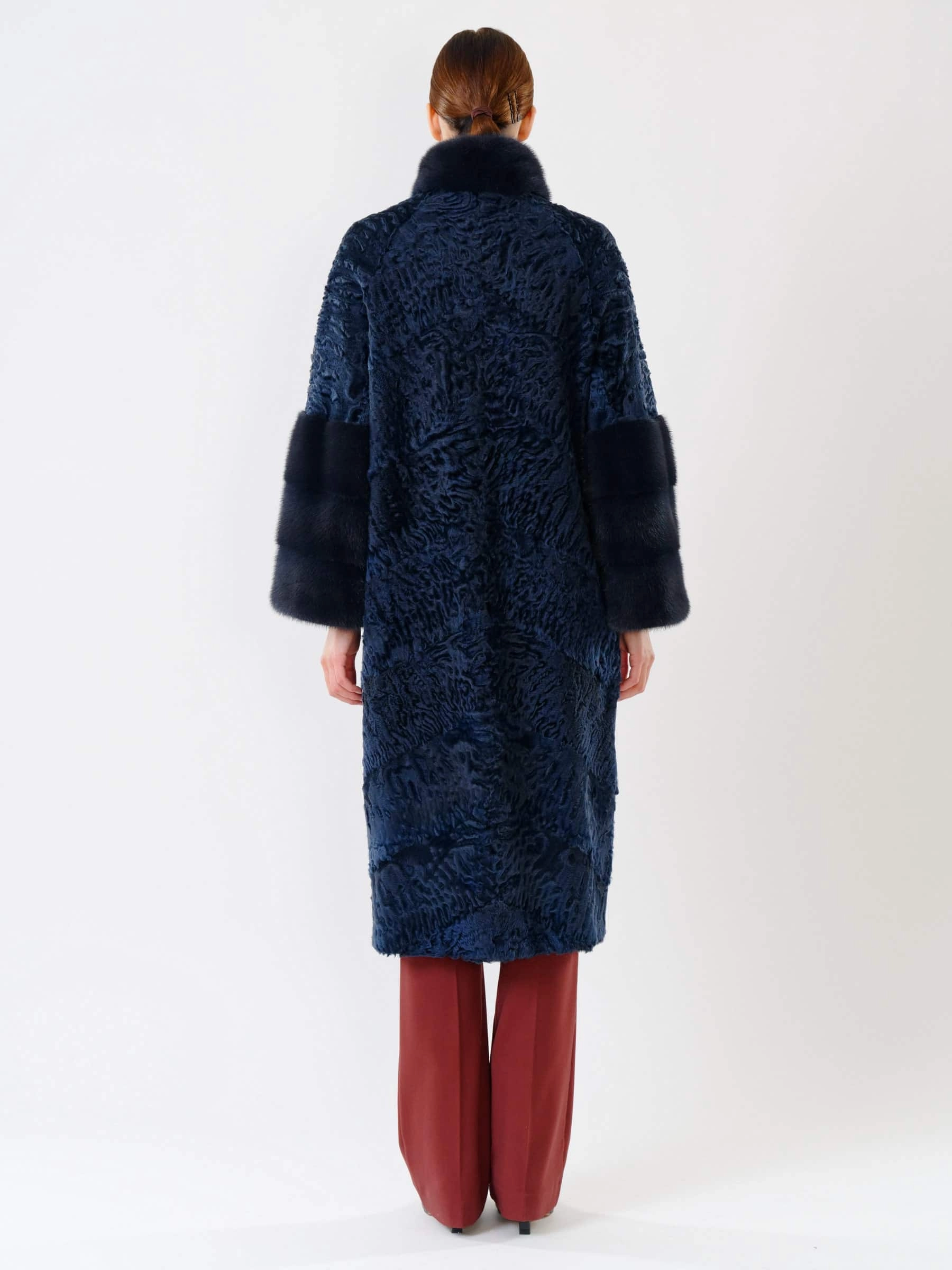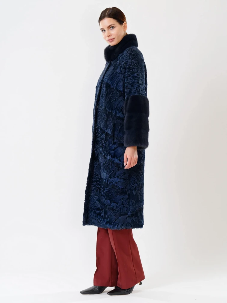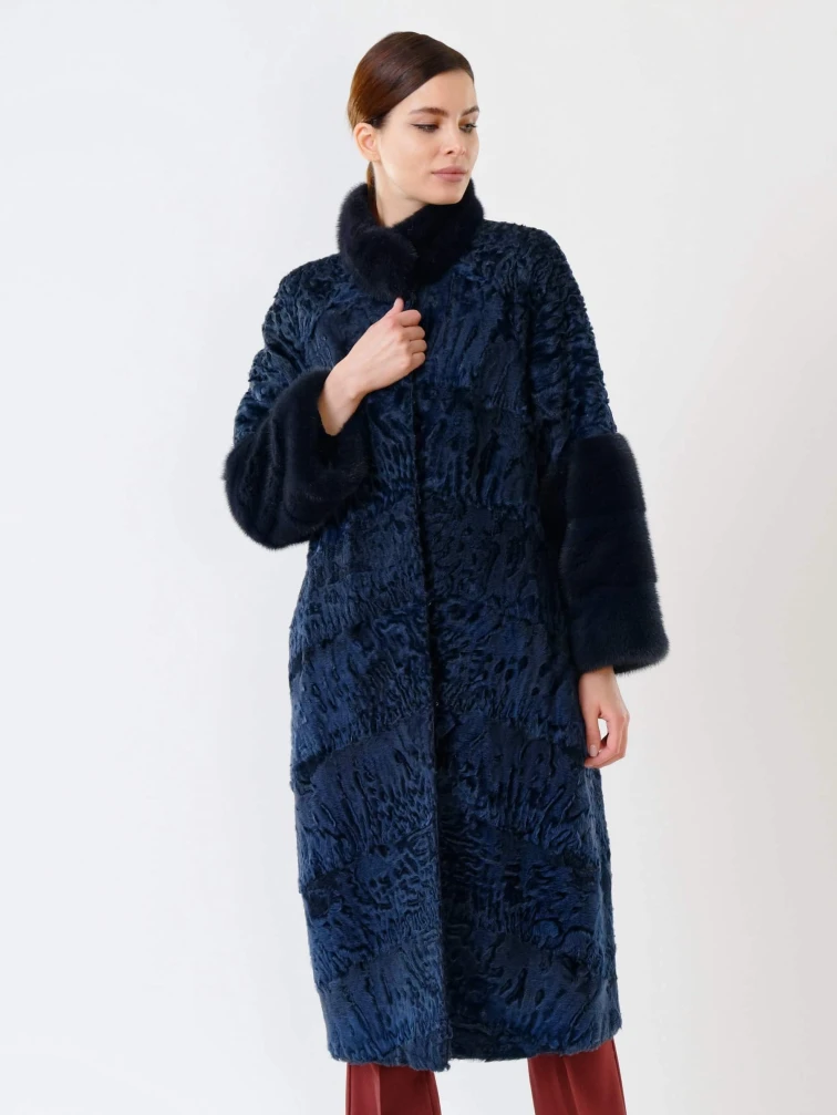 Товар женская шуба из меха каракуля с мехом норки 17101д(сн), синяя, размер 44, артикул 22580 выполнен из каракуль с застежкой клипсы. Рассчитан на сезон: осень-зима. Длина изделия свыше 90 см, силуэт прямой.