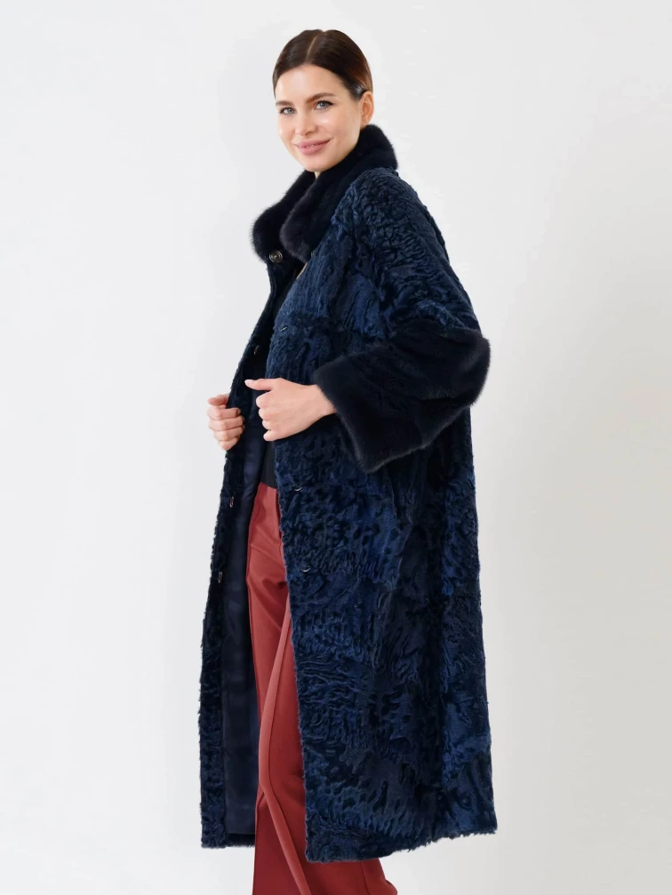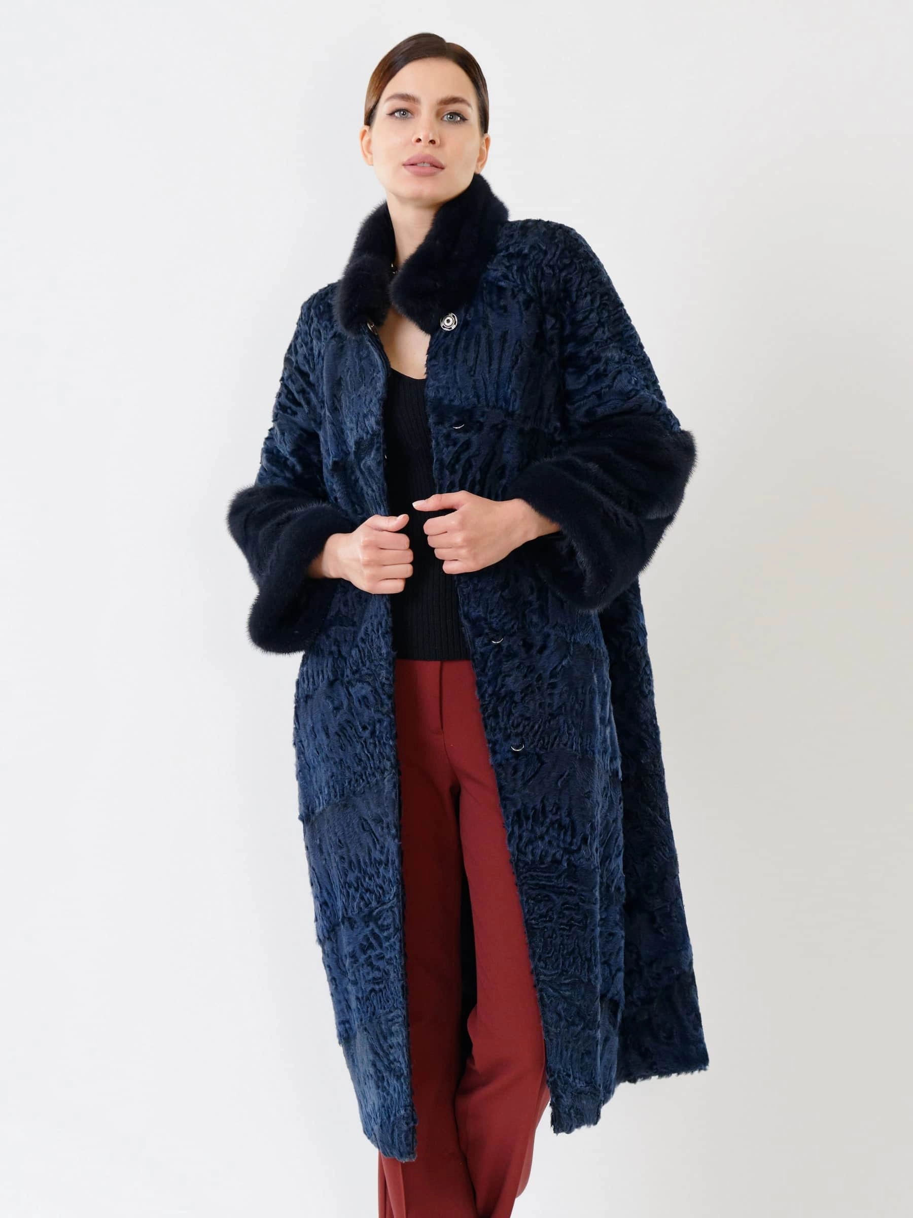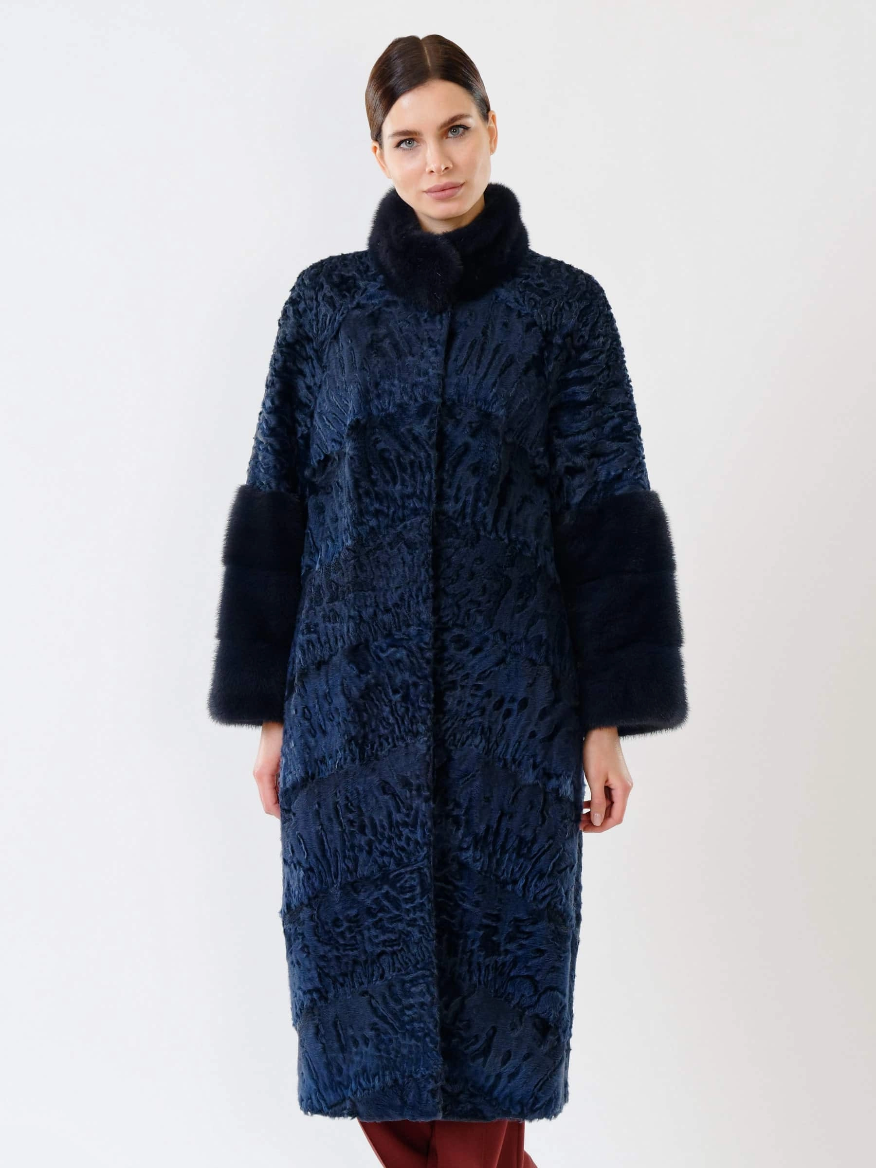 Женская шуба из меха каракуля с мехом норки 17101д(сн), синяя, размер 44, артикул 22580