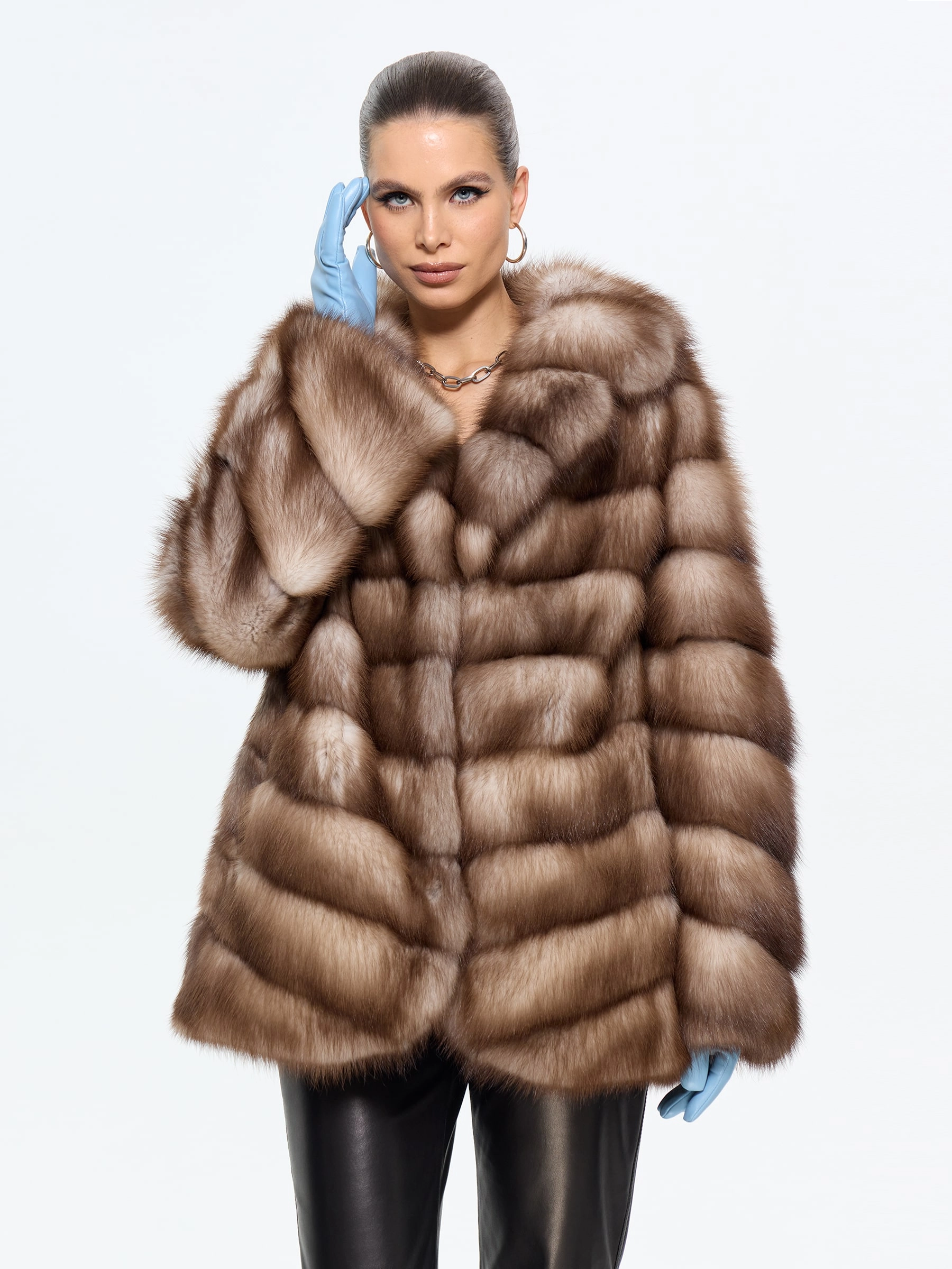 Элегантная шуба из меха куницы-каменки прямого силуэта длиной 70 см — это воплощение классического стиля и роскоши. Модель с изысканным английским воротником и втачными рукавами на удобных клипсах идеально сохраняет тепло и подчеркивает достоинства фигуры. Стилисты рекомендуют носить эту шубу из меха куницы с воротником, повязавшим шею шелковым платком, с кожаными перчатками и классическими сапогами-челси для безупречного городского образа.