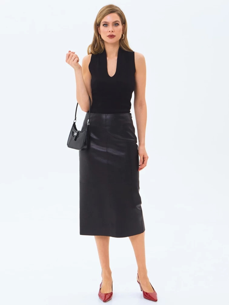 Юбка-карандаш из натуральной кожи глубокого черного цвета – must-have в гардеробе современной женщины. Боковая застежка и отсутствие пояса создают чистый силуэт, а высокая шлица обеспечивает удобство при ходьбе. Сочетайте с любым верхом – от простых хлопковых футболок до изысканных шелковых блуз – и получайте совершенно разные образы для любого случая. Качественная кожа гарантирует долговечность и безупречный внешний вид.